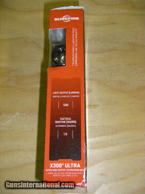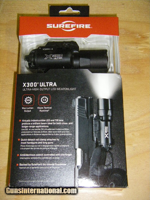 Description: SureFire X300 Ultra Weapon Light, Universal/Picatinny Rail Mount, Black New The powerful and versatile SureFire X300 Ultra WeaponLight for handguns and long guns features a high-performance LED that generates 500 lumens of stunning white light focused by a Total Internal Reflection (TIR) lens to produce a tight beam with extended reach and significant surround light for peripheral vision. The virtually indestructible and highly efficient LED generates tactical-level light—more than enough to overwhelm an aggressor's dark-adapted vision—for 1.5 hours per set of batteries. The X300 Ultra can be attached to a pistol or a long gun since its Rail-Lock® system permits rapid attachment to and removal from either Universal or Picatinny rails. Its high-strength aerospace aluminum body is Mil-Spec hard anodized for superior toughness and is O-ring and gasket sealed to make it weatherproof. Features