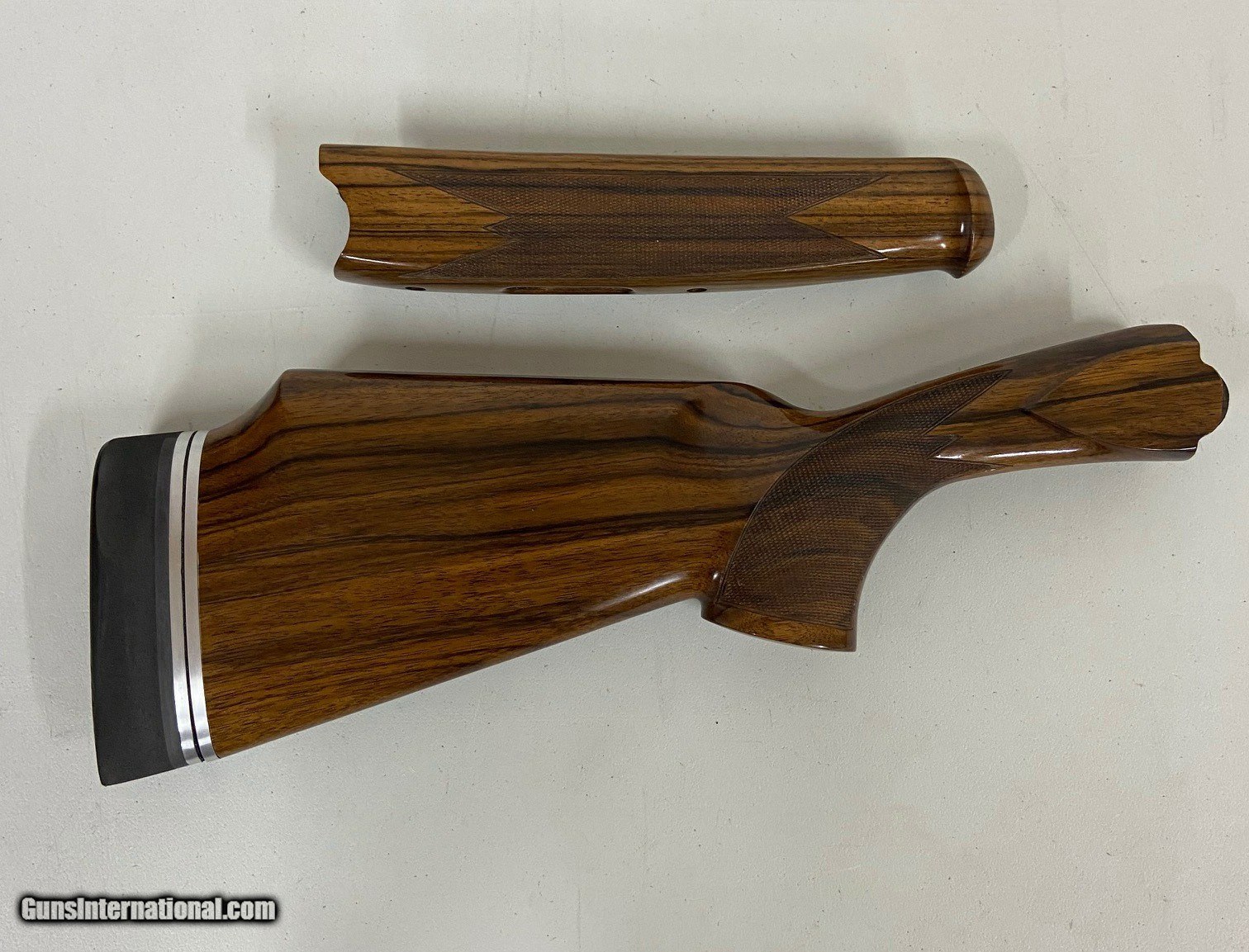 Description: Pristine condition Beretta 68x series 12 gauge Wenig New American right hand stock set. Standard Wenig New American dimensions with single point adjustable pad plate. Over $3200 new or to duplicate. Has gun nut machine screw inserts for pad plate. Includes stock bolt and forend rosettes. Mint as new condition. Additional pictures on request. Thanks for looking and good shooting, Rey SOLD |