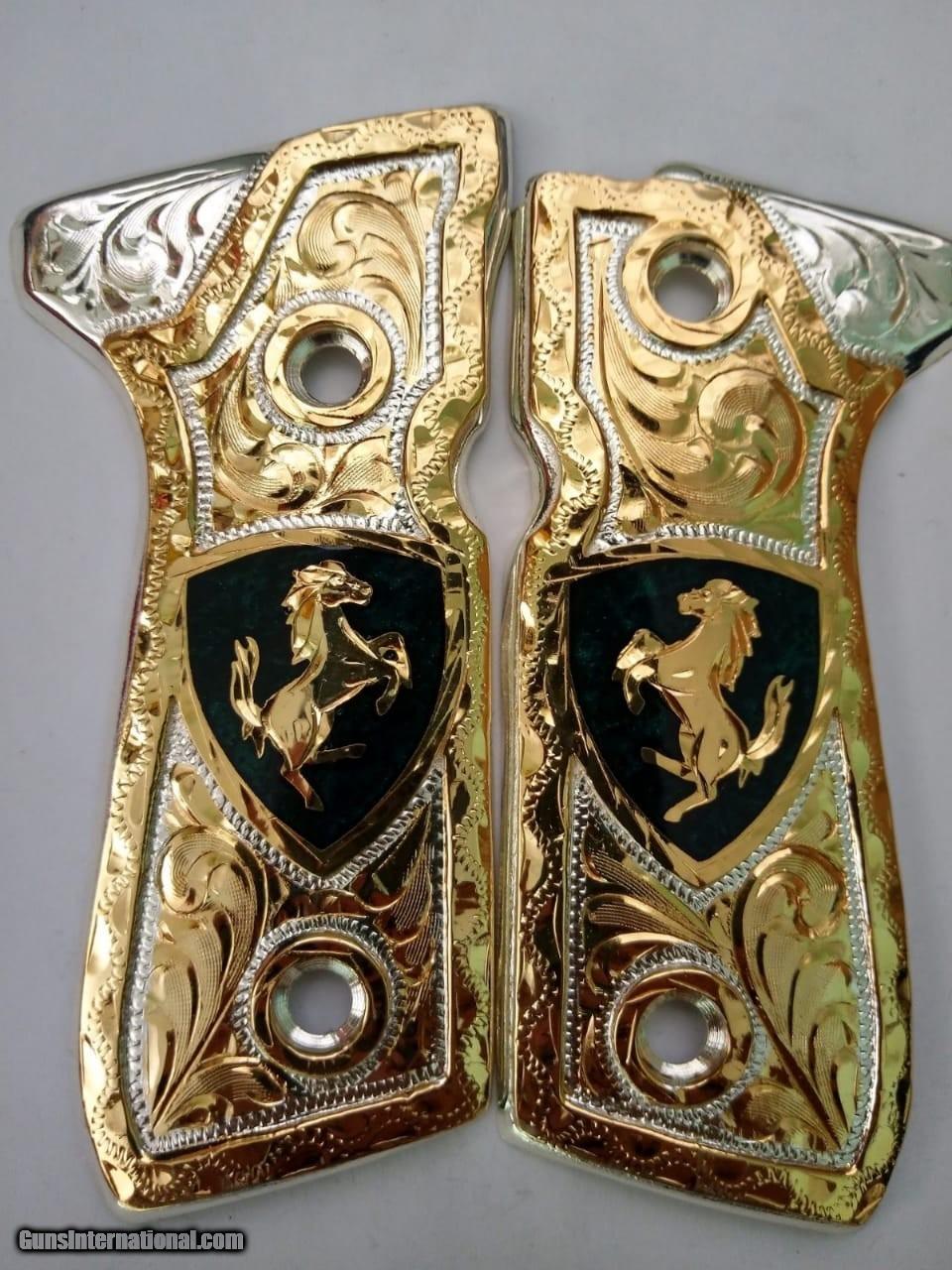 Description: 1911 guns grips hand made 24karat gold plated ,best quility grips/real stuff dark emerald color SOLD |