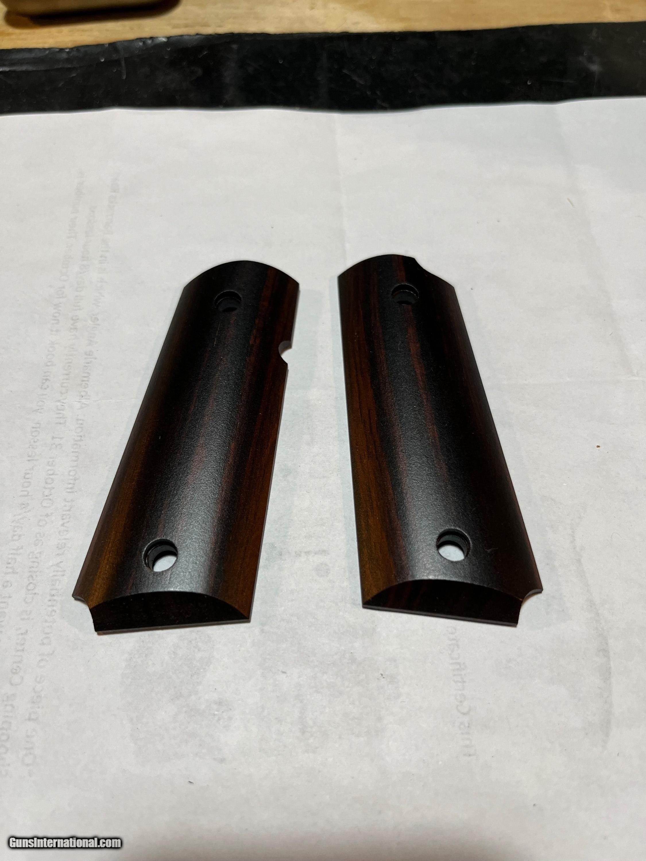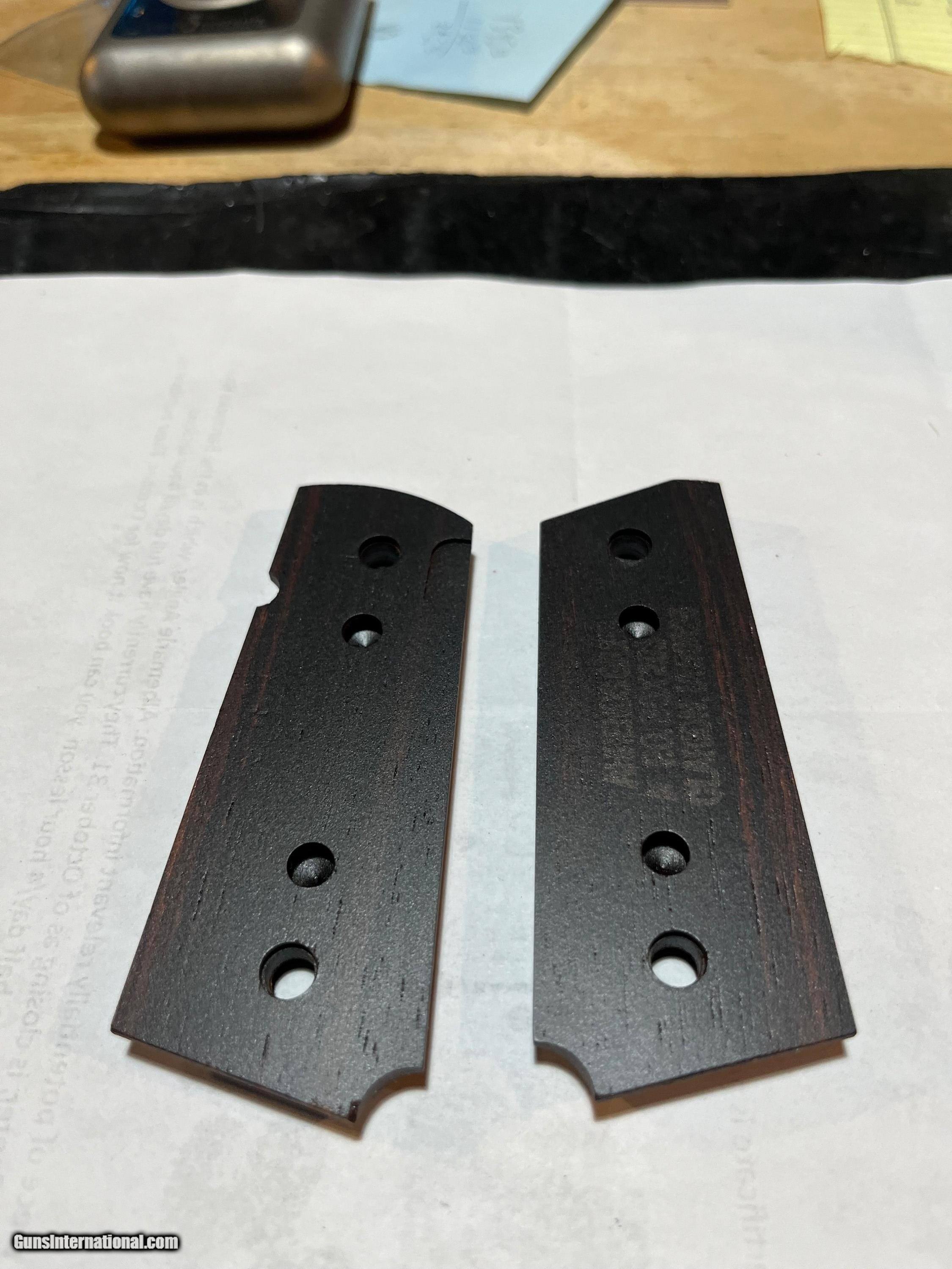 Description: Smooth combat grips by Ahrends of Clarion IA. These are in new condition and were made while cocobolo could still be used. They are very dark brown with subtle reddish streaks. They are for an Officers Model, not/not for a 1911 Govt or Commander. Price includes USPS Priority shipping. SOLD |