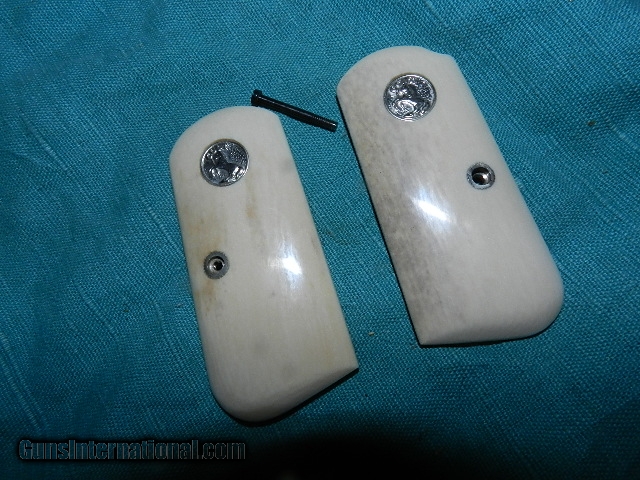 Description: A very good pair of pre-ban ivory grips that look like factory workmanship as they have the silver inset Colt medallions, and the black hard rubber backing blocks. The grips look like they may not have ever been on a gun as they are very clean with no wear. These grips have nice graining. We don’t have asite .I prefer money orders or a check. Item ships when funds come in. If you can only pay with a card let me know. I hope you like my wide selection of unusual guns, knives and gun parts. Shipping price determined by zip code. I try to keep the prices affordable, which means I make less money than most dealers. You won’t get altitude sickness with my prices! I consistently have the best selection of older guns If you BUY IT NOW you must still contact us for details buy it now doesn't end the sale, it just sends an email telling us you want to buy this gun. A phone call won’t secure a sale! Not home many times, the first buyer by email buys the gun !Thissite doesnot close down a sale when you do a BUY IT NOW like Ebay!I can get six buy it nows in an hour, first buyer to email gets the guns, others are in second place! Best to send another email . Sometimes not home to get calls. Some guns are required shipment to a gun dealer near you for a transfer to you when it arrives. With the widest selection of older guns at great prices, We don’t have a store, and sell on the internet only. SOLD |