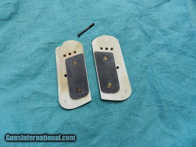 Description: Colt 1903 stage grips look they've never been on a gun, and they have the silver Colt Rampart Medallion. Condition is excellent and they have an original screw! Check my inventory for unusual grips and gun parts. Due to the high volume of emails, I can’t keep up with over 200 a day, please be patient, when corresponding thanks . We don’t have asite .I prefer money orders or a check. Item ships when funds come in. If you can only pay with a card let me know. I’m sorry I don’t list my phone number, did that for 30 days, never again.. I can’t talk on the phone all day…who will ship the guns? I’m just one person, and it’s very busy here! I do a brisk volume! I hope you like my wide selection of unusual guns, knives and gun parts. Shipping price determined by zip code. I try to keep the prices affordable, which means I make less money than most dealers. You won’t get altitude sickness with my prices! I consistently have the best selection of older guns If you BUY IT NOW you must still contact us for details buy it now doesn't end the sale, it just sends an email telling us you want to buy this gun. A phone call won’t secure a sale! Not home many times, the first buyer by email buys the gun !Thissite does not close down a sale when you do a BUY IT NOW like Ebay! I can get six buy it nows in an hour, first buyer to email gets the guns, others are in second place! Best to send another email . Sometimes not home to get calls. Some guns are required shipment to a gun dealer near you for a transfer to you when it arrives. With the widest selection of older guns at great prices, We don’t have a store, and sell on the internet only. SOLD |