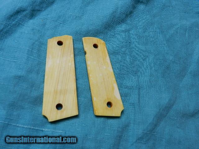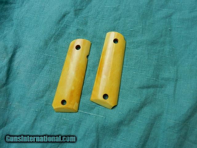 Description: Set of Colt 1911 aged ivory grips made many years ago, Has some aging, and good figural grain. Never been on a gun, came from custom shop employee estate.No cracks , chips or surface defects.Some oil staining on the back side.We don’t have asite .I prefer money orders or a check. Item ships when funds come in. If you can only pay with a card let me know. I’m sorry I don’t list my phone number, did that for 30 days, never again.. I can’t talk on the phone all day…who will ship the guns? I’m just one person, and it’s very bust here! I do a brisk volume! I hope you like my wide selection of unusual guns, knives and gun parts. Shipping price determined by zip code. I try to keep the prices affordable, which means I make less money than most dealers. You won’t get altitude sickness with my prices! I consistently have the best selection of older guns If you BUY IT NOW you must still contact us for details buy it now doesn't end the sale, it just sends an email telling us you want to buy this gun. A phone call won’t secure a sale! Not home many times, the first buyer by email buys the gun !Thissite doesnot close down a sale when you do a BUY IT NOW like Ebay!I can get six buy it nows in an hour, first buyer to email gets the guns, others are in second place! Best to send another email . Sometimes not home to get calls. Some guns are required shipment to a gun dealer near you for a transfer to you when it arrives. With the widest selection of older guns at great prices, We don’t have a store, and sell on the internet only. SOLD |
