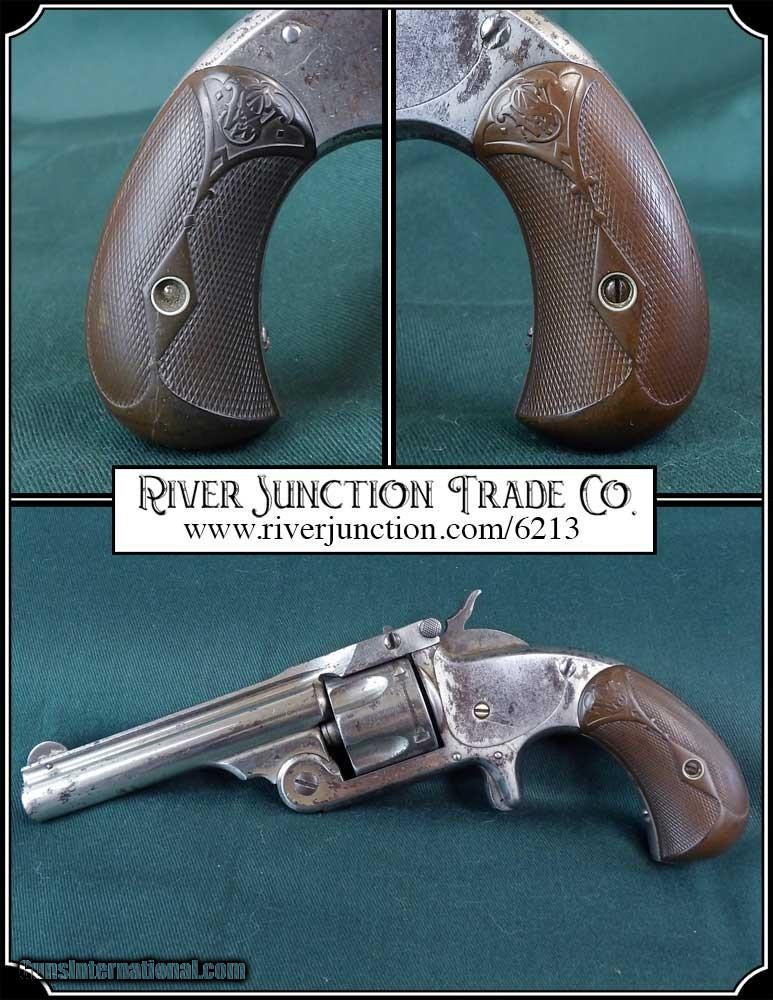 Description: These grips fit a Smith & Wesson Model 1 1/2 Single Action Revolver in 32 S&W centerfire. They are Gutta Percha originals, real deal, Smith grips. They fit my gun perfectly and I am sure they will do the same on yours. They show some light wear. They show what looks like a crack on the right grip but there is no gap in the material and no movement what so ever. They could easily give another century of service and likely have many tails to tell. The browning of the Gutta Percha will look right on your pocket pistola. Payment: Item, can be ordered on line with a credit card or paypal on our sight. Just Google (riverjunction) and type in the River Junction Trade Co. item number (6213) in the search box. Before you checkout you will see shipping cost and total. OR If you prefer: Pay by cash, postal money order, cashiers check, personal & business checks. We wait for checks to clear. We always answer questions and entertain offers. Have questions? Call me 563-880-4588. Jim SOLD |