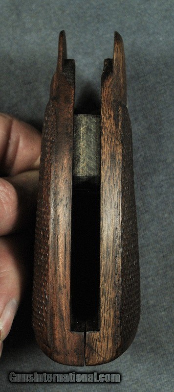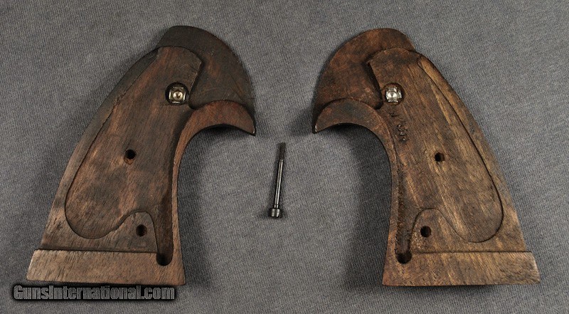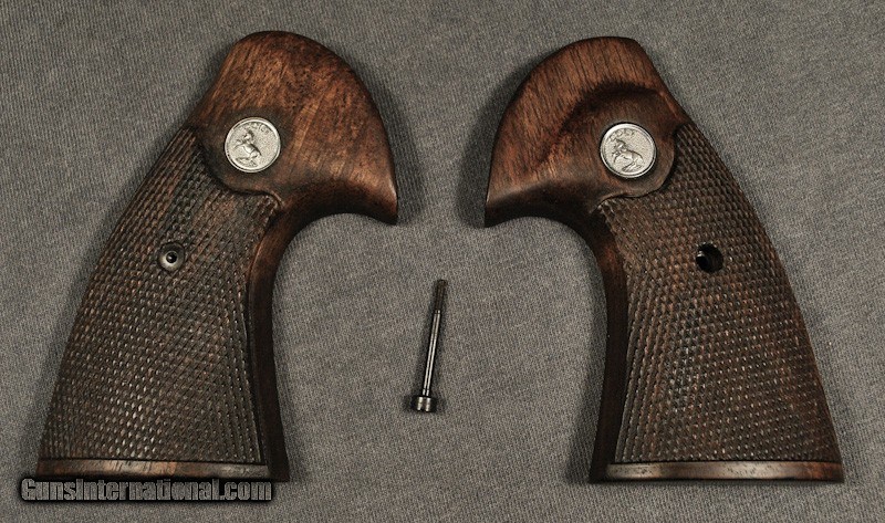 These original Colt factory 2nd generation walnut target grips with silver medallions are correct for the Officers Model Match, Trooper, and 3-5-7 Model produced from mid-1960 to 1974. They will fit all Colt E/I-frame revolvers: the New Army and New Navy, all Army Specials, all Officers Models, all original Official Police, the Commando, all original Troopers, all 3-5-7 Models, and the Python. Very good condition. Original screw is included.