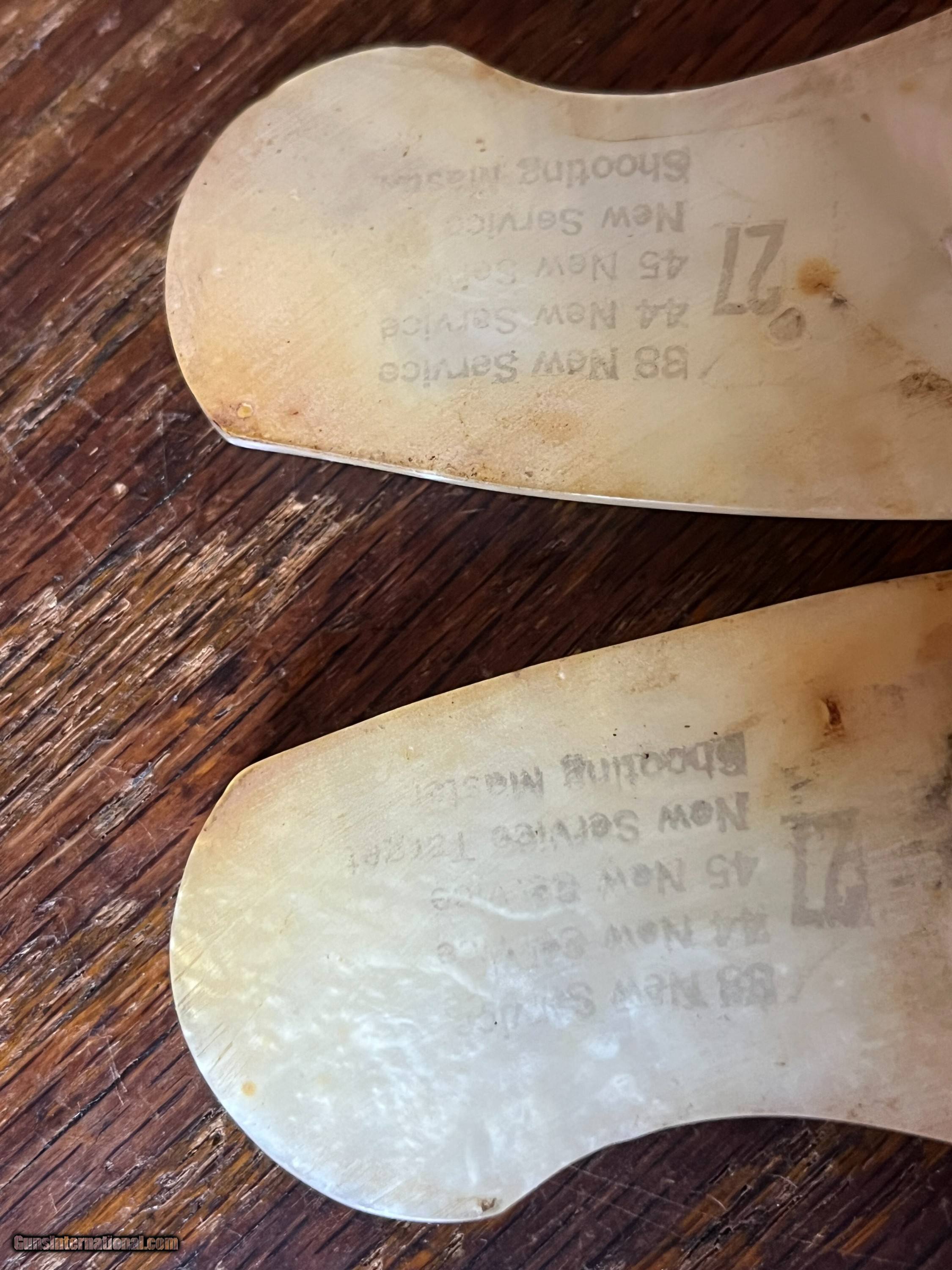 Description: MOP grips for Colt. Marked on back New Service 38,44,45 and Shooting Master SOLD |