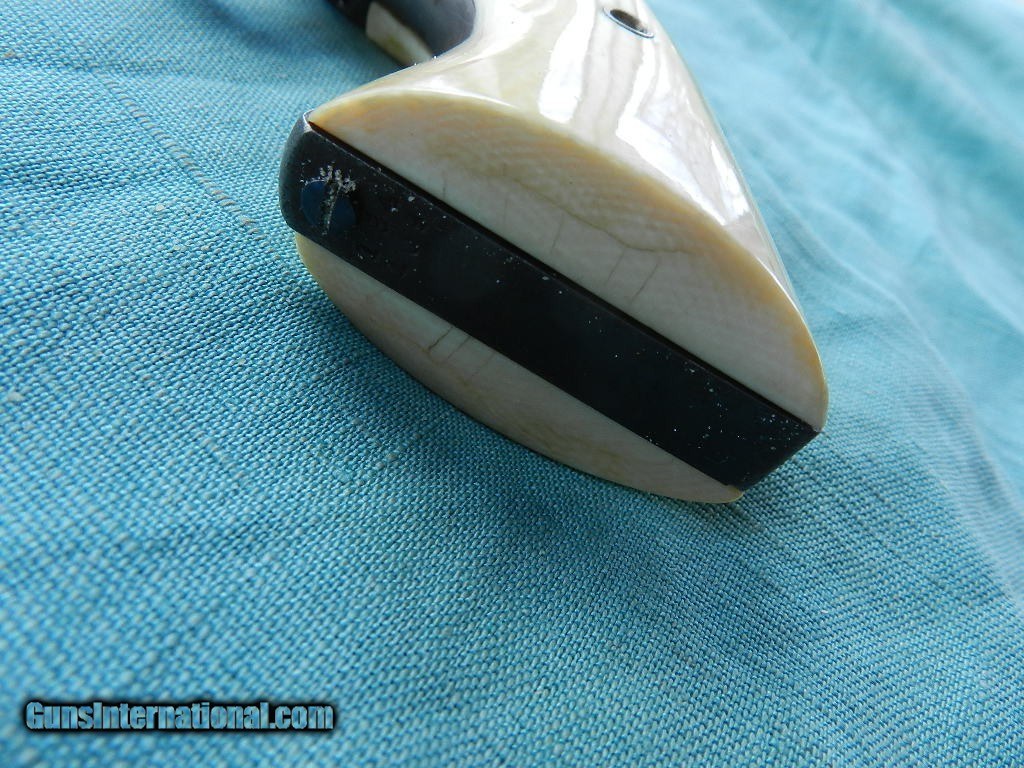 Description: SOLD A great set of Colt SAA pre-ban aged ivory grips with Colt German Silver medallions. I live 14 miles from the Colt Blue Dome, and get these from former employees of Colt.Gun pictured nor included, not for sale! Comes with it's screw. However grips fitted to a gun were made for that gun, and any single action revolver with separate trigger guard and back strap had their grips fitted to them before assembly and finishing, so each gun may have some variation in that combination of three separate parts being assembled together .When buying a gun always have it examined by a competent gunsmith before shooting. To buy a gun from me you must get a direct email for me, with details, and shipping cost. We don’t have a web site .I prefer money orders or a check. Item ships when funds come in. I try to keep guns affordable, which means I make less money than most dealers. You won’t get altitude sickness, or nose bleed, with my prices! I consistently have the best selection of older guns If you attempt to buy, you must still contact us for details . Best to email to buy. Sometimes a local person can stop buy and purchase before the gun is removed. Sometimes not home to get calls. Some guns are required shipment to a gun dealer near you for a transfer to you when it arrives. Otherwise many older or black powder guns ship to your door. With the widest selection of older guns at great prices, We don’t have a store, and sell on the internet only. I’m easy to get along with. Thank You. SOLD |