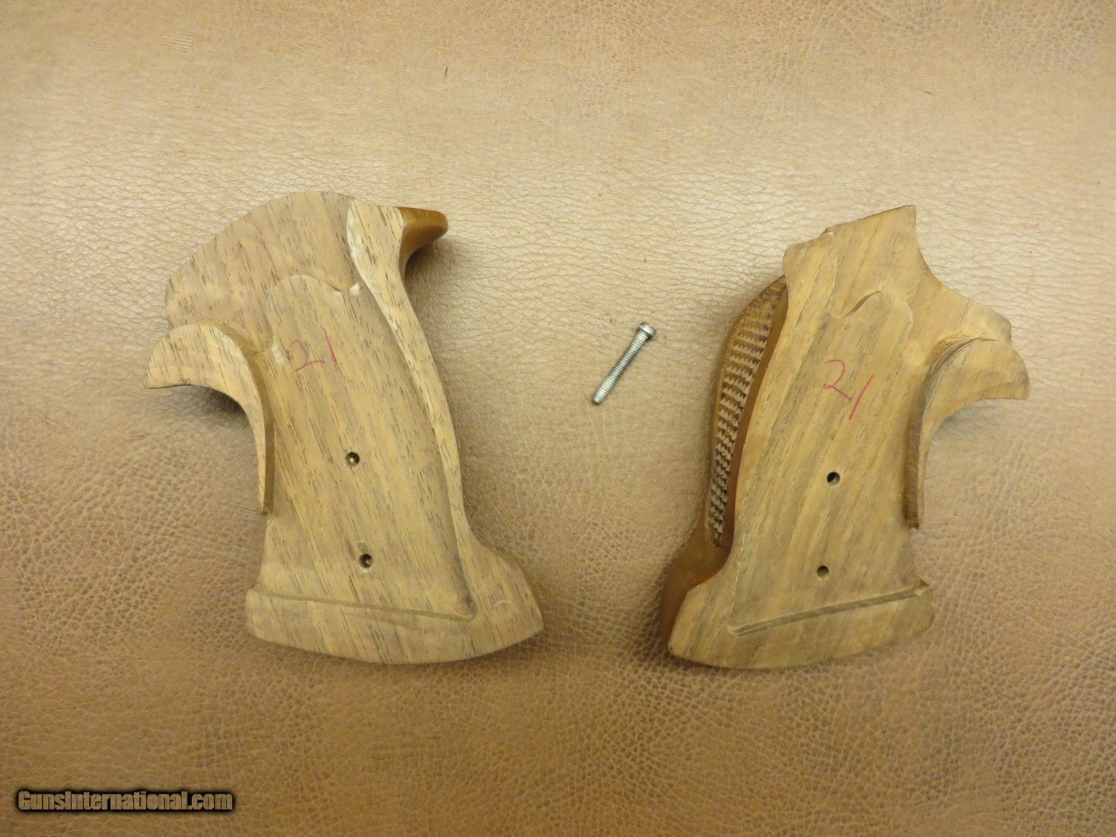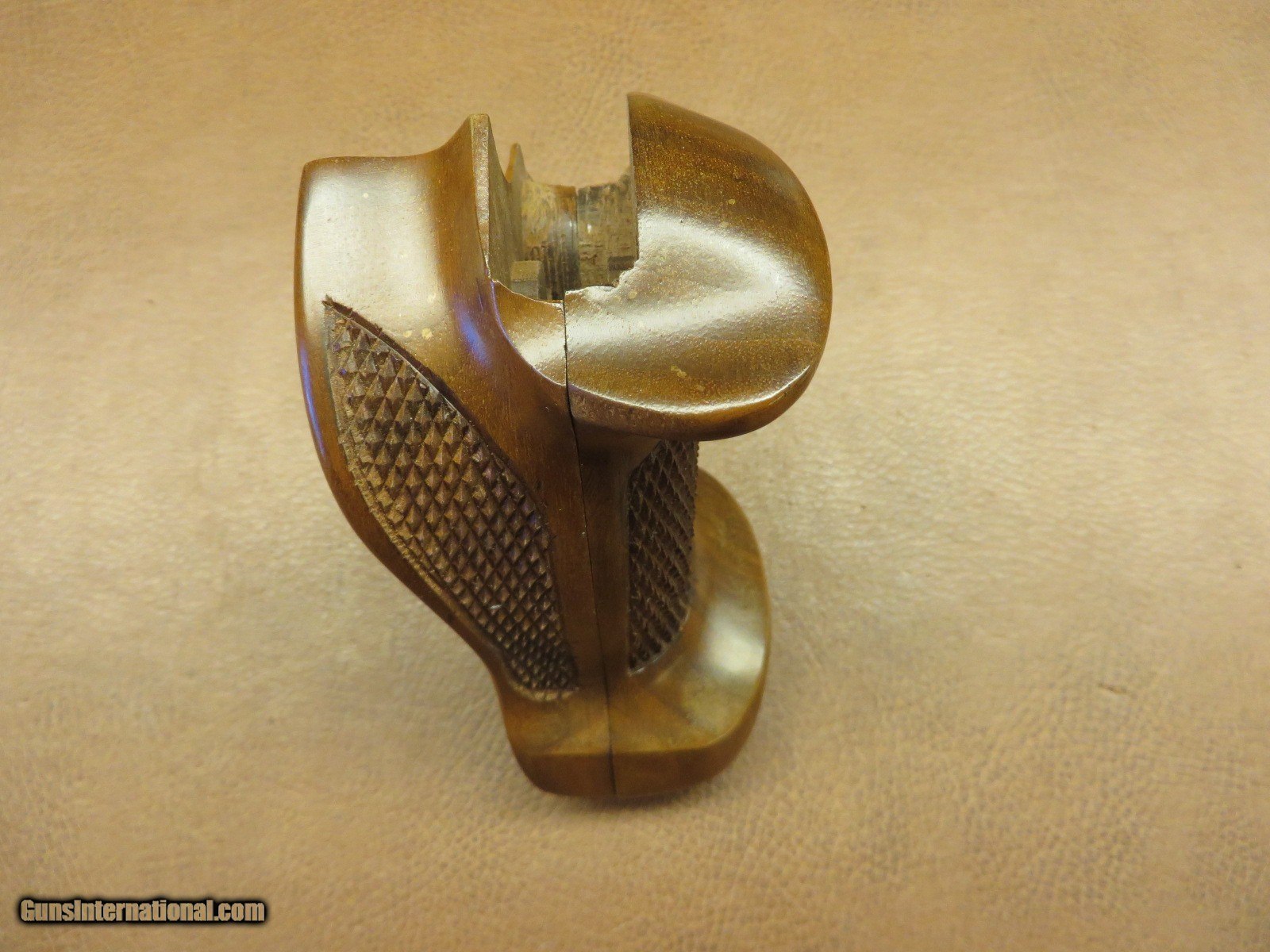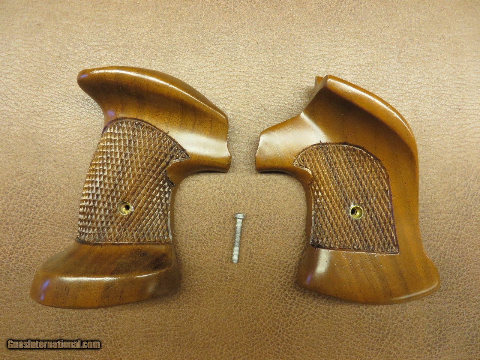 Description: Checkered walnut target grips with thumbrest and palm rest. For small size hand. Excellent condition in original box. SOLD |