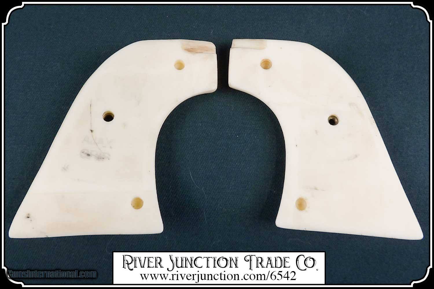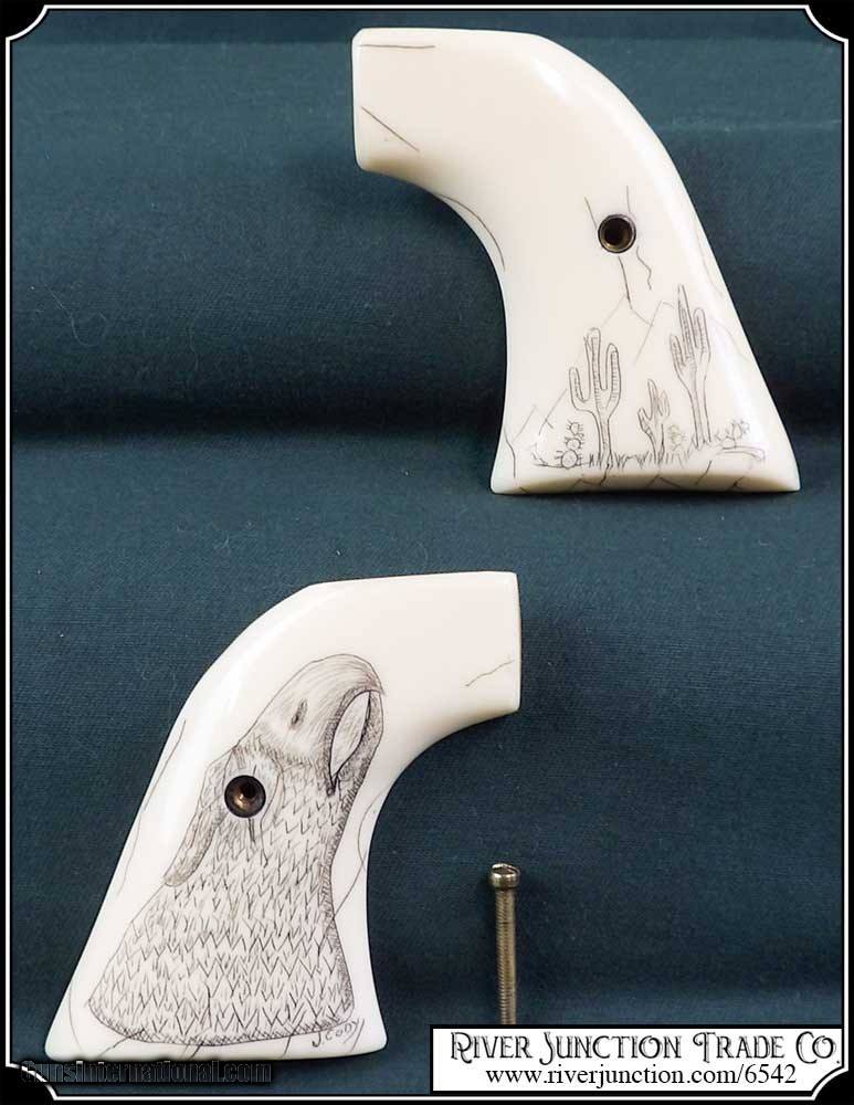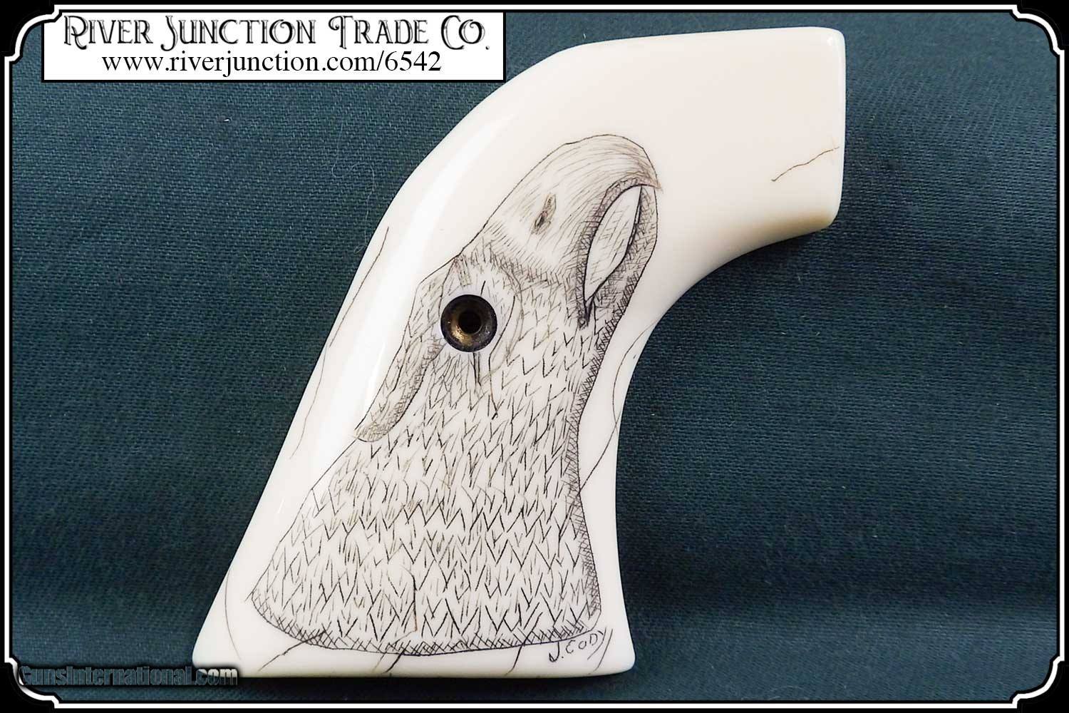 Description: This original design by John Cody Scrimshaw Artist. Perfect detail and great design, these grips will dress up your Ruger very well. The iconic Eagle Head is crafted with exquisite detail, from the feathers to the headdress. Made of polyurethane Ivory to get the finished color and antique look. The Grips are made to get a perfect fit. Can be fit to both OLD and (XR3 grip frame) and a perfect fit on the Ruger Wrangler. Payment: Item, can be ordered on line with a credit card or paypal on our sight. Just Google (riverjunction) and type in the River Junction Trade Co. item number (6542) in the search box. Before you checkout you will see shipping cost and total. OR If you prefer: Pay by cash, postal money order, cashiers check, personal & business checks. We wait for checks to clear. We always answer questions and entertain offers. Have questions? Call me 563-880-4588. Jim SOLD |