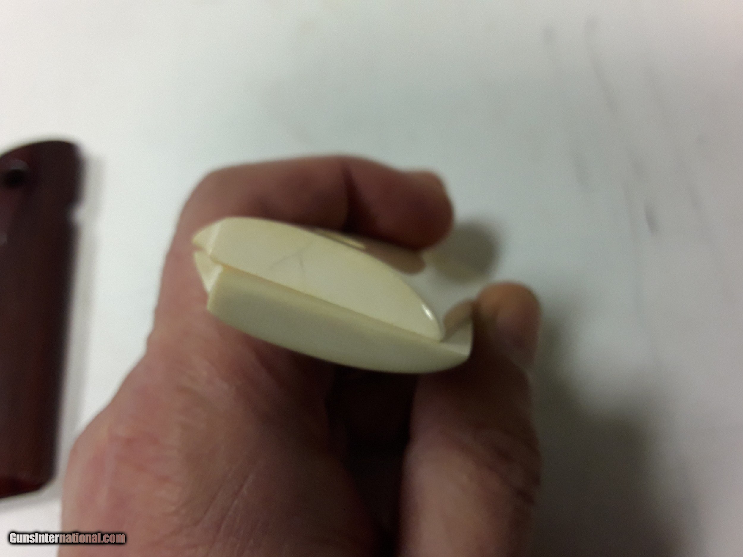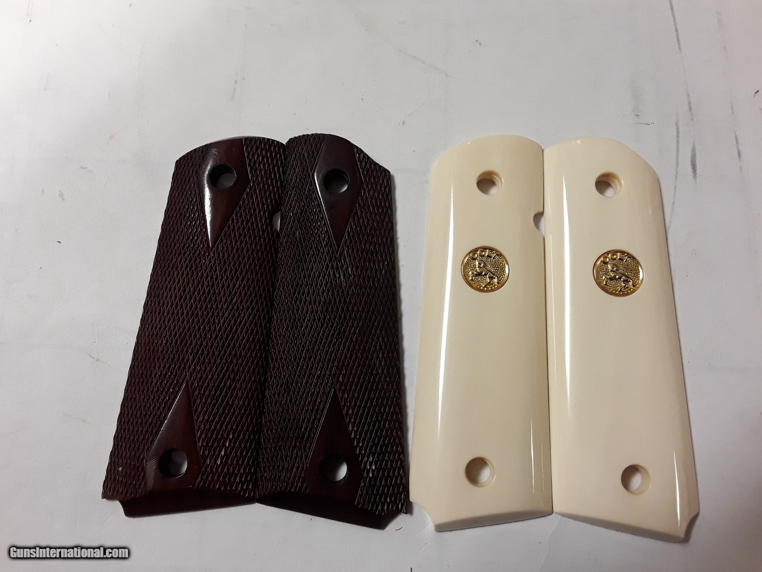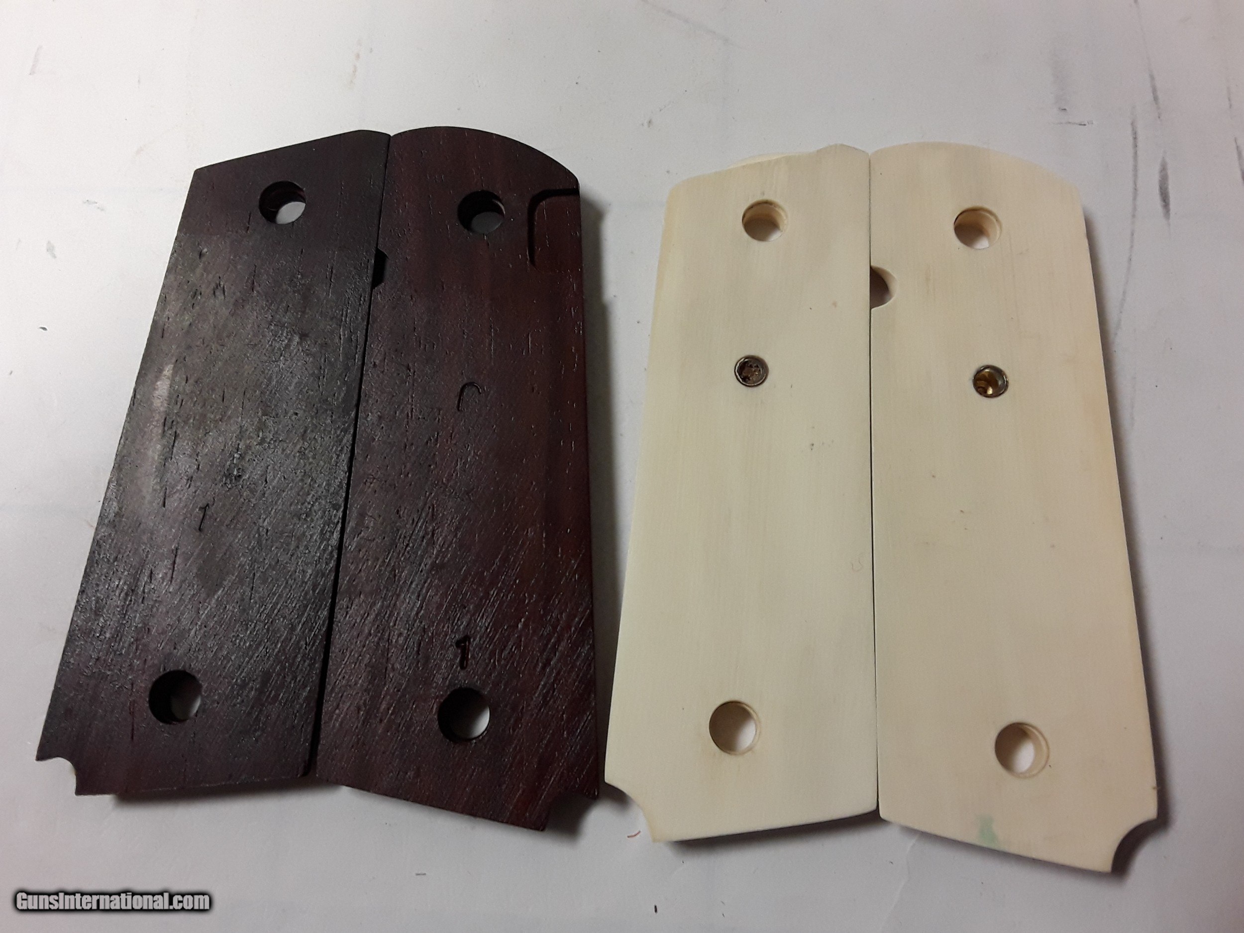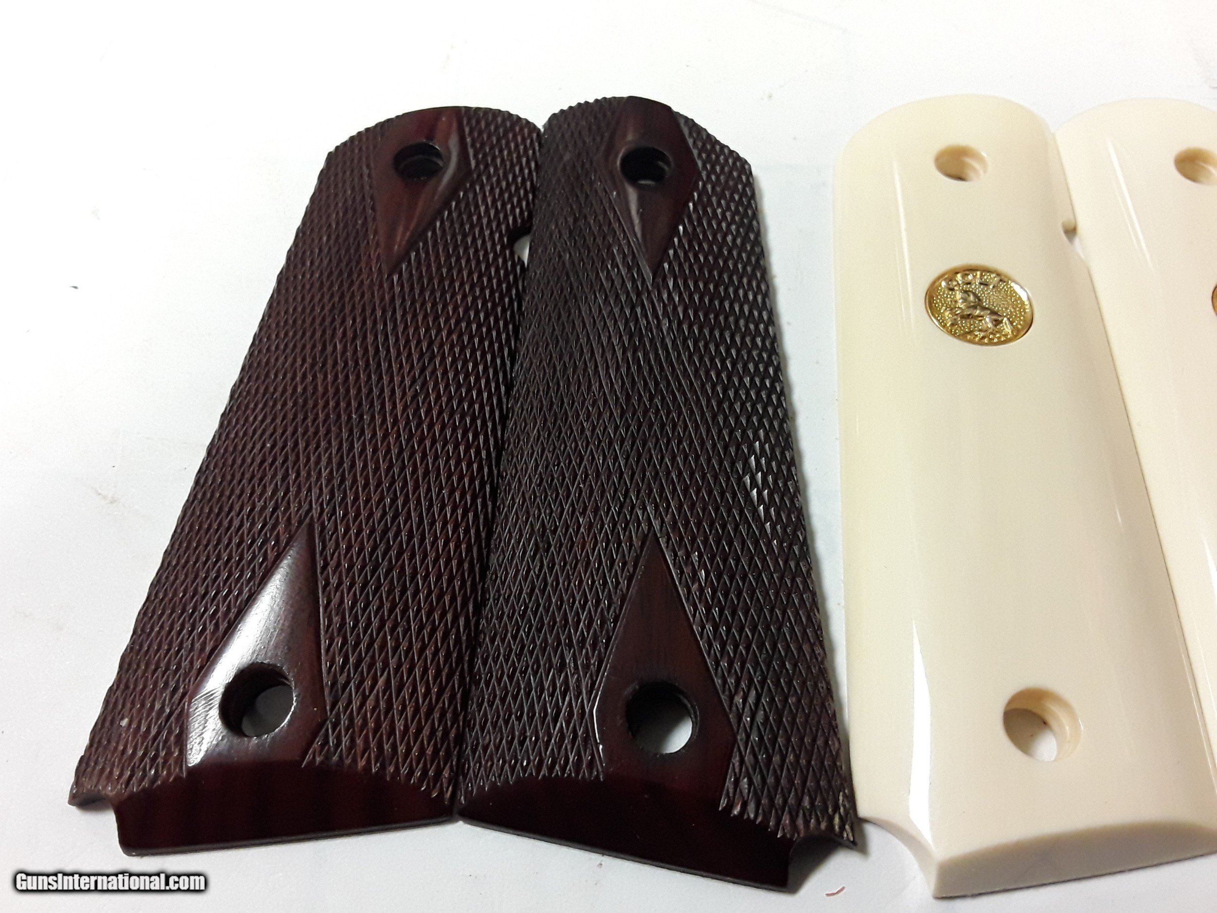 Description: COLT 1911 FULL SIZE GRIPS IVORY MEDALLIONS/DIAMOND ROSEWOOD SLIGHT CRACK ON ONE FAKE IVORY BASE $100.00 DELIVERED FOR BOTH PAIRS SOLD |