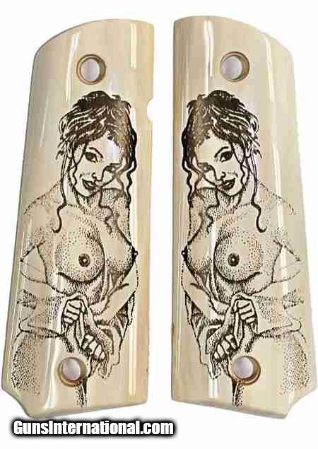 Description: COLT 1911 US GOV'T MODEL .45 AUTO ALSO FITS COLT COMMANDER & CLONES REAL IVORY GRIPS (Pre-Ban). LASER ENGRAVED NAKED LADY ON BOTH PANELS SMOOTH, SLOPE BOTTOM. NO FITTING REQUIRED. Genuine Elephant Ivory Grips With Beautiful Grains & Color Variations. Grips may differ slightly from ones pictured. Shipping in U.S.: $20.00. No International Sales on Real Ivory. Please email for questions or payment options. 6/6/2016: Important Announcement For Our Real Elephant Ivory Customers: Effective 7/6/2016, New U.S. Fish & Wildlife Law Takes Effect: No Interstate Sales of Real Elephant Ivory Grips. Any Elephant Ivory Grips Ordered & Paid for Prior to July 5st, Will Be Made, Delivered & Shipped. They Will No Longer Be Available, Except For N.C. Customers/Residents After That Time. IF YOU WANT TO BUY ELEPHANT IVORY GRIPS, ACT NOW! SOLD |