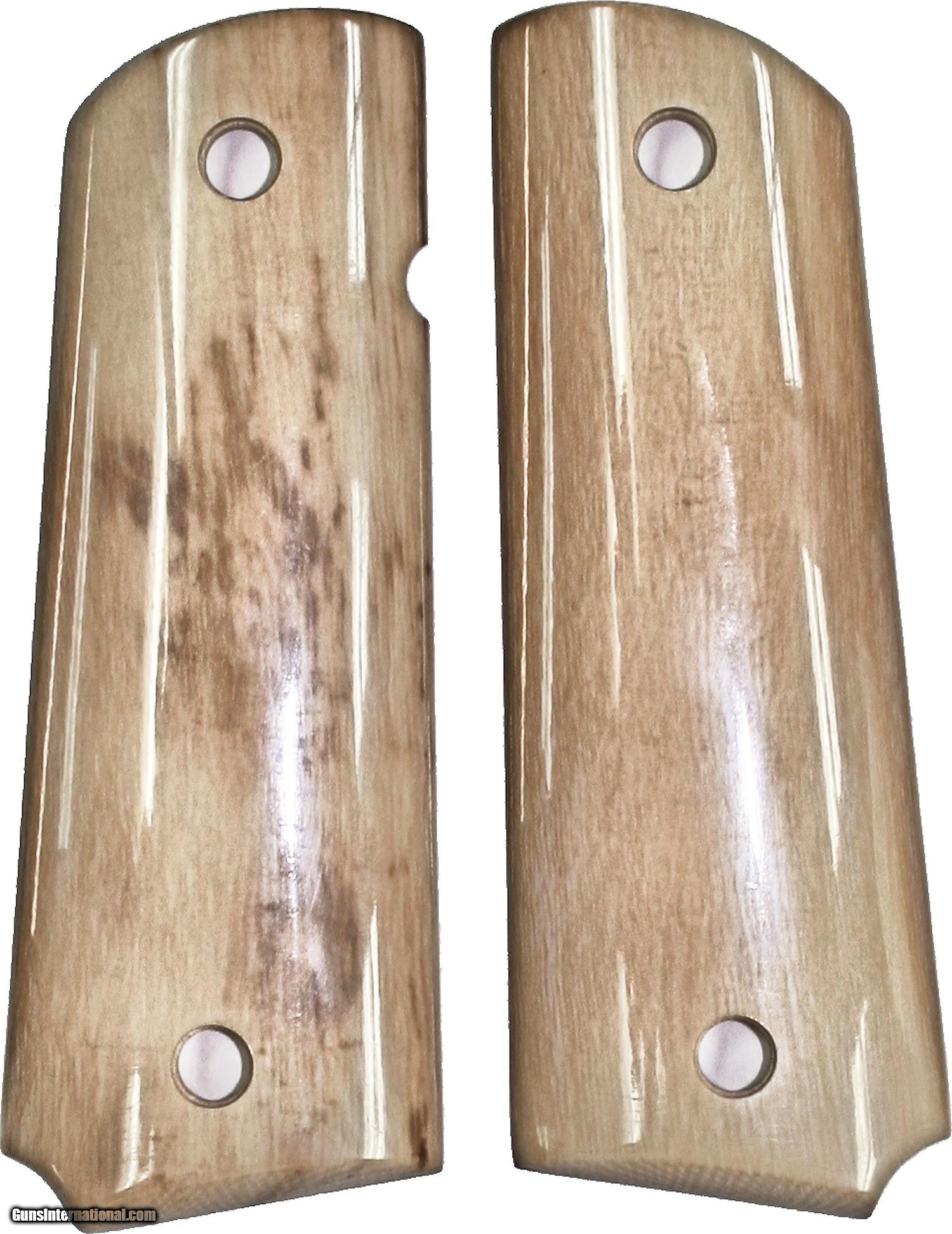 Description: COLT 1911 US GOV'T MODEL .45 AUTO GRIPS ALSO FITS COLT COMMANDER, COLT 1991A AUTO & CLONES REAL SIBERIAN MAMMOTH IVORY GRIPS The Rare Siberian Mastodon Ivory Is Over 10,000 Years Old. It Is Known For Subtle Colors Of Brown, Blue Or Green. Beautiful Grains & Color Variations. NO TWO PAIR ARE THE SAME All NC Ordnance Grips Have Been Stabilized. There Are No Restrictions On Sales Or Exports of Mastodon Grips. ALL COLT GRIPS ARE AVAILABLE WITH GOLD OR SILVER COLT MEDALLIONS INSTALLED FOR $35.00 MORE. Shipping in U.S.: $10.00. International Shipping: $20.00, Countries Limited. Please email for questions or payment options. SOLD |