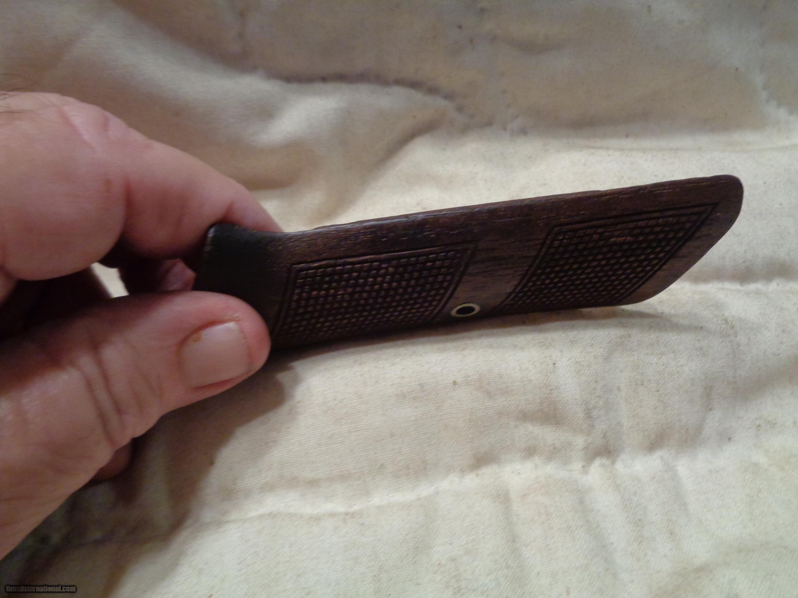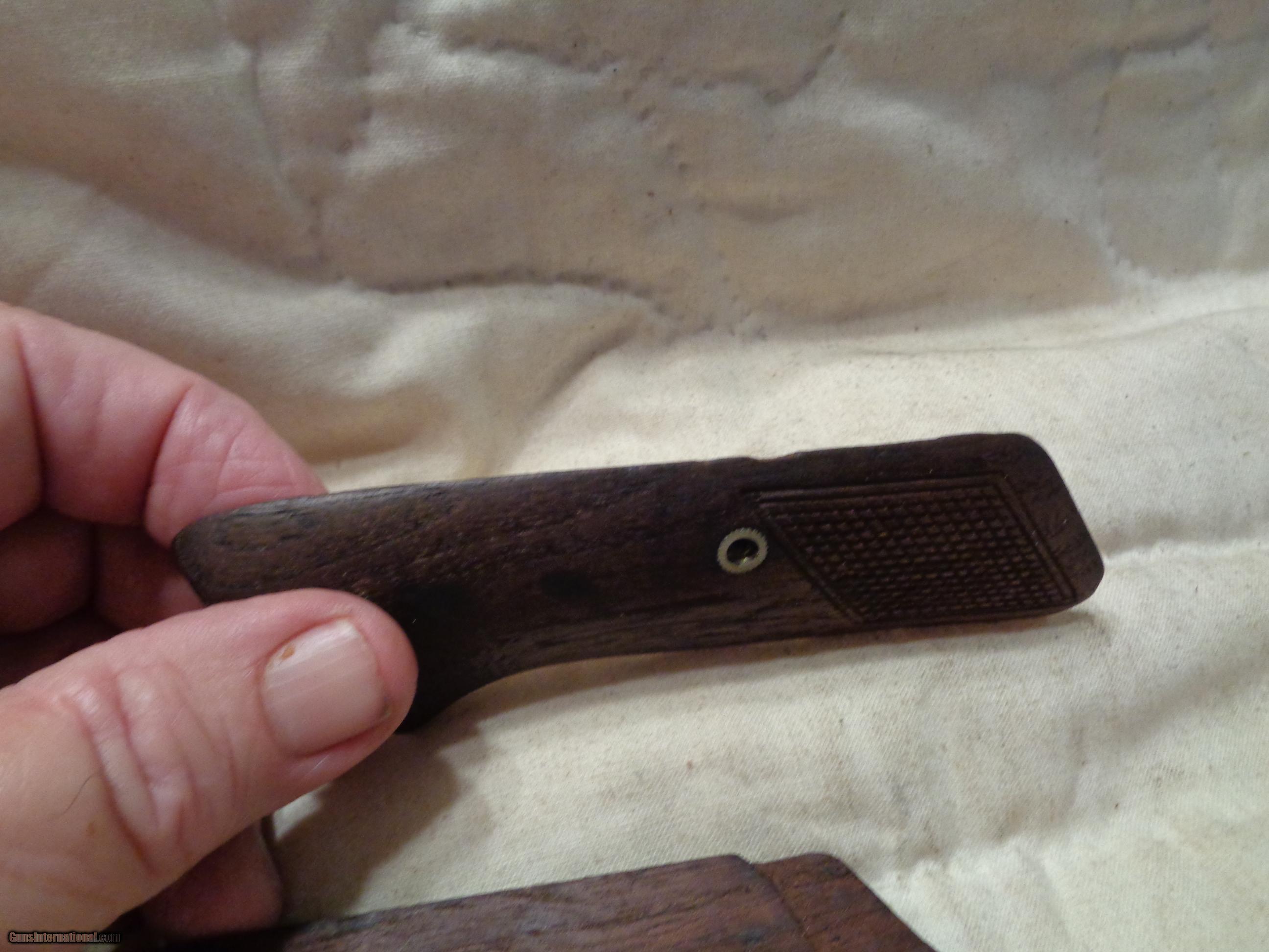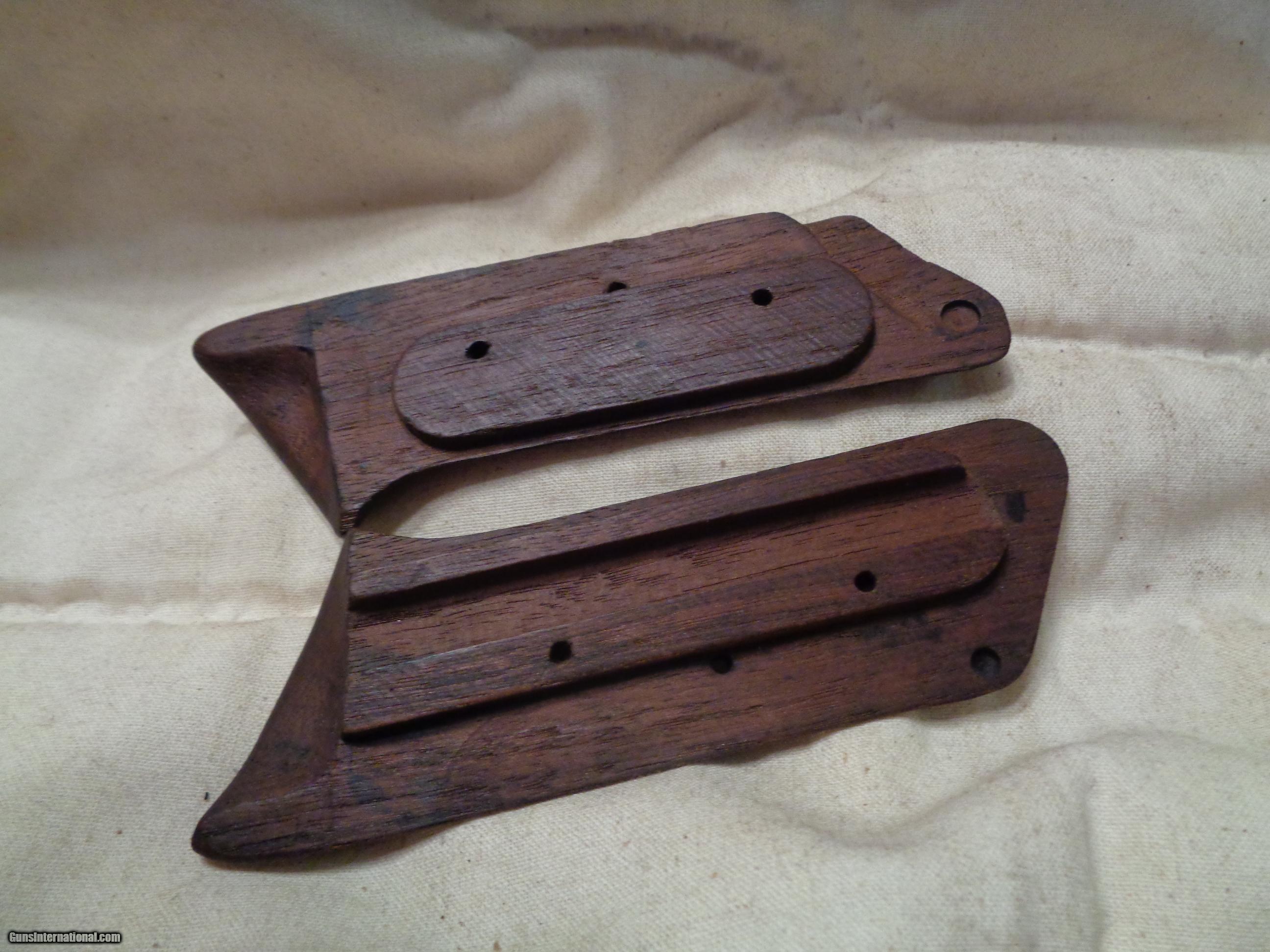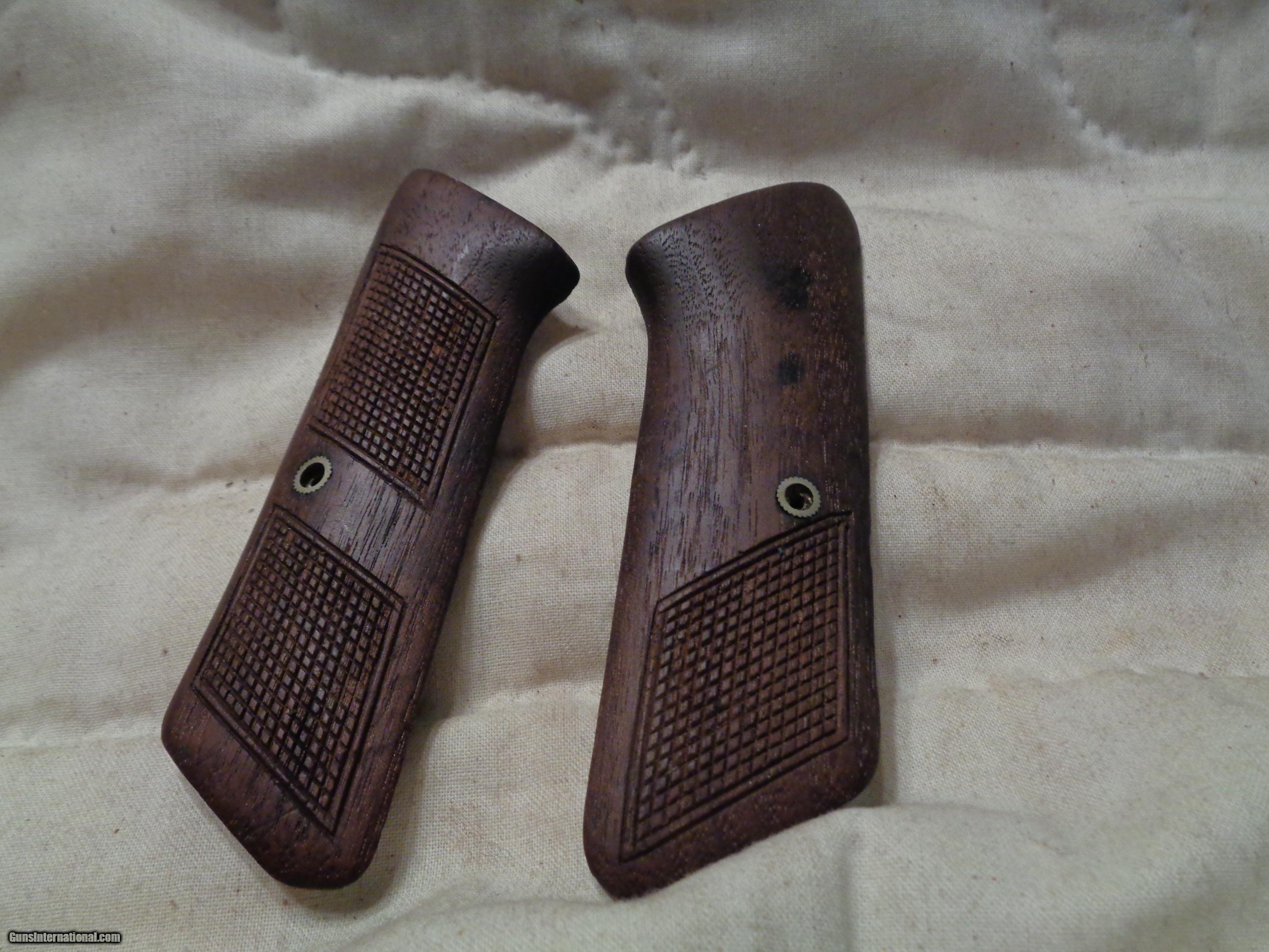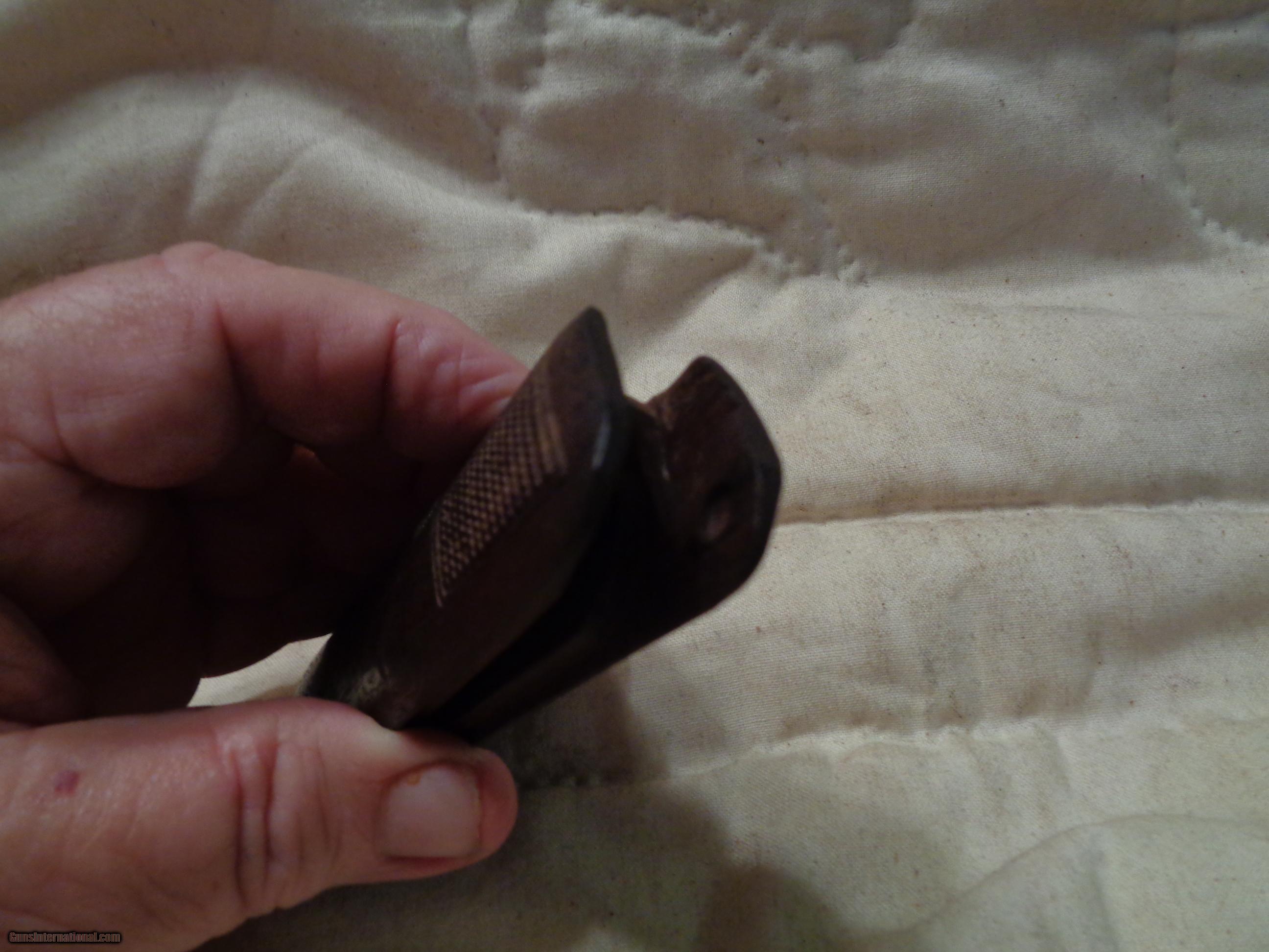 Description: THESE ARE EARLY COLT WOODSMAN, WALNUT IN V. GOOD USED CONDITION. GRIPS ARE CHECKERED, BUT NOT SURE IT'S ORIG. CHECKERING BUT WELL DONE. NO SPLITS, CHIPS OR MISSING WOOD. RIGHT GRIP HAS A VERY SMALL BRUISE AT REAR, APPX. 1/32", BUT TOO SMALL TO DETRACT. QUESTIONS? CALL ROB 336 309 0497 ANYTIME SOLD |