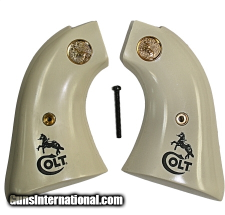 Description: COLT SCOUT & FRONTIER. CLASSIC IVORY-LIKE™ REPRODUCTION GRIPS. LASER ENGRAVED WITH COLT MEDALLIONS. Special Sale on Colt Logo Laser Engraved Grips. APRIL 1, 2015 to June 21, 2015 Price Reduced $20, From $100 to $80. No Longer Available After June Free Shipping in U.S. International Shipping: $15.00, Countries Limited. Please email for questions or payment options. SOLD |