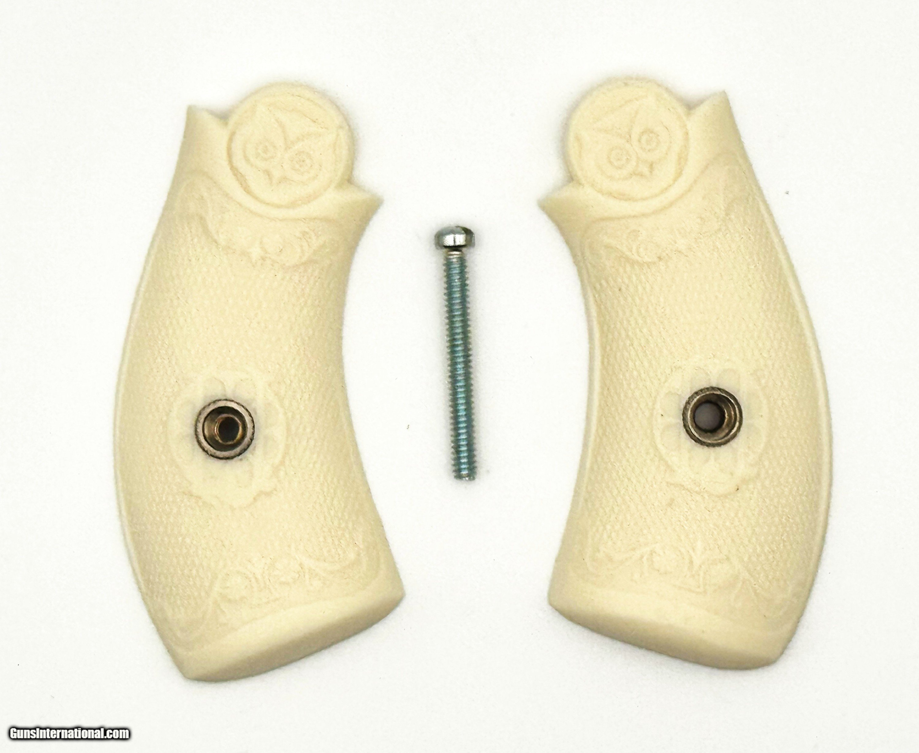 Description: Iver Johnson .32 Top Break Revolver Grips 3rd Model, 5 Shot Also Fits Iver Johnson 7 Shot Top Break .22 Revolver With Screw Set Installed Owls Looking Down IVORY-LIKE™ Reproduction Grips Like Originals, Only in Ivory, Not Black Ivory-Like Grips Are Made of an Engineered Urethane That is Perfect For Reproducing Beautiful Grips. Will not chip or shrink! MADE IN THE USA Shipping in U.S.: $7.00. International Shipping: $20.00, Countries Limited. Please email for questions or payment options. Price: $35.00 Contact Seller |