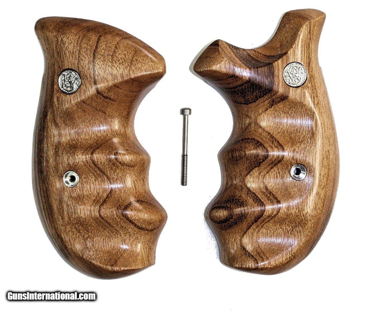 Description: Smith & Wesson K & L Frame Revolver Grips Smooth Goncalo Alves Combat Grips Round Butt Fits Models 10, 12, 13, 15, 17, 18, 19, 48, 64, 65, 66, 67, 581, 586, 617, 681,& 686 BEAUTIFULLY CRAFTED REPRODUCTION GRIPS Made in England NO TWO PAIR ARE THE SAME These Grips Are Numbered to Ensure that You Will Get the Specific Pair Shown in the Photo. The Photos Showing the Fit on the Firearm Are of one Pair Only. The Photo of the Front of the Grips Is the Individual Pair You Order. Deep Finger Grooves & Smooth Slim Design Are Made For Concealed Carry Fast Draw Smith & Wesson Medallions Three Coats of Hand Rubbed Tru Oil Finish GONCALO ALVES is a very hard, dense & fancy tropical wood with incredible grain. The wood has beautiful colors that range from red to yellow & orange. Goncalo Alves has an unusual variegated figure. Goncalo Alves may show reds, oranges & yellows, along with black figuring. The diverse colors & bright contrast make Goncalo one of the most sought-after woods in the world. These Woods Are Becoming Scarce Or Difficult To Obtain No International Sales On This Item Featured in American Handgunner Magazine Shipping in U.S.: $7.00. No International Sales. Please email for questions or payment options. SOLD |