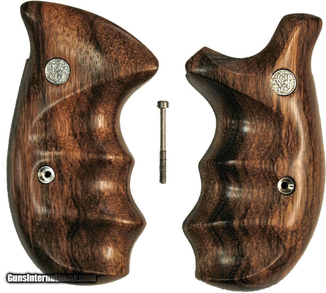 Description: Smith & Wesson N Frame Revolver Grips Smooth Goncalo Alves Combat Grips Round Butt Fits Models 25, 27, 28, 29, 57, 58, 624, 627, 629, 657 BEAUTIFULLY CRAFTED REPRODUCTION GRIPS Made in England NO TWO PAIR ARE THE SAME These Grips Are Numbered to Ensure that You Will Get the Specific Pair Shown in the Photo. The Photo on the Firearm is Not This Pair. It is from a Similar Pair Sold to One of Our Great Customers. It Shows the Fit Very Well. Deep Finger Grooves & Smooth Slim Design Are Made For Concealed Carry Fast Draw Smith & Wesson Medallions Three Coats of Hand Rubbed Tru Oil Finish GONCALO ALVES is a very hard, dense & fancy tropical wood with incredible grain. The wood has beautiful colors that range from red to yellow & orange. Goncalo Alves has an unusual variegated figure. Goncalo Alves may show reds, oranges & yellows, along with black figuring. The diverse colors & bright contrast make Goncalo one of the most sought-after woods in the world. These Woods Are Becoming Scarce Or Difficult To Obtain No International Sales On This Item Featured in American Handgunner Magazine Shipping in U.S.: $7.00. International Shipping: $20.00, Countries Limited. Please email for questions or payment options. SOLD |