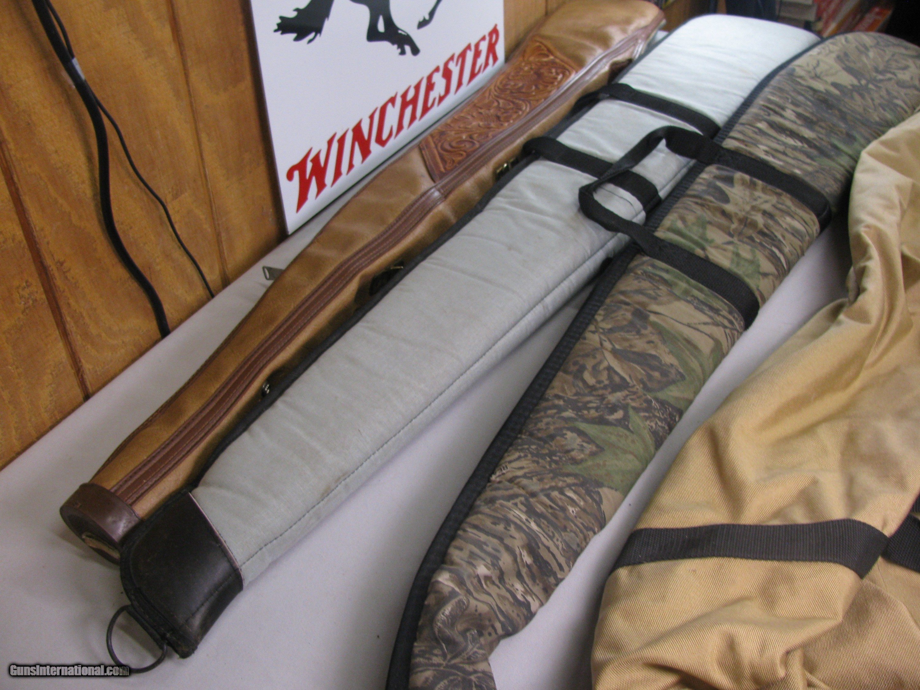 Shotgun and rifle cases. Real tree case 52” long, Winchester case 49” and the leather case 50”. Gun case cover …All are in good used condition.