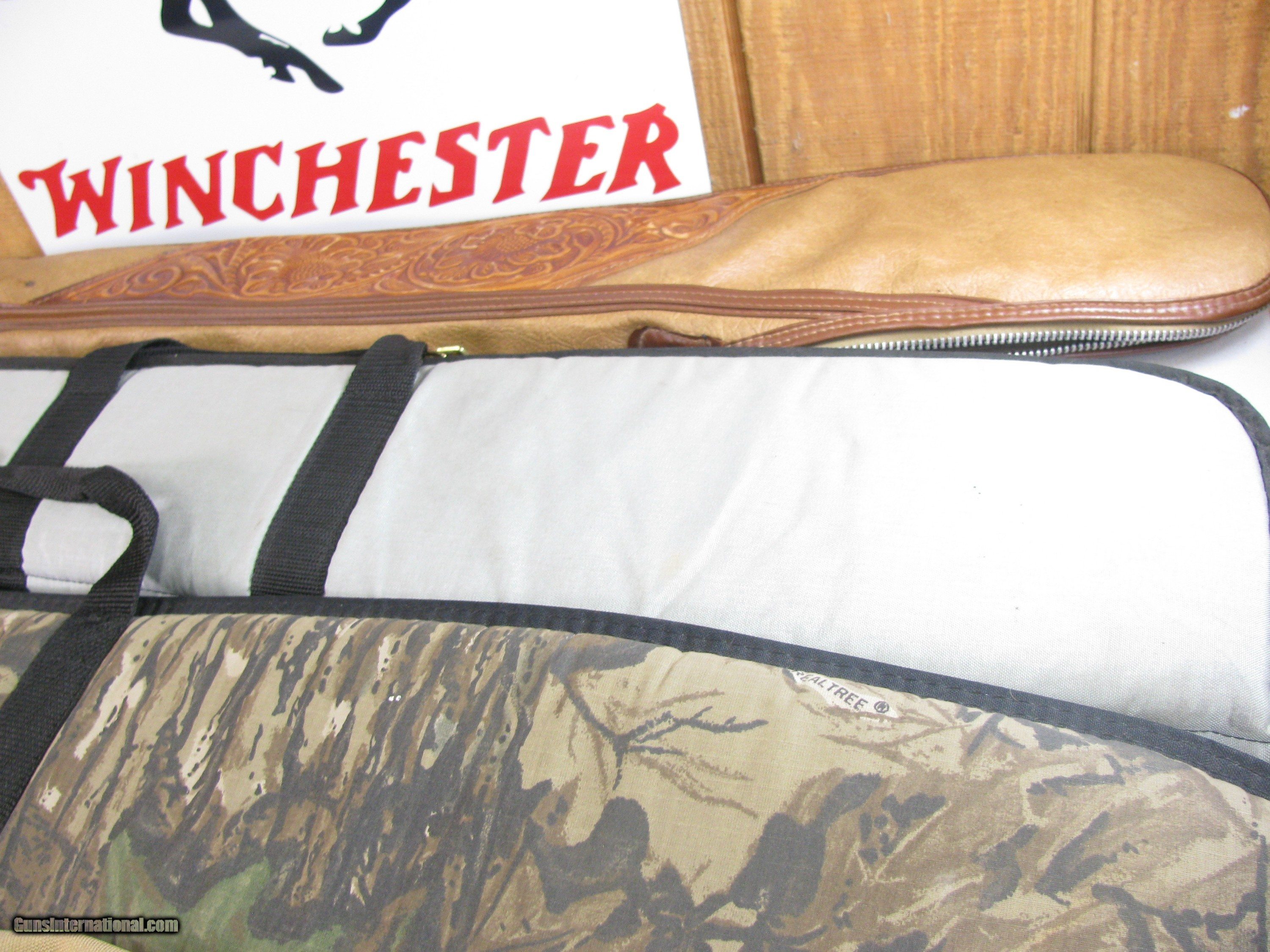 Description: 8757 Shotgun and rifle cases. Real tree case 52” long, Winchester case 49” and the leather case 50”. Gun case cover …All are in good used condition. SOLD |