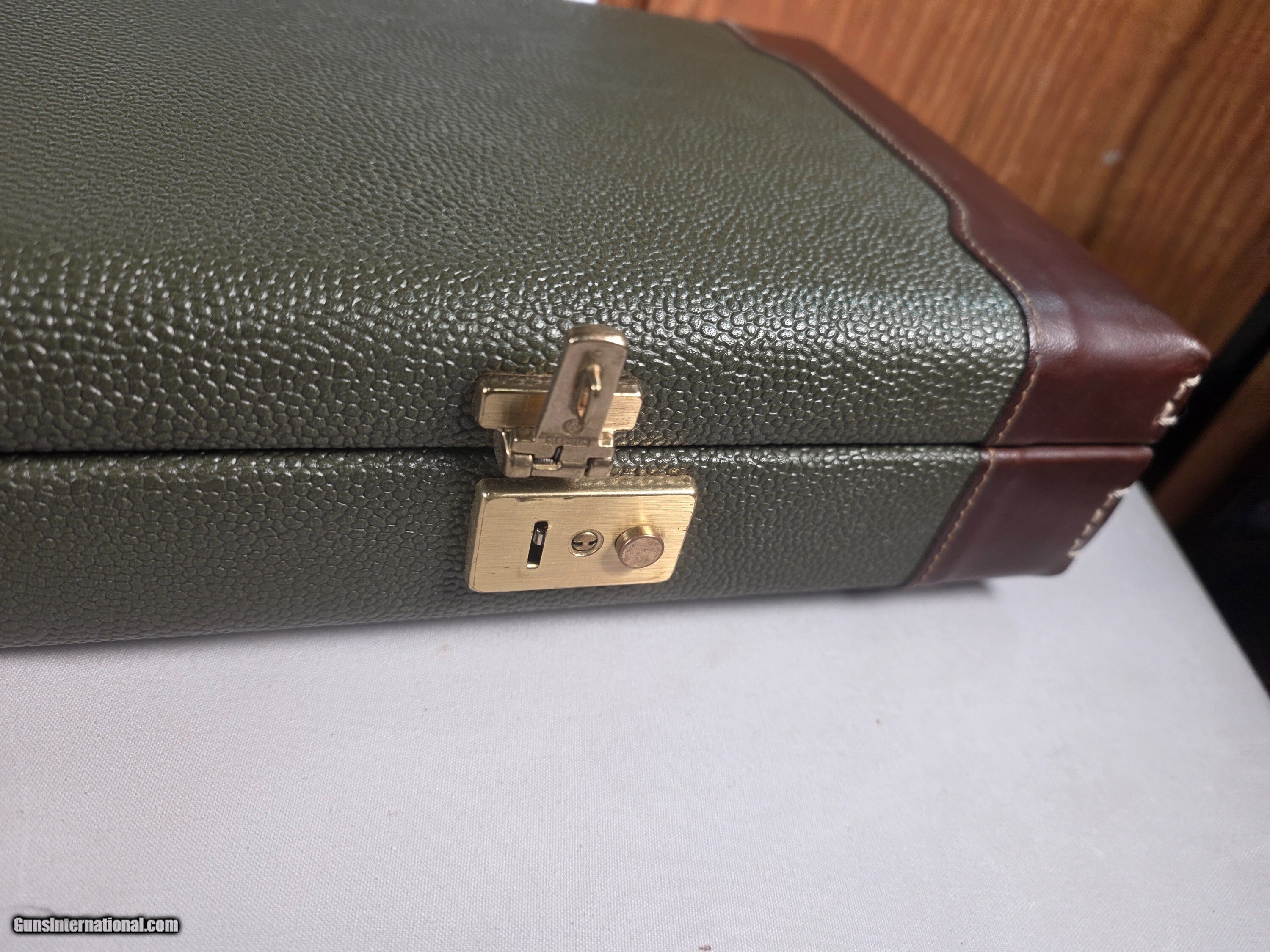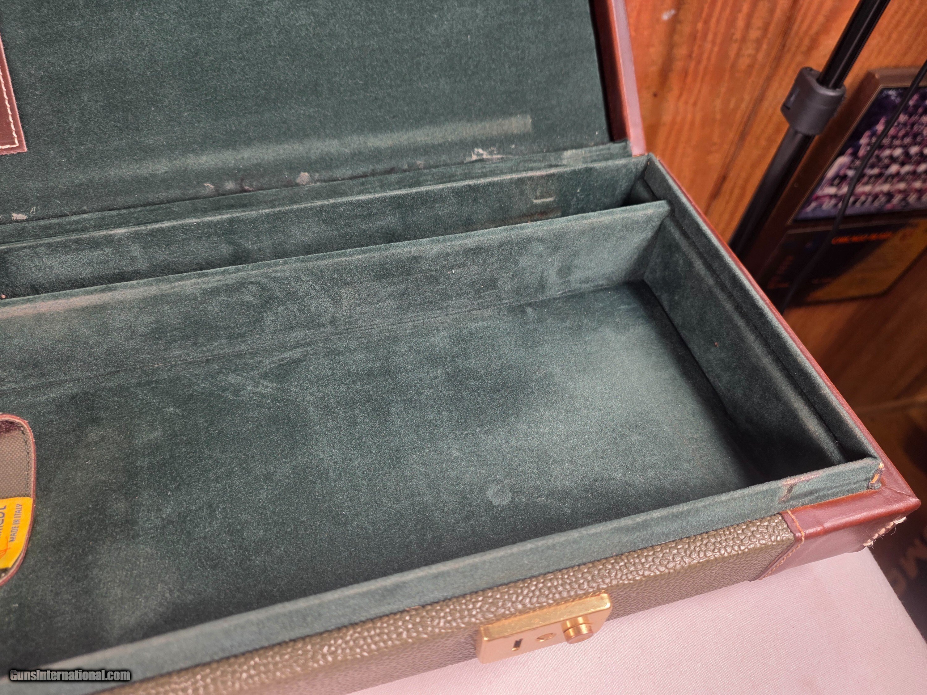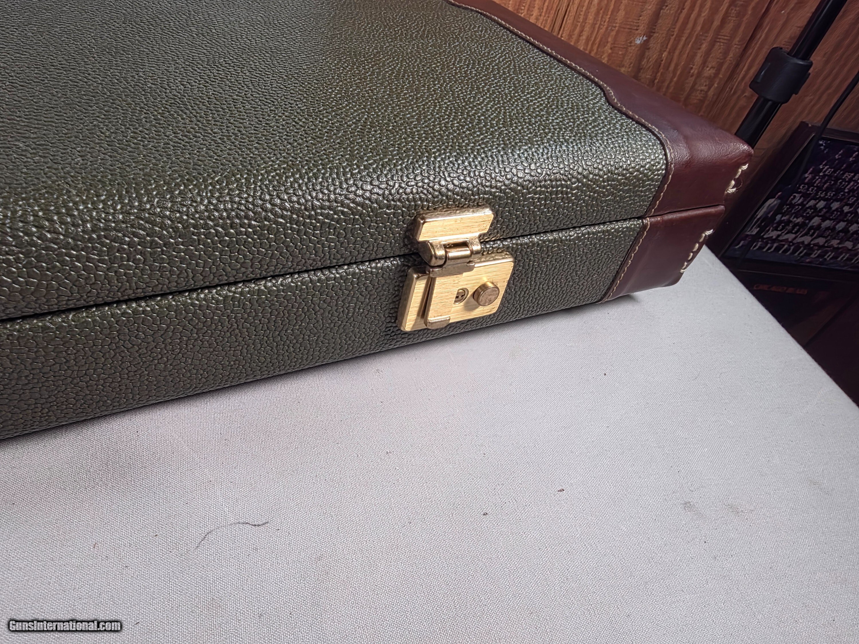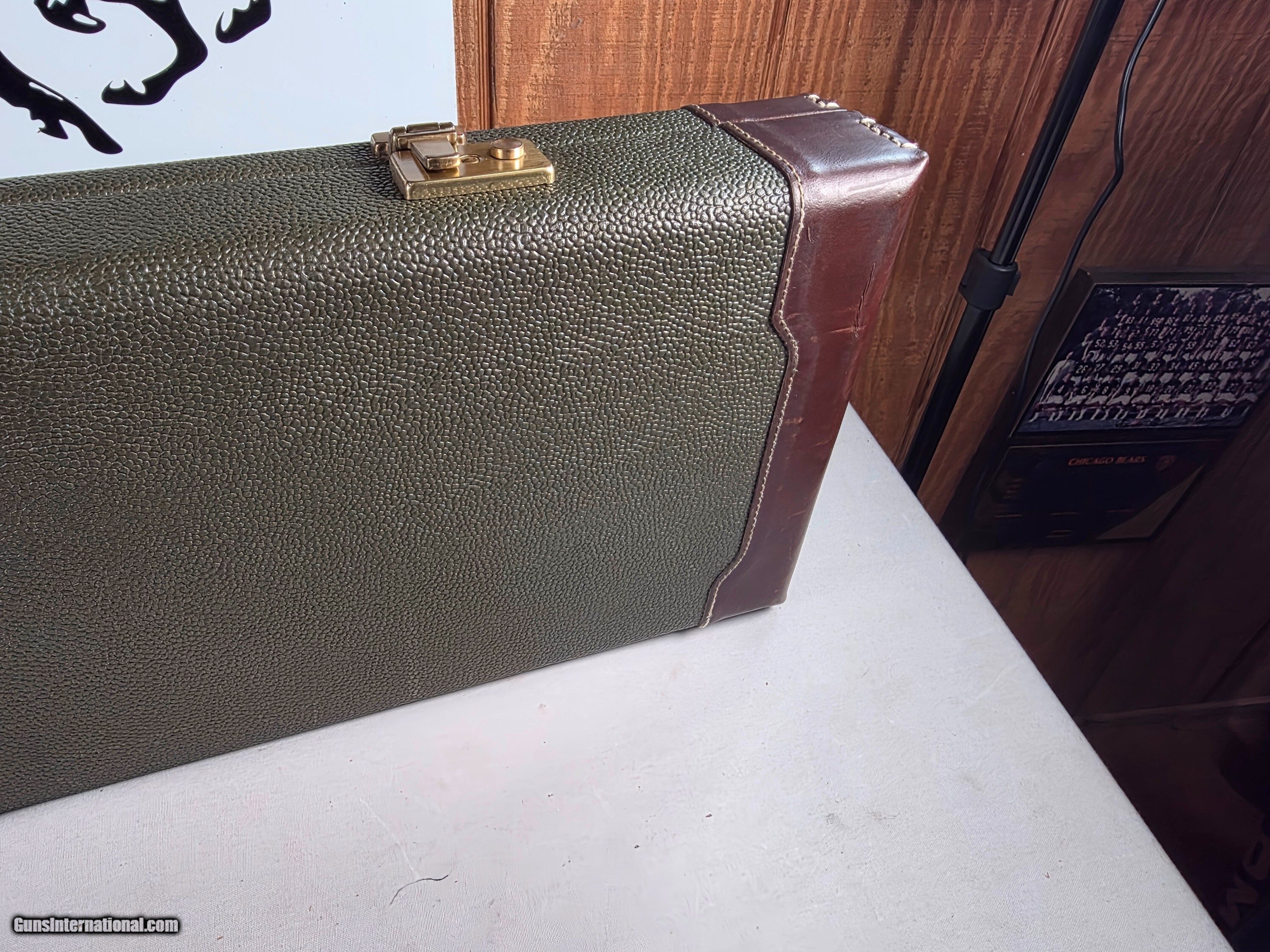 Description: 9299 Merkel Green with leather Shotgun trunk style hard case. Will fit up to a 30” Barrel, these are getting harder to find!. Has blocks. More pictures at DawsonsDoubles DOT COM Price: $500.00 Shipping: $35.00 Contact Seller |