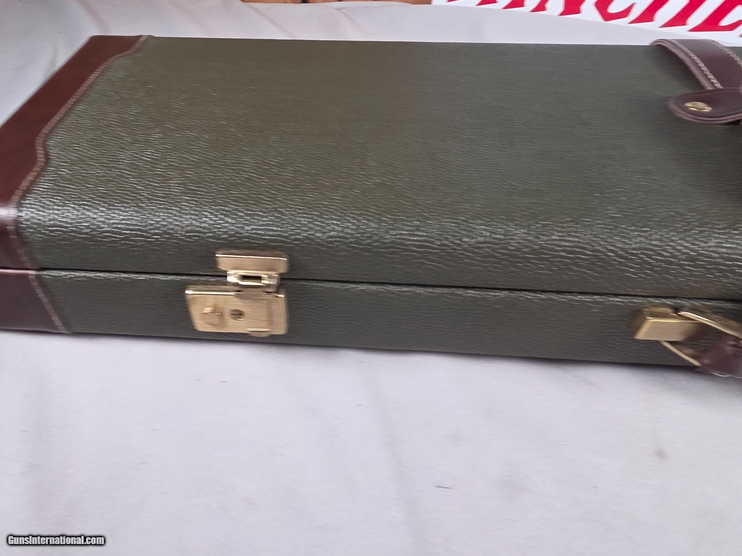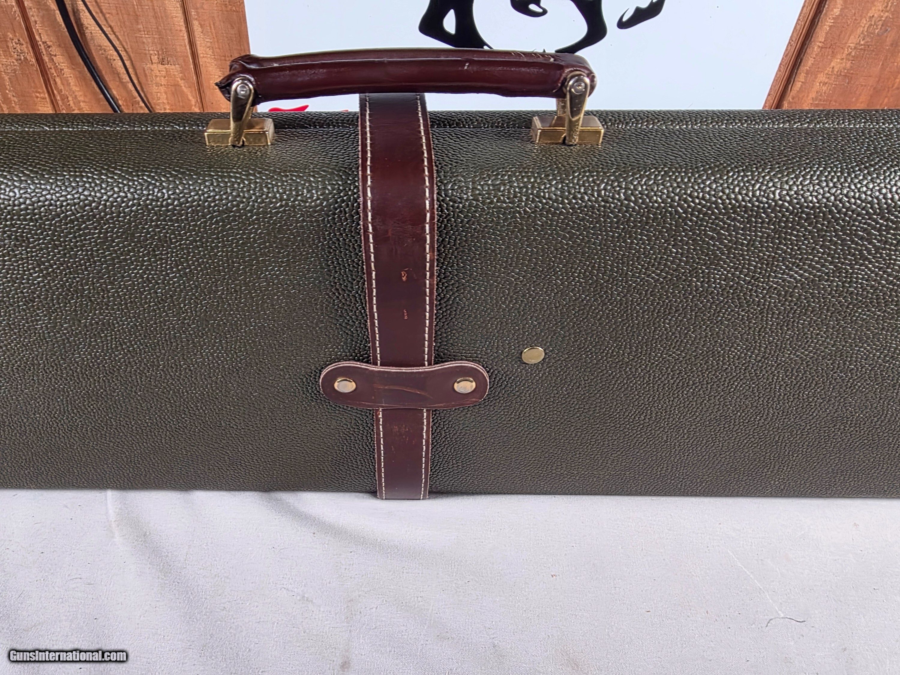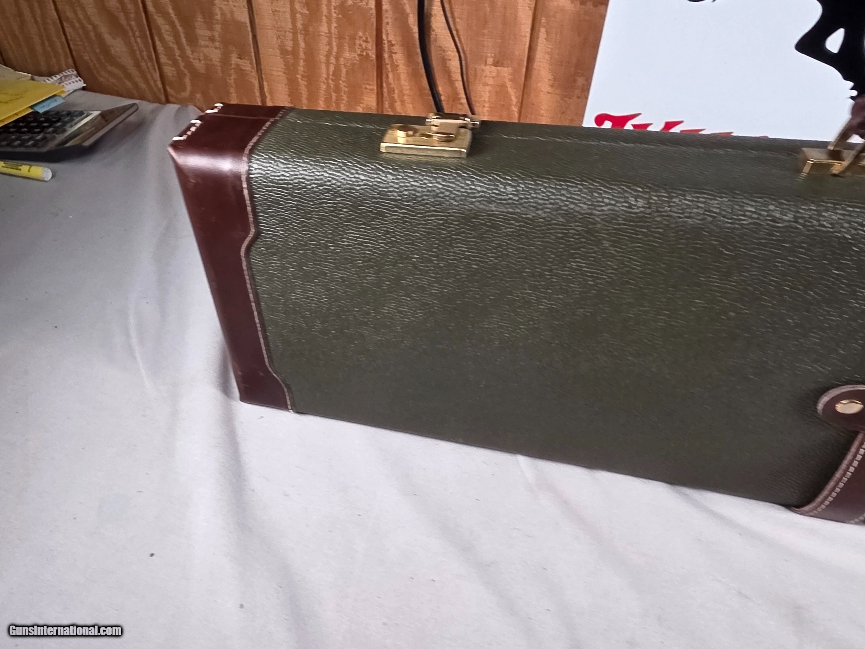 Merkel Green with leather Shotgun trunk style hard case. Will fit up to a 30” Barrel, these are getting harder to find!. Has blocks. More pictur