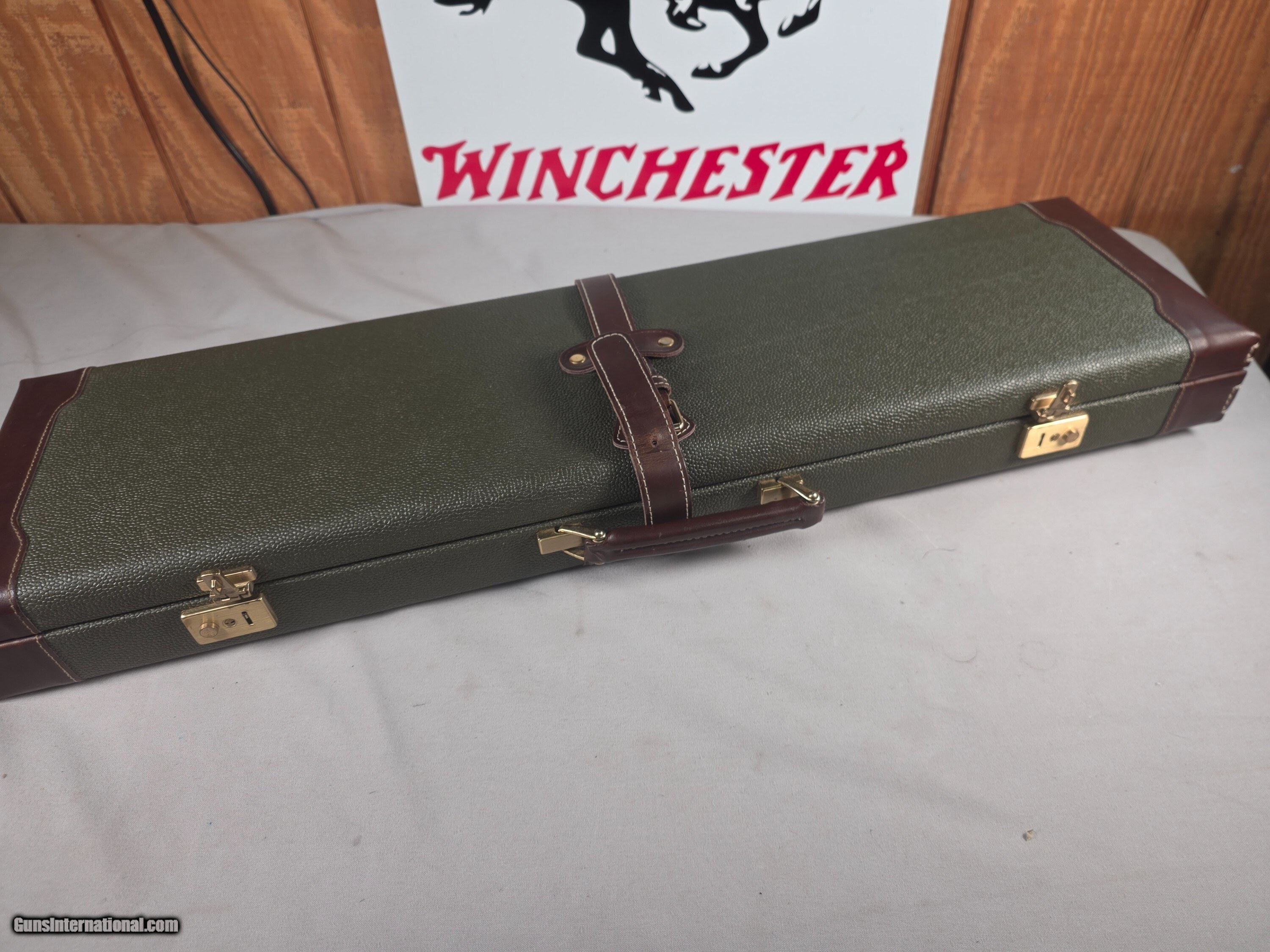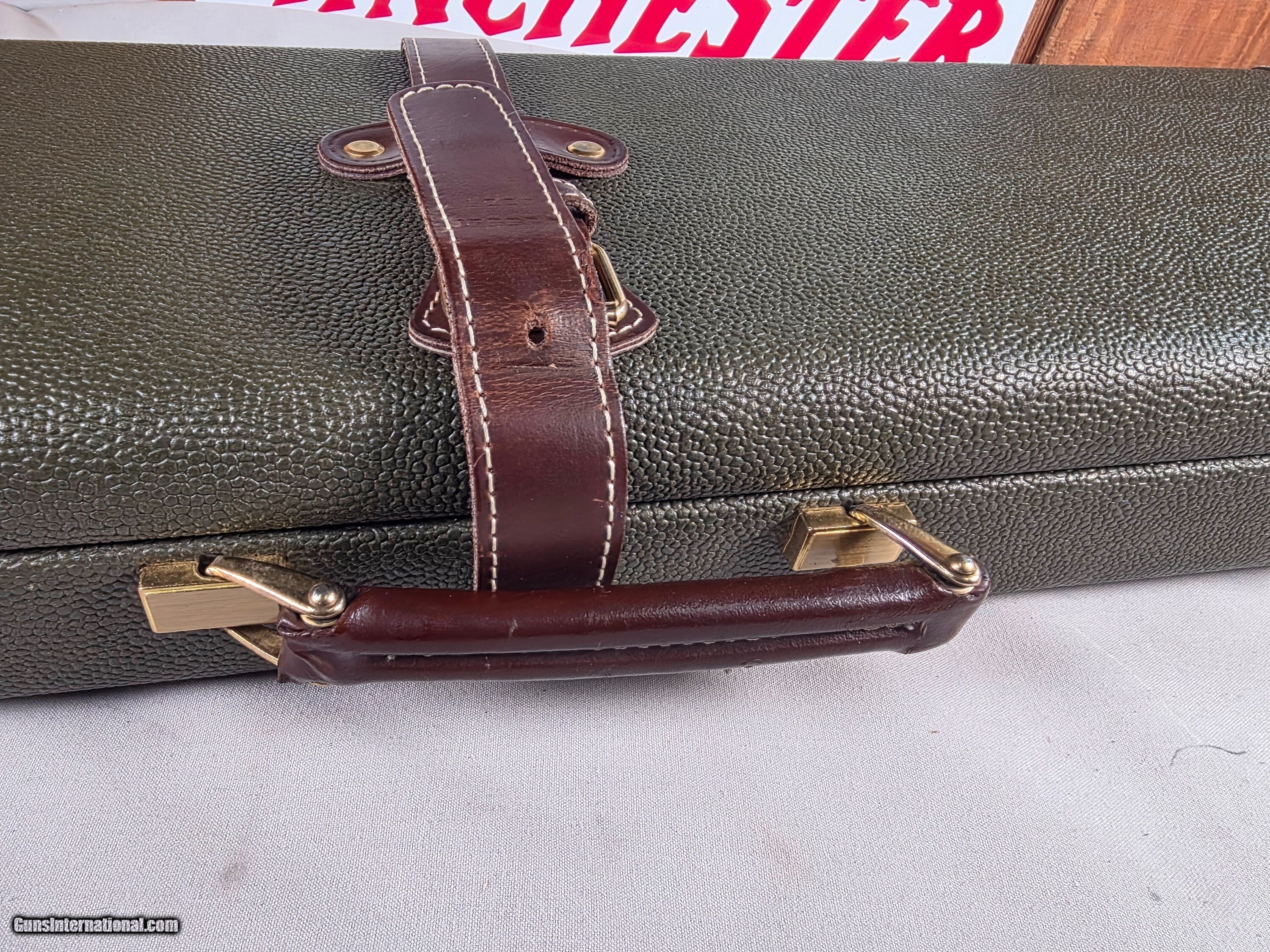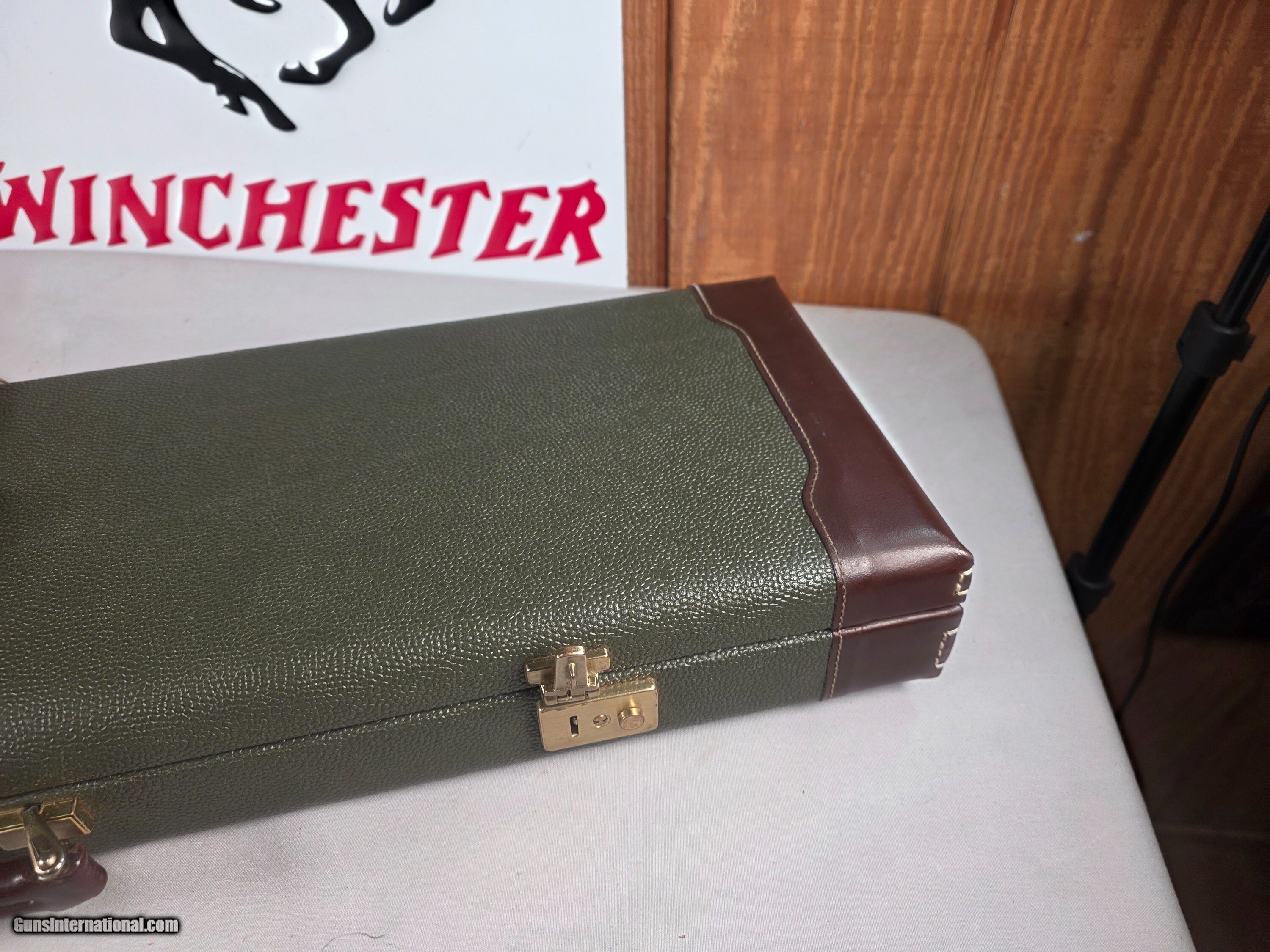 Merkel Green with leather Shotgun trunk style hard case. Will fit up to a 30” Barrel, these are getting harder to find!. Has blocks. More pictur