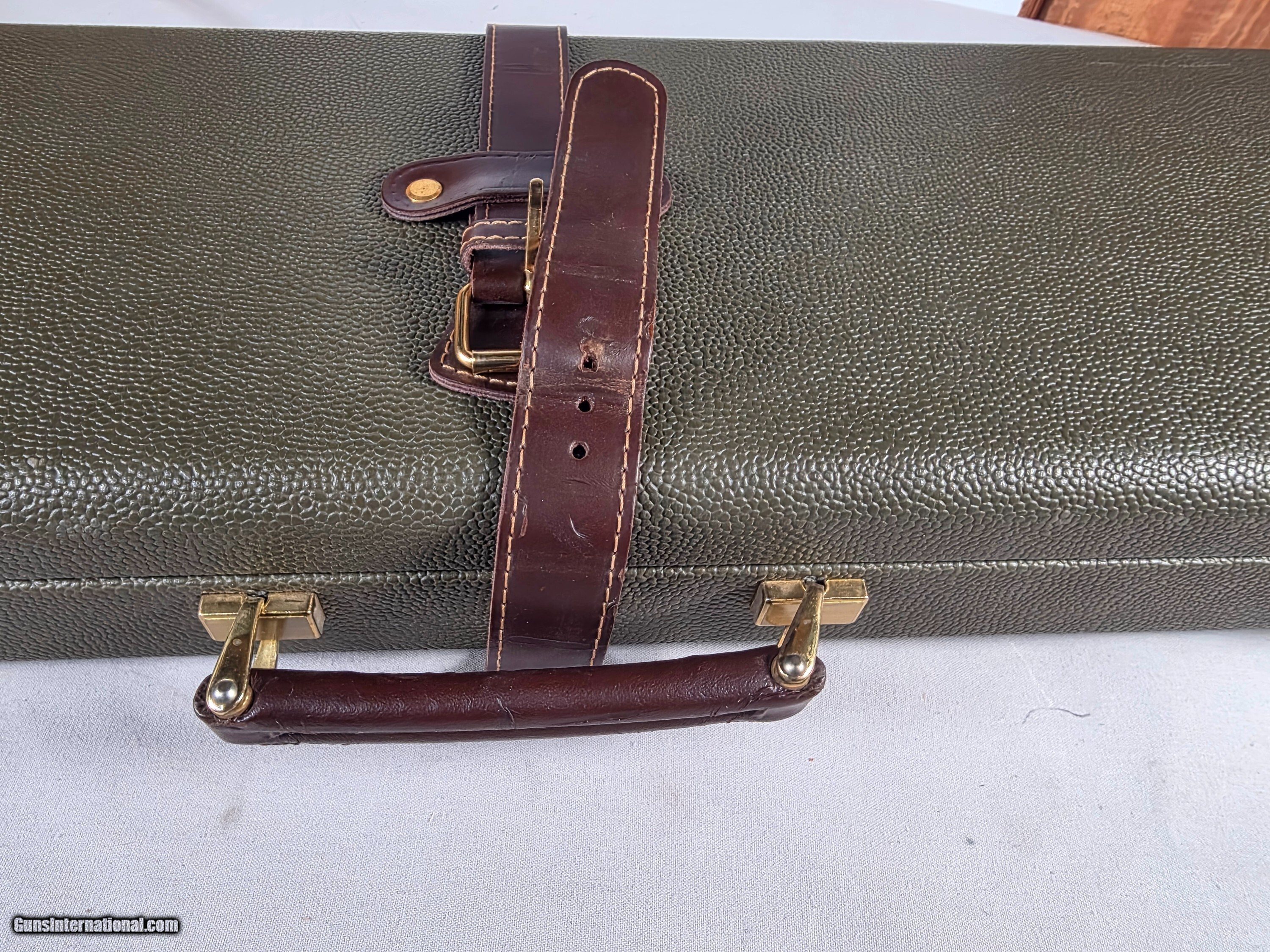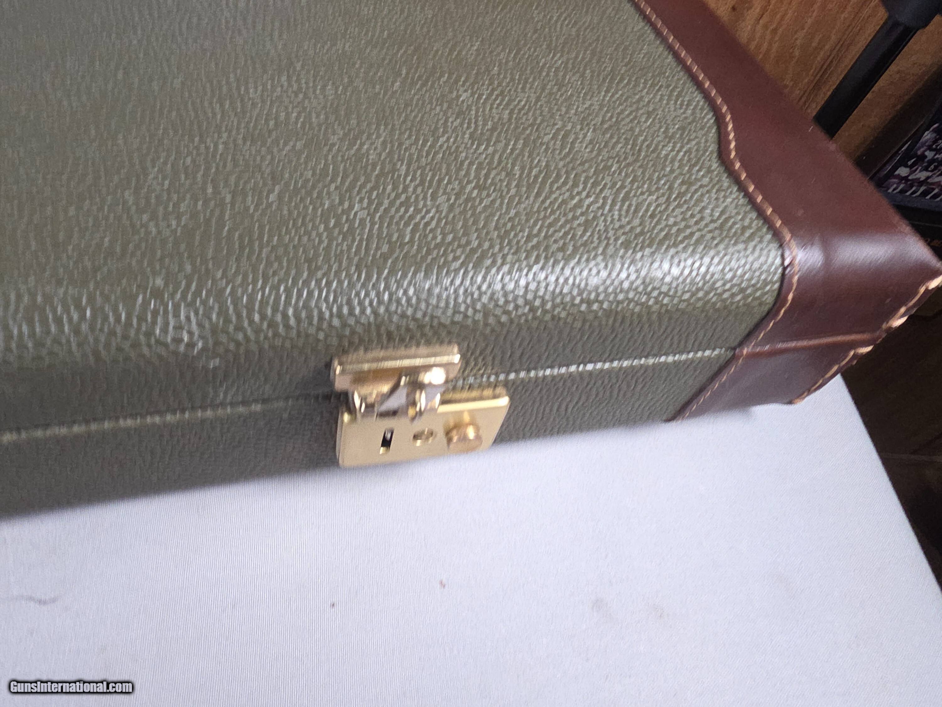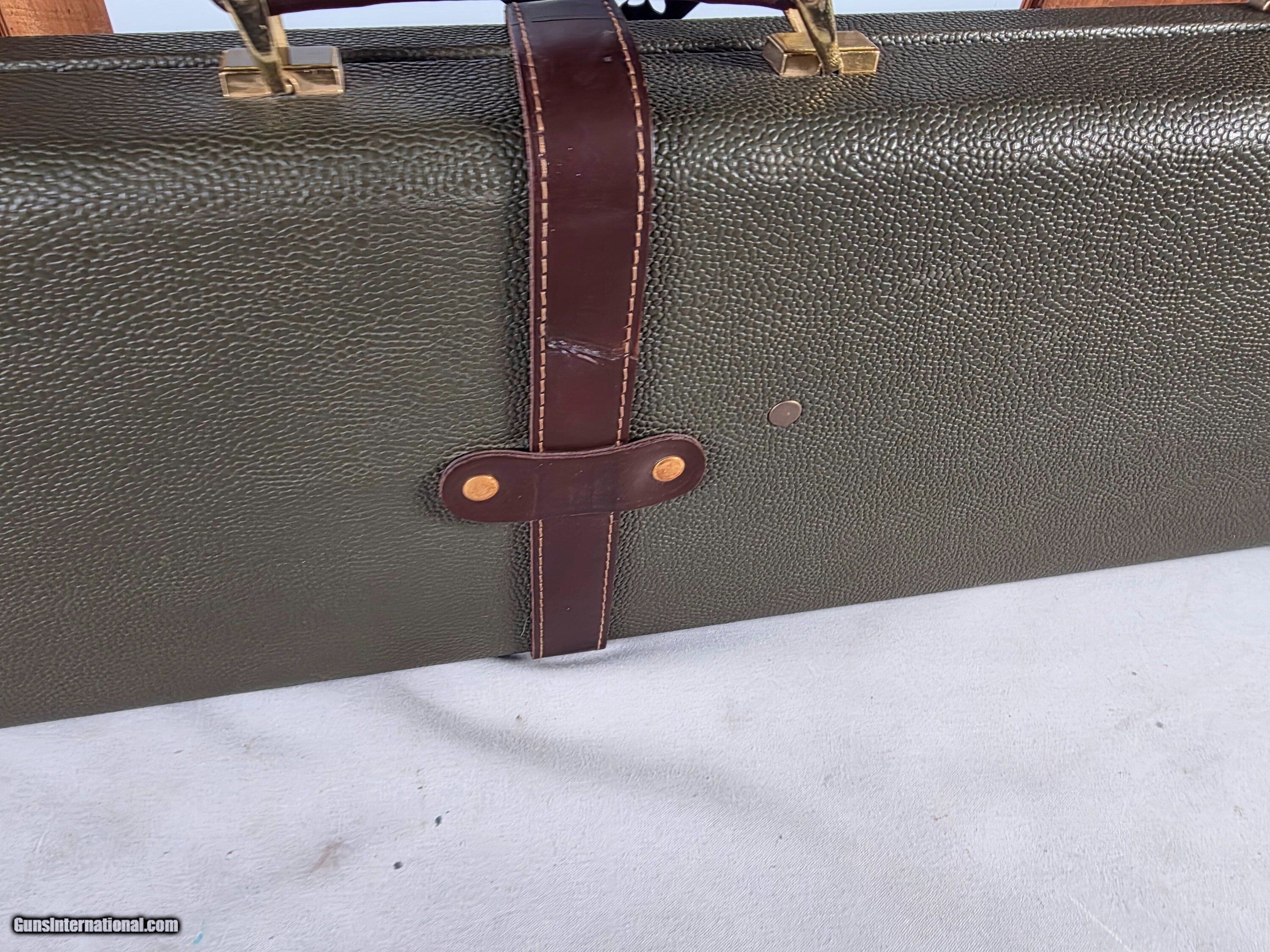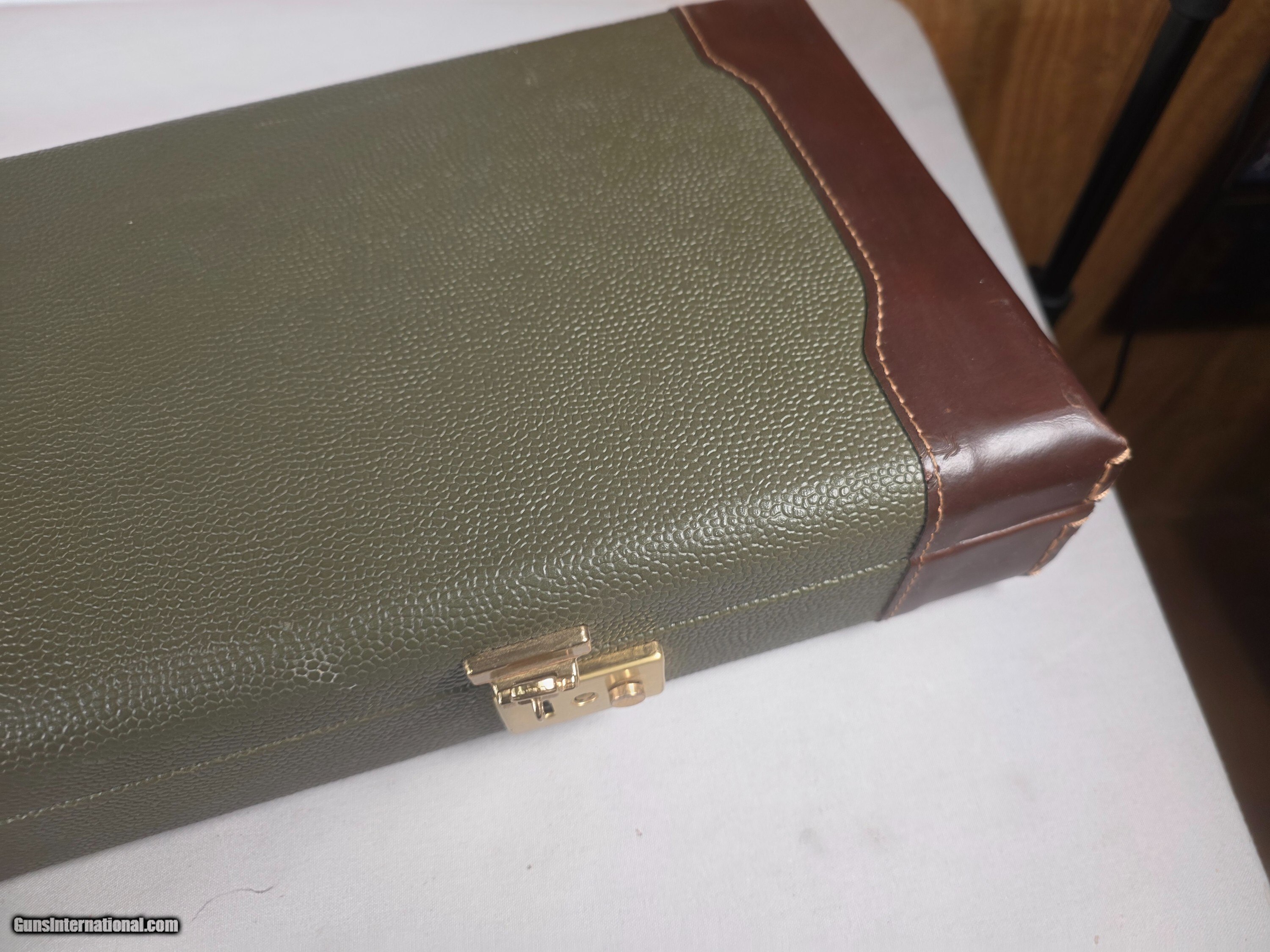Merkel Green with leather Shotgun trunk style hard case. Will fit up to a 30” Barrel, these are getting harder to find!. Has blocks and keys! Mo