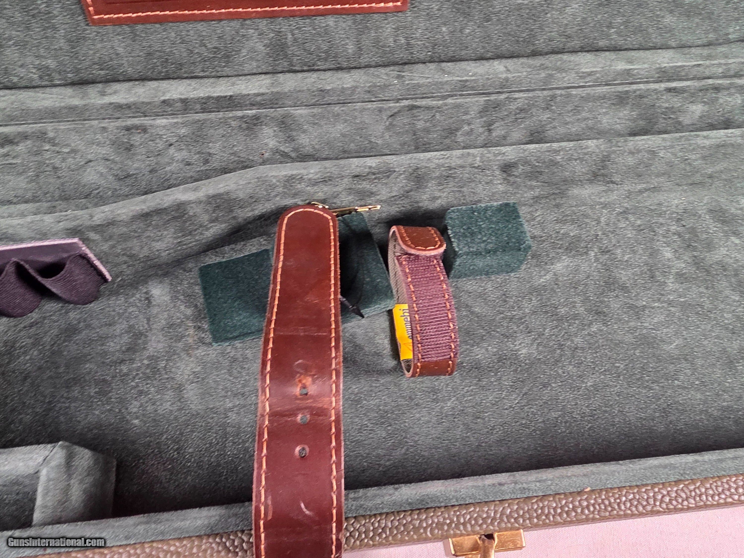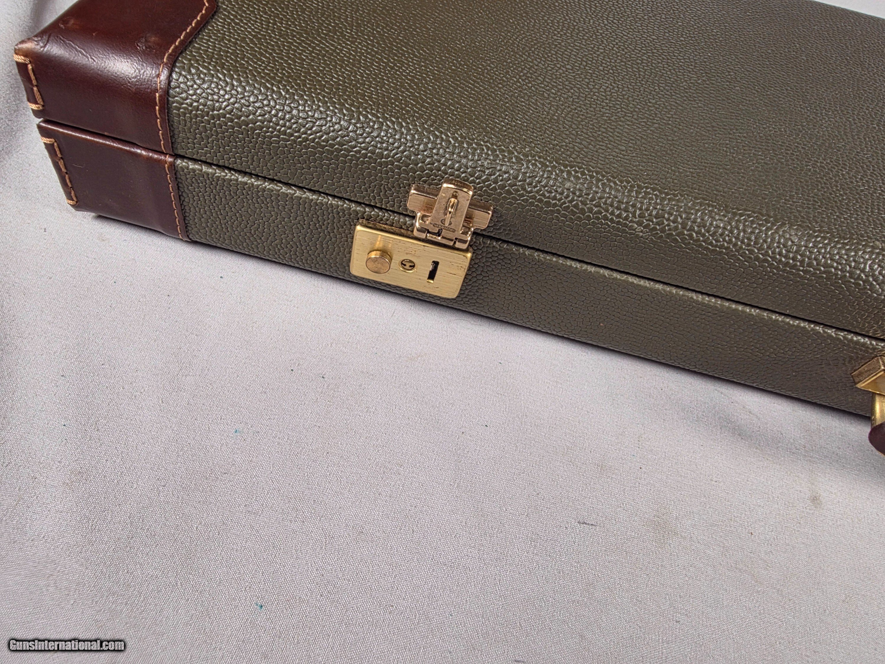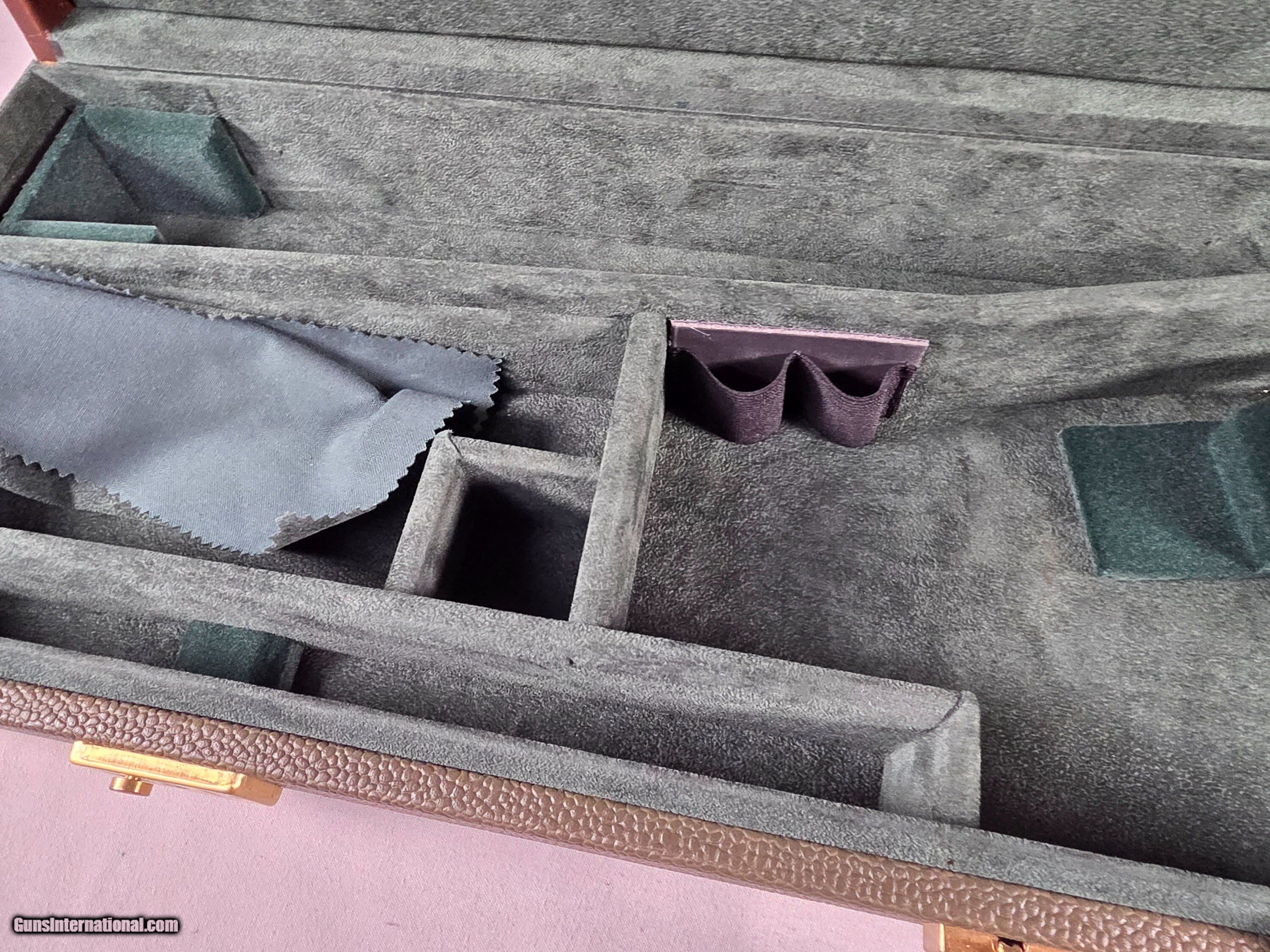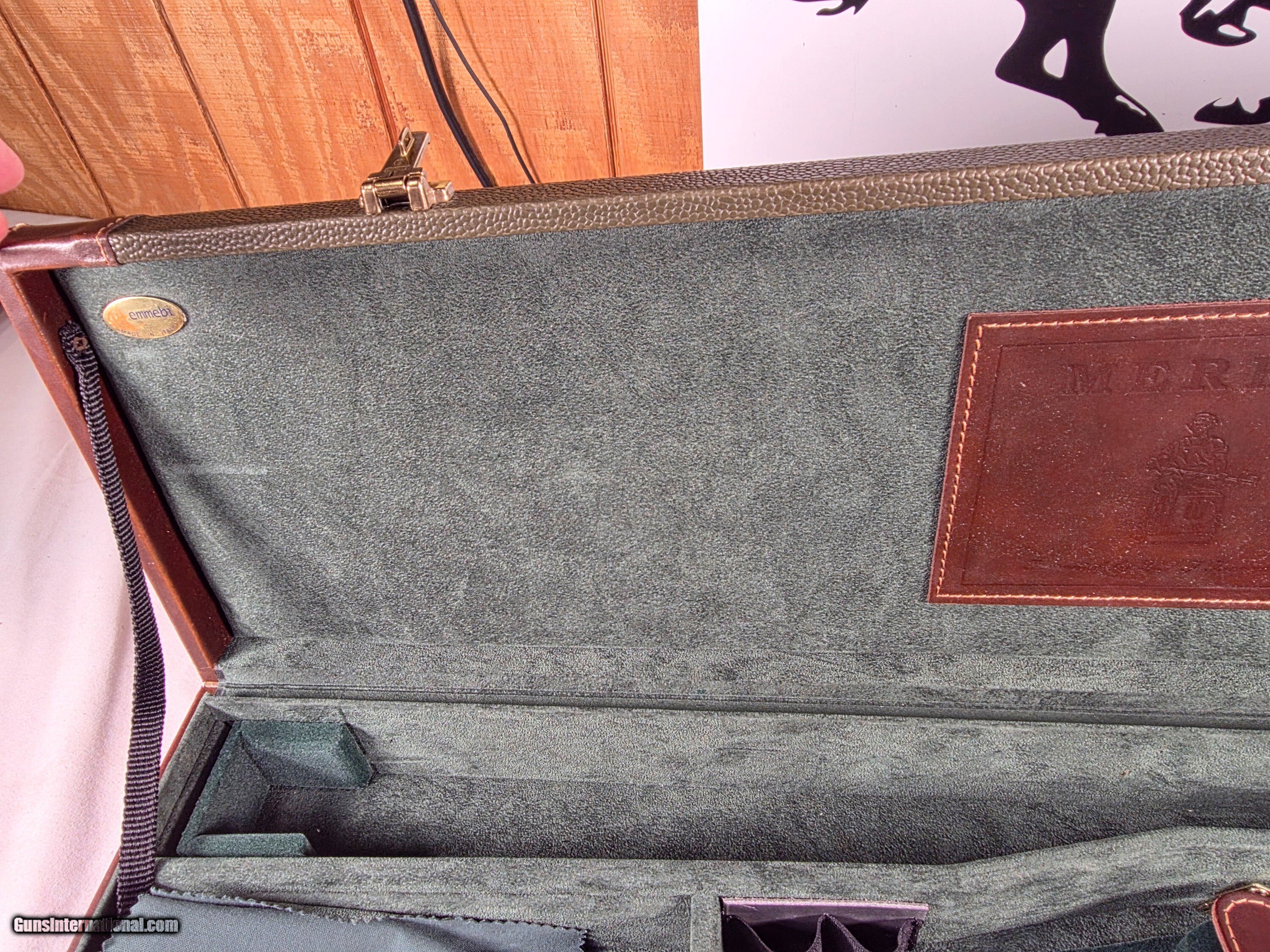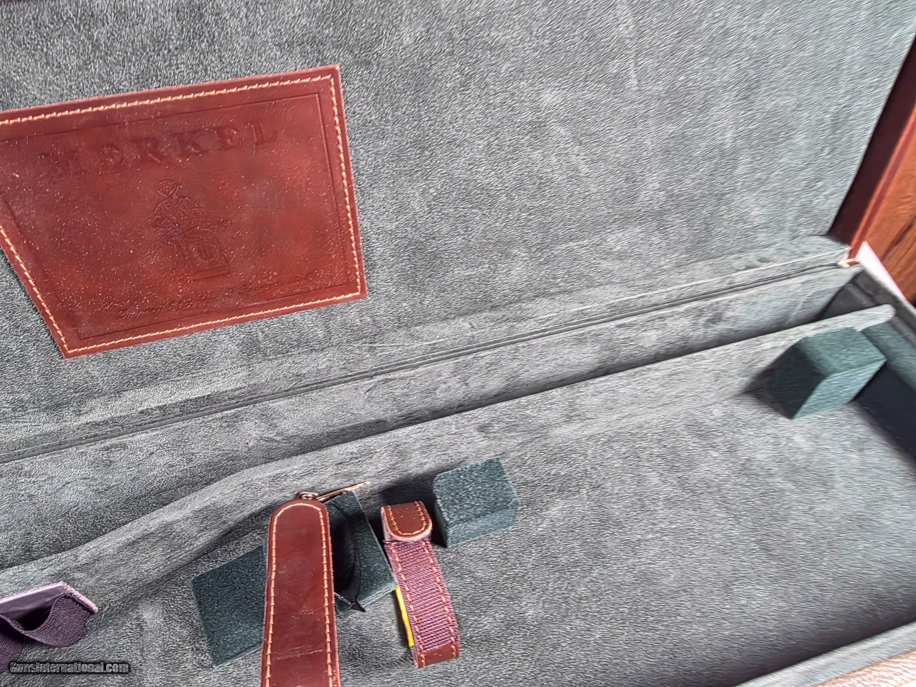 Merkel Green with leather Shotgun trunk style hard case. Will fit up to a 30” Barrel, these are getting harder to find!. Has blocks and keys! Mo