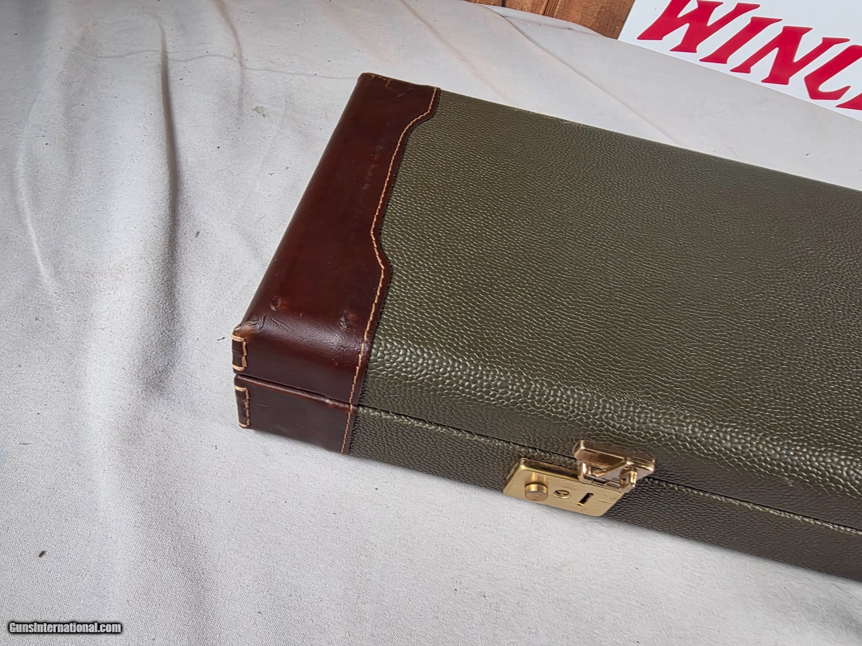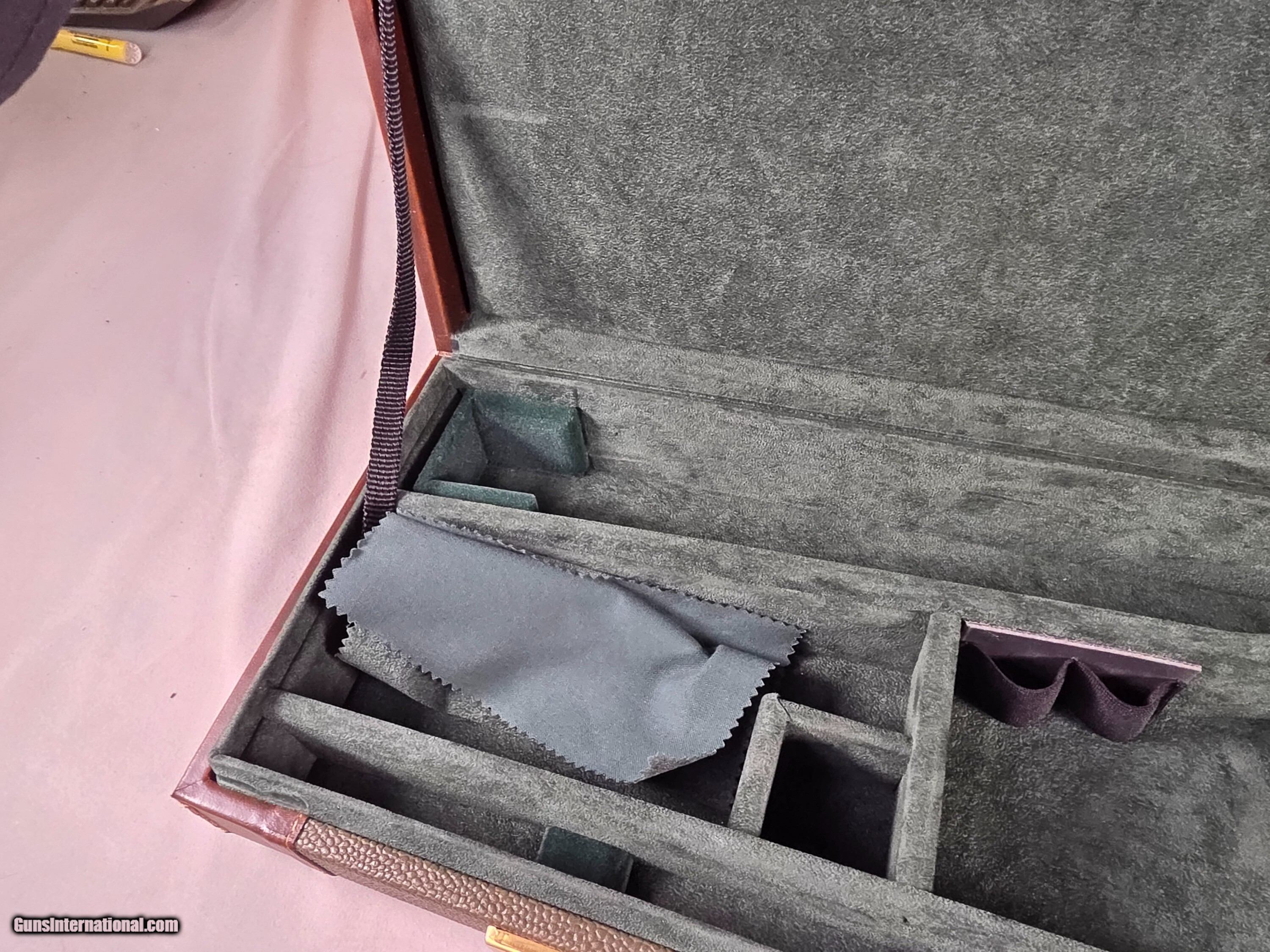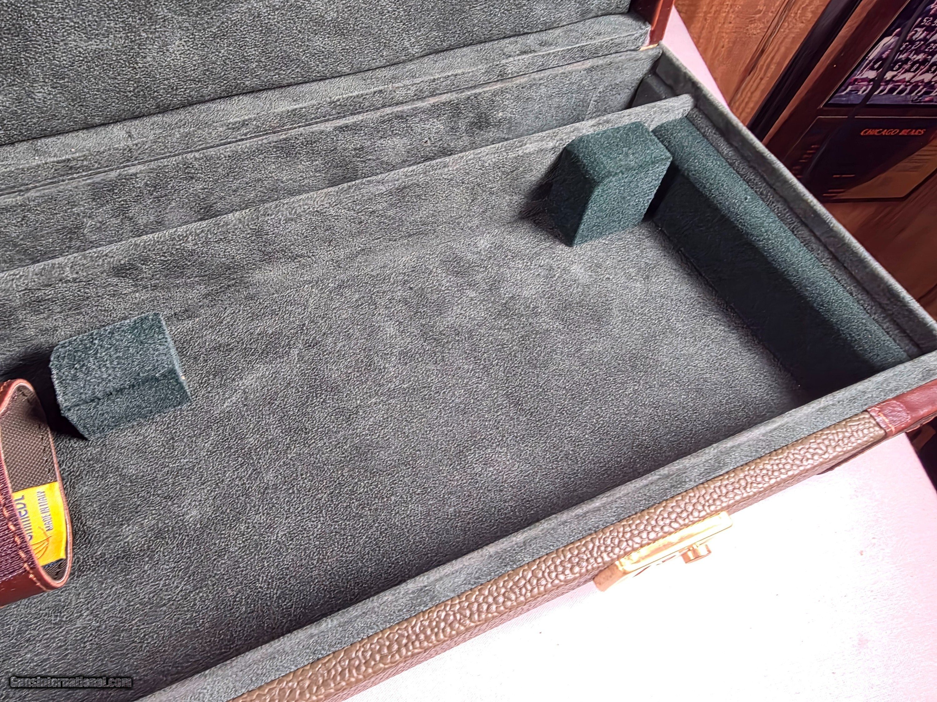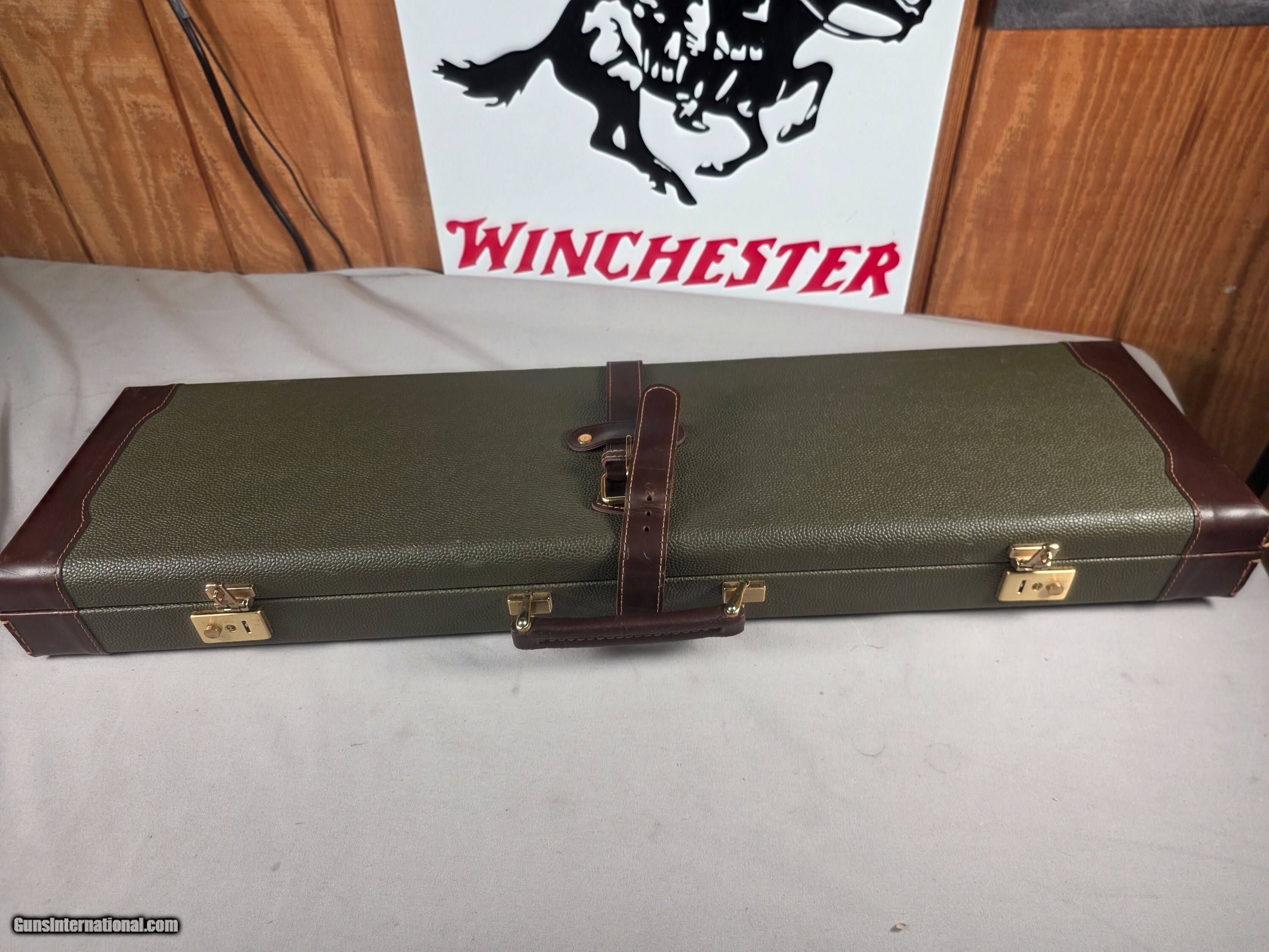 Merkel Green with leather Shotgun trunk style hard case. Will fit up to a 30” Barrel, these are getting harder to find!. Has blocks and keys! Mo