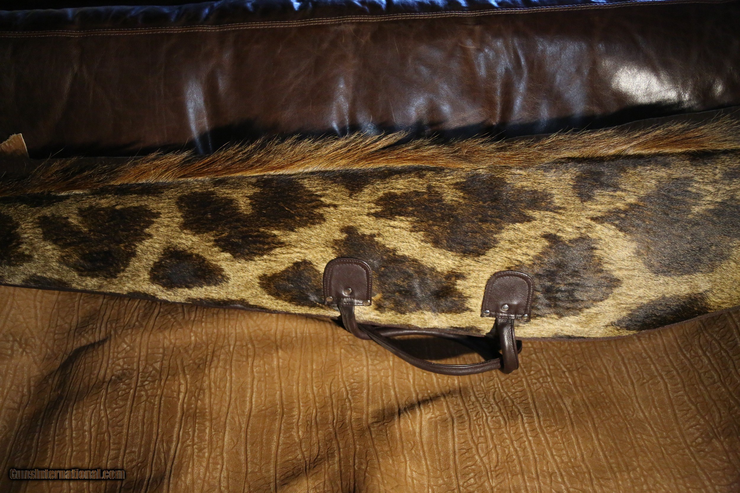 Description: SOLD:Giraffe neck skin gun bag. 50" Long with full length zipper. Ultra thick padding. Full length Giraffe mane at bottom of the bag. Handles are chocolate color and from Impala skin. From hunted maple leaf patterned Bull Giraffe. Will accommodate scoped rifle. Please also see my Youtube channel : (1) Old Colonial Treasures - YouTube SOLD |
