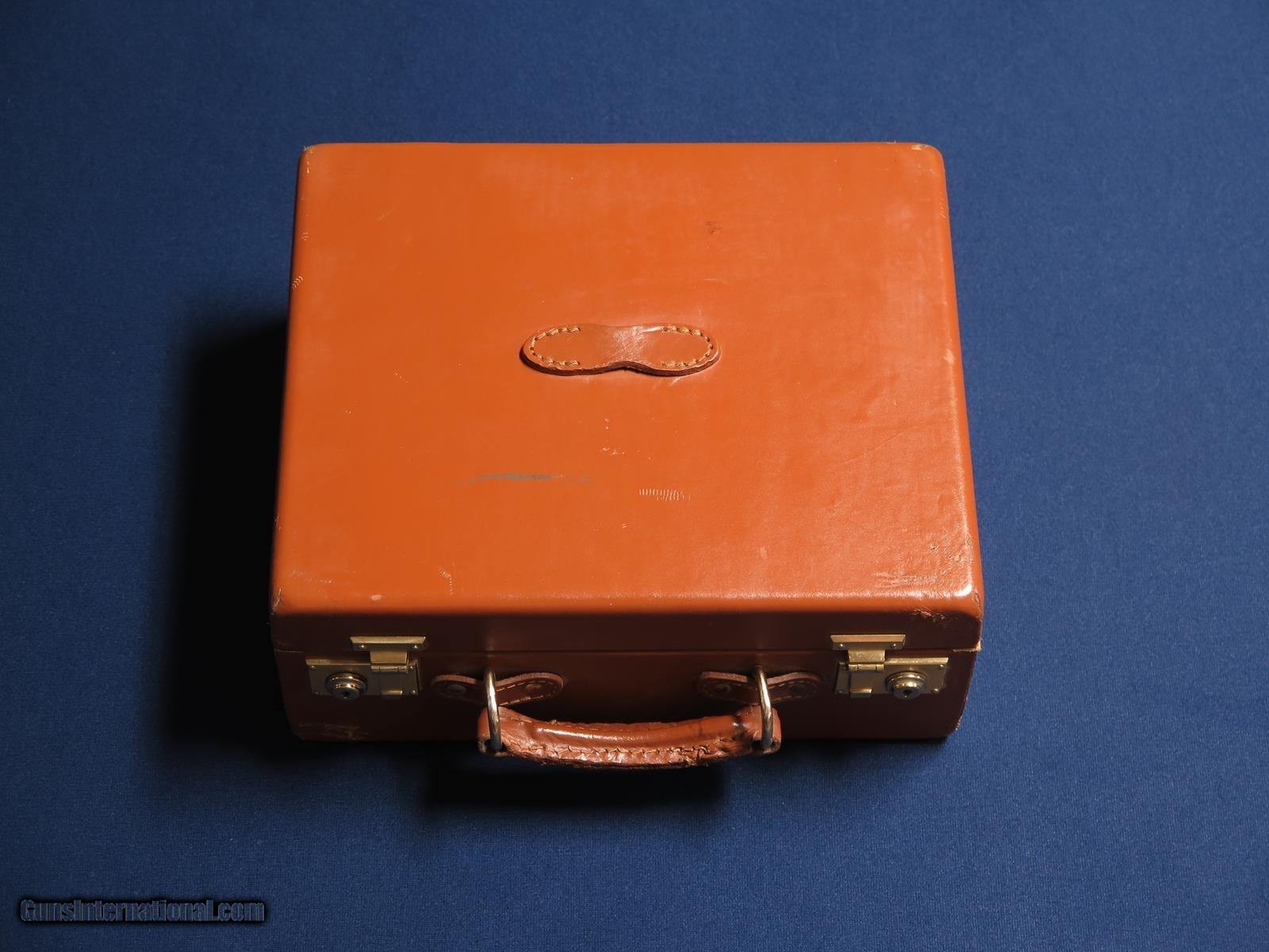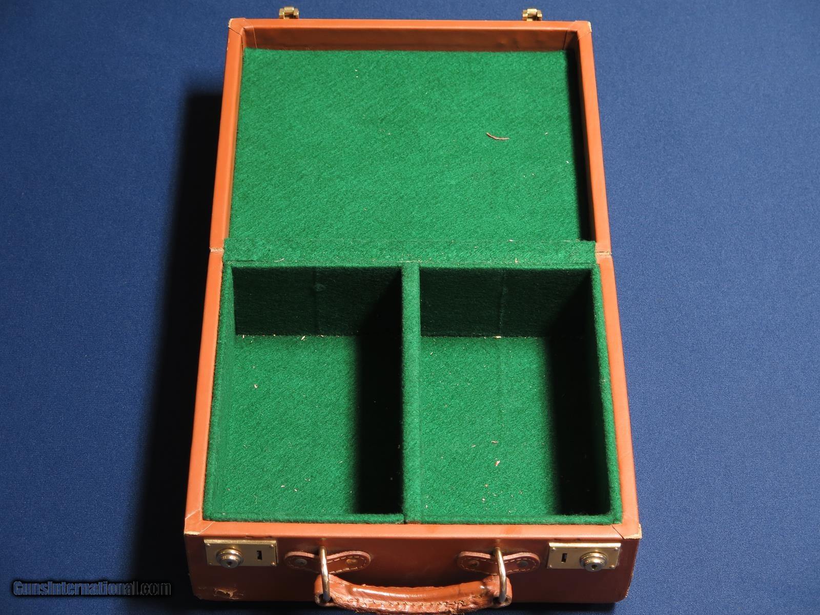 Description: Leather cartridge hard case for 12ga shotgun ammo. Holds 8 boxes. Case shows slight wear on outside. SOLD |