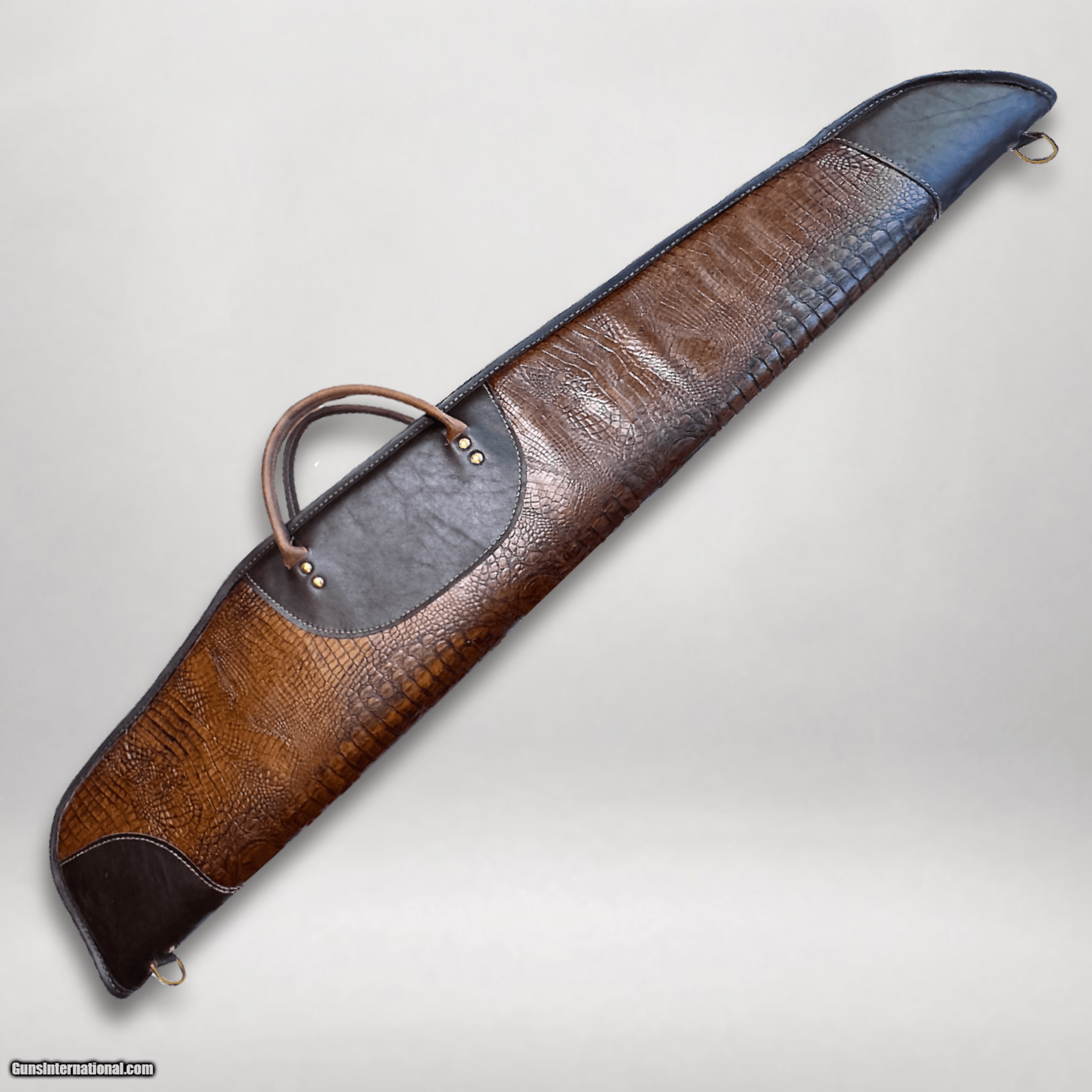 Description: Low Scope Rifle Case – Cowhide Leather with Alligator Embossing Stock No. ESR-162 One of a Kind… Handmade One at a Time This low-profile scoped rifle case is handcrafted from premium cowhide leather featuring a rich alligator embossed pattern. Designed for shooters who appreciate refined detail and dependable protection, this case combines classic craftsmanship with bold texture and character. Each case is individually handmade in our High Point, North Carolina studio using hand-selected leathers sourced from around the world. The embossed alligator pattern provides striking visual depth while ensuring every case remains truly one of a kind. Designed specifically for low-mounted scopes, this streamlined rifle case offers a snug fit without unnecessary bulk. The interior is fully lined with soft synthetic Sherpa to help protect your firearm from scratches and impact. Reinforced leather ends, solid brass hardware, and a heavy-duty YKK zipper complete a case built to be used, trusted, and handed down. Ideal for range use, field carry, travel, or secure home storage. Features & Details