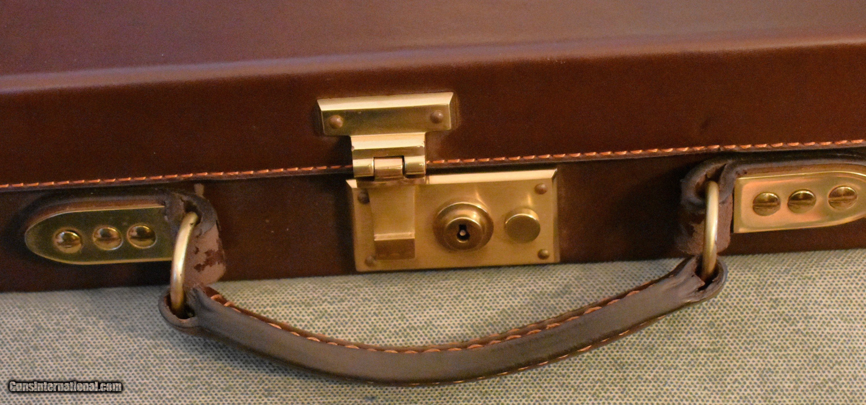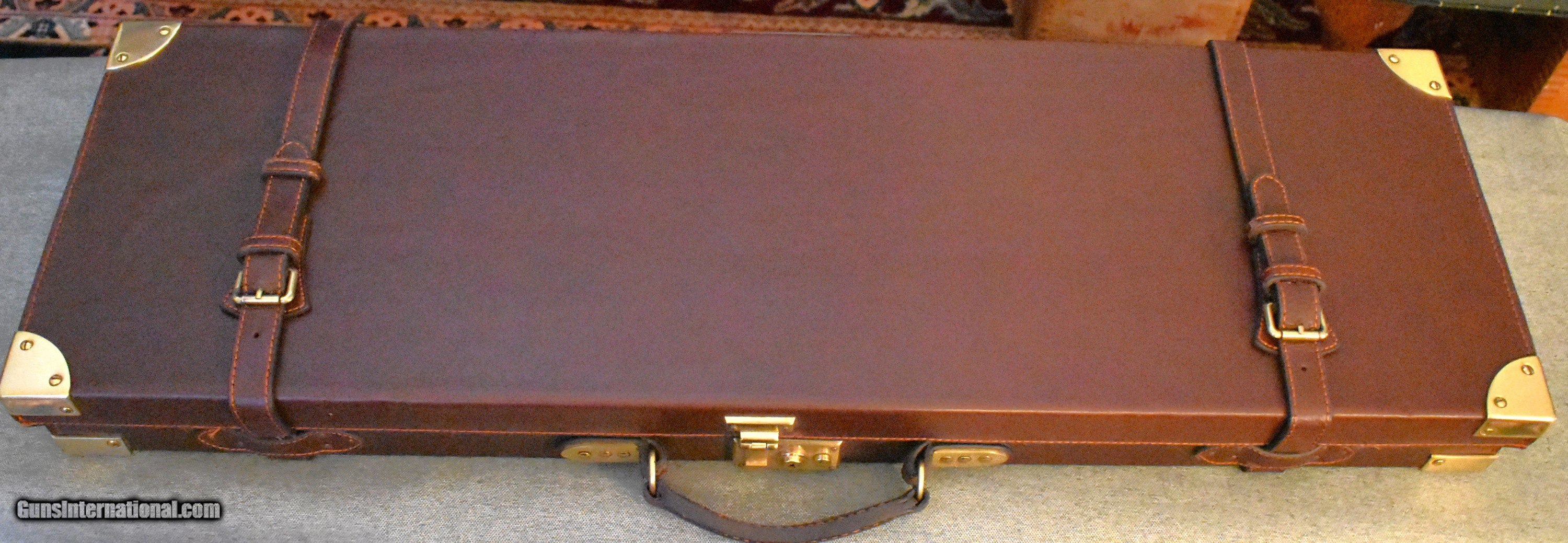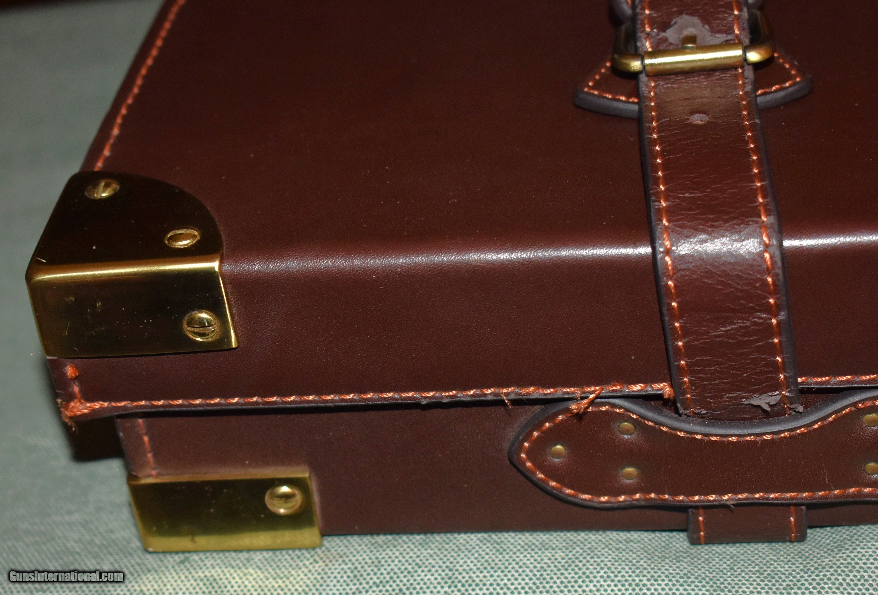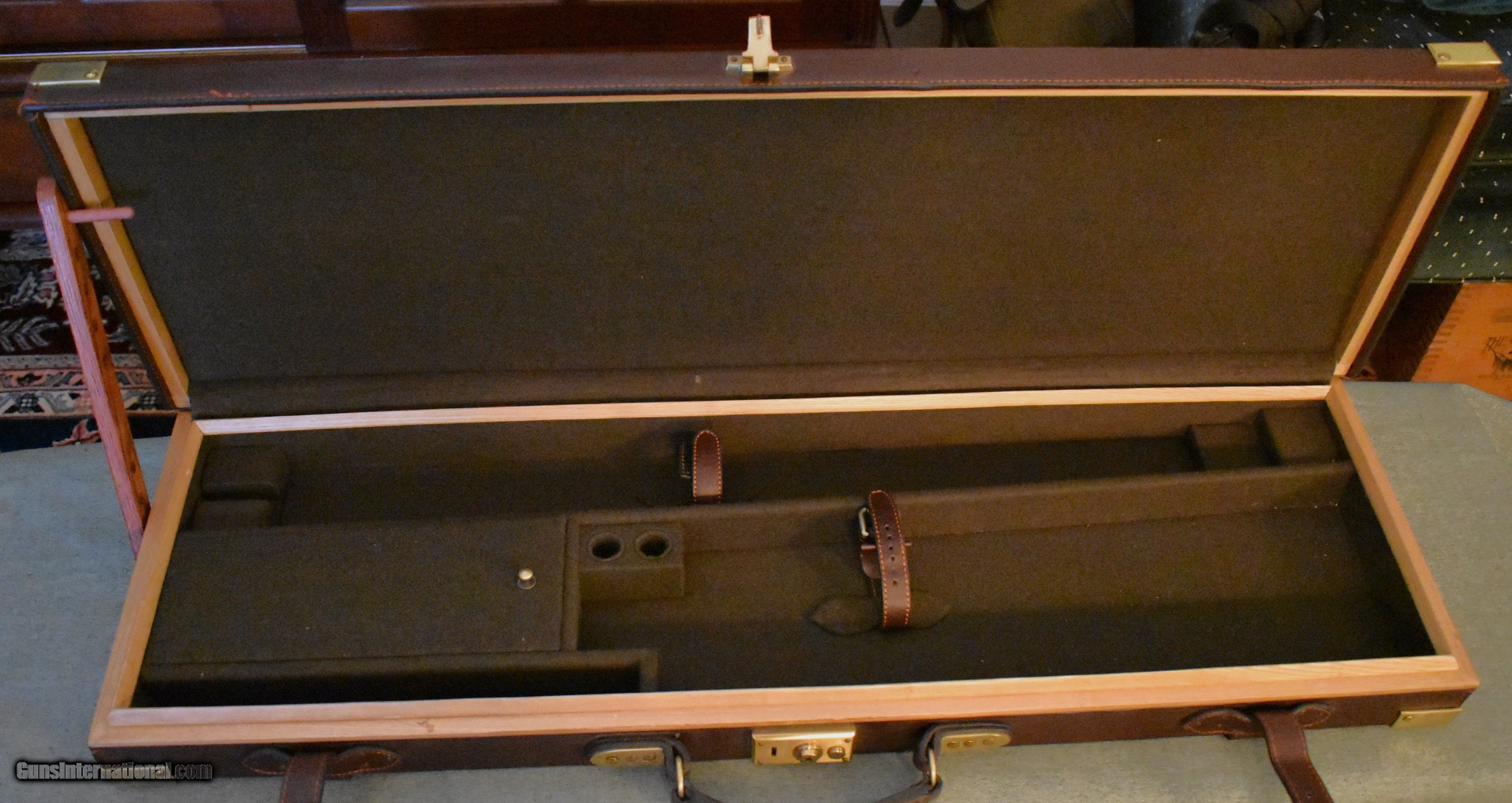 Description: Classic oak and leather take down case for either a sidexside or over/under double gun. Appears to be new and unused. Will handle up to 32" barrels. Heavy brass hardware and brass corners. Green felt interior. A great case for your high quelity doubles. price includes shipping and insurance. SOLD |