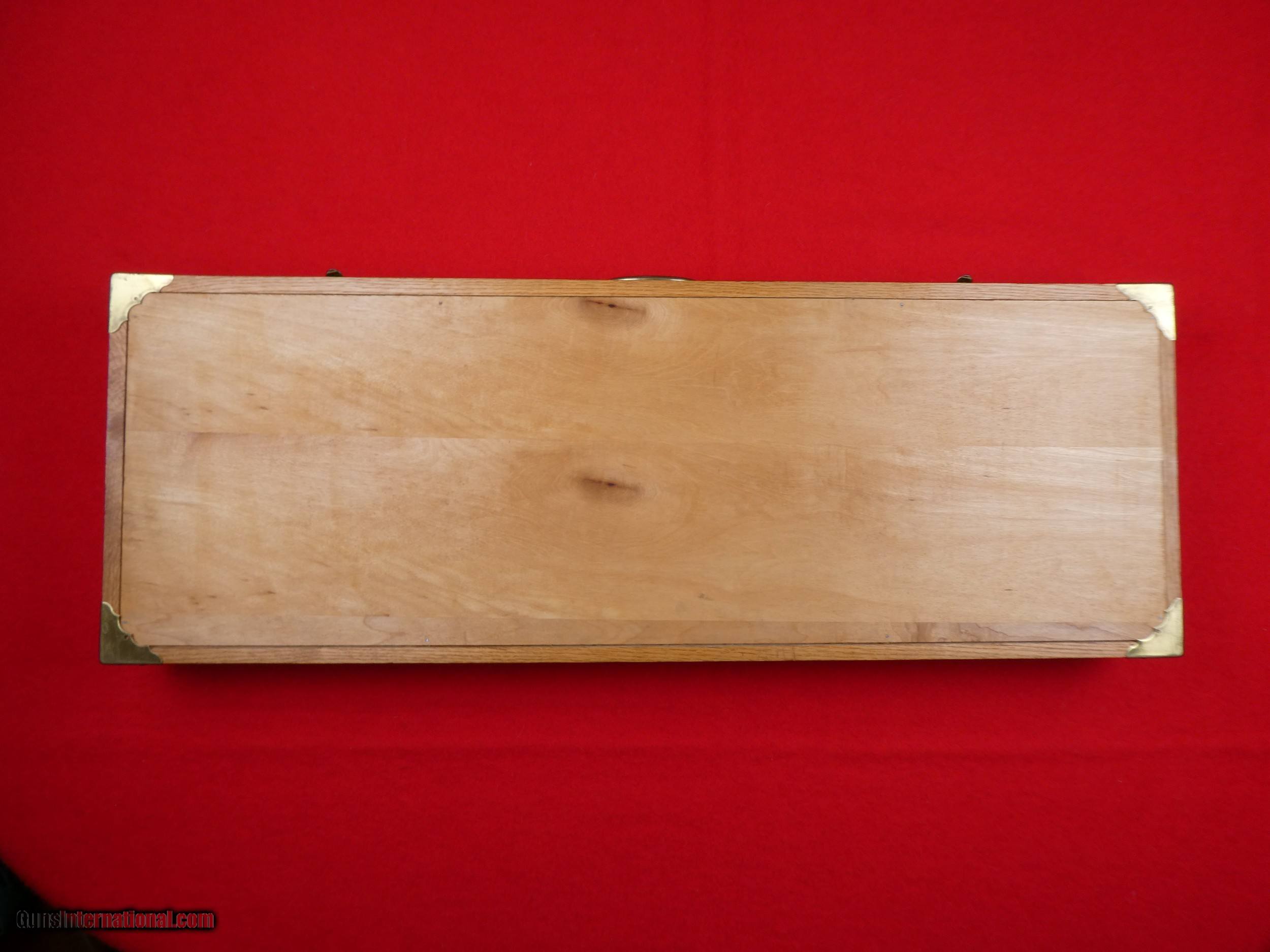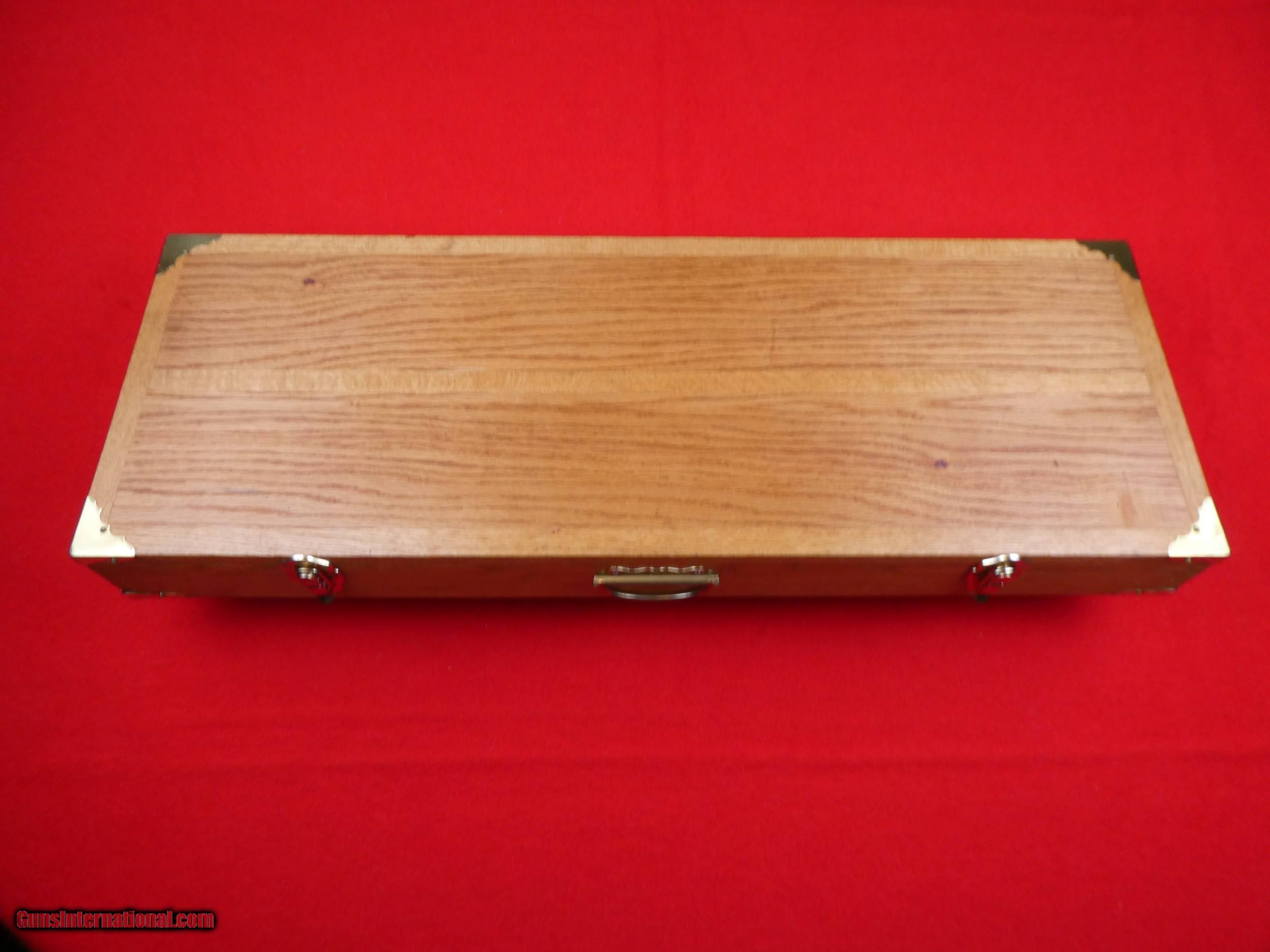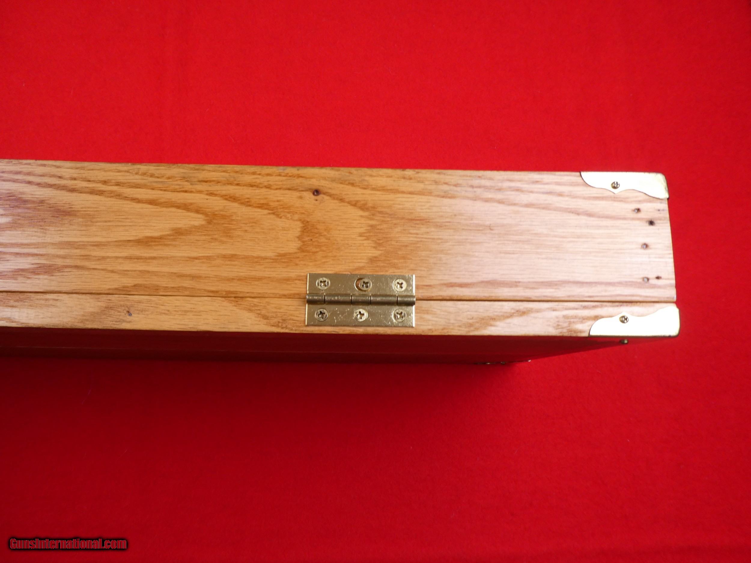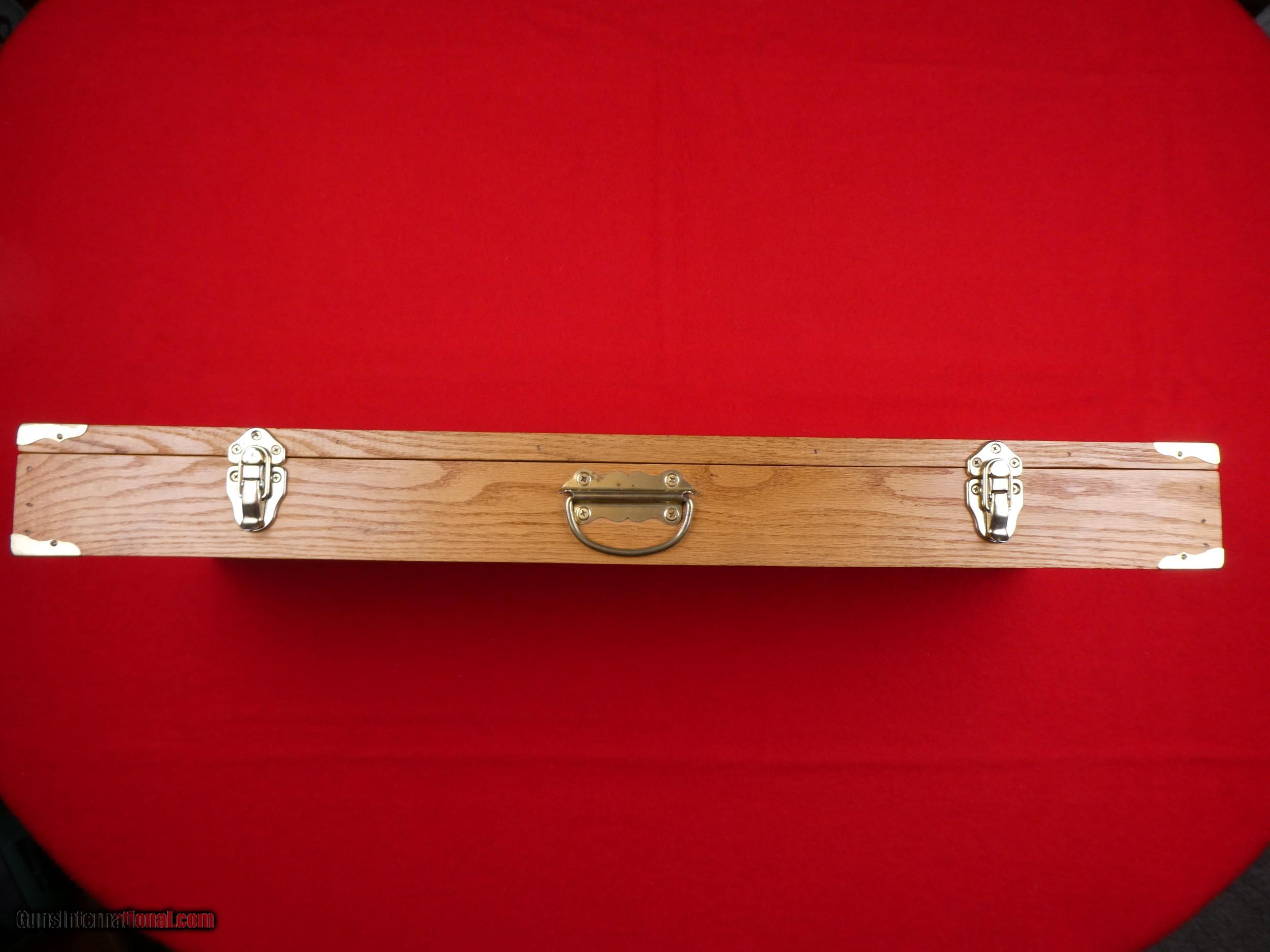 Description: ****SOLD**** Solid Oak Handmade shotgun or rifle box. Beautifully made by someone that knew what they were doing. Was made for a over under shotgun but would work for a take down rifle also. Foam lined and covered with red velvet. Measures 31" X 11" x 3 1/2" , Brass hardware. Very nice and well made. SOLD |