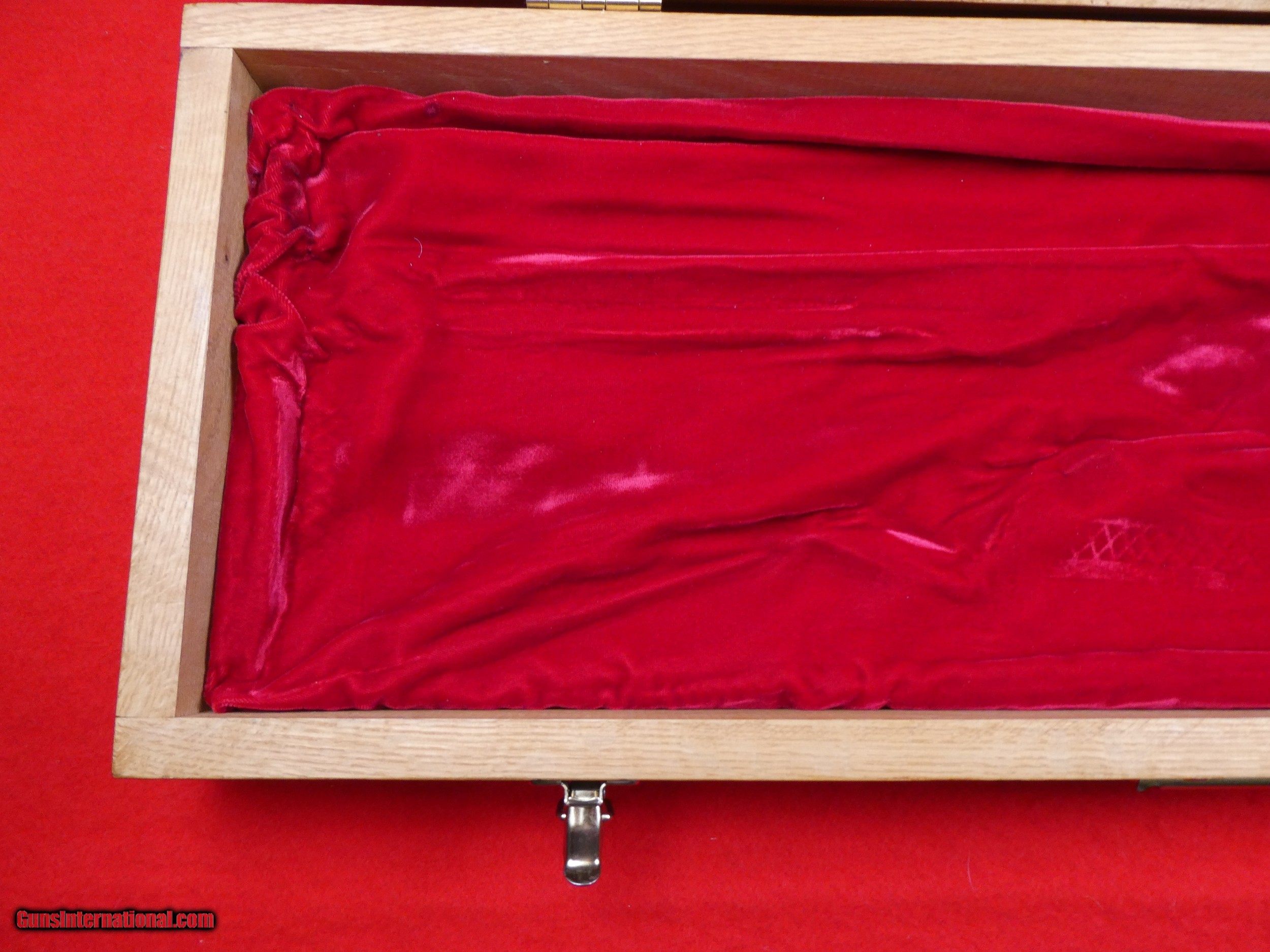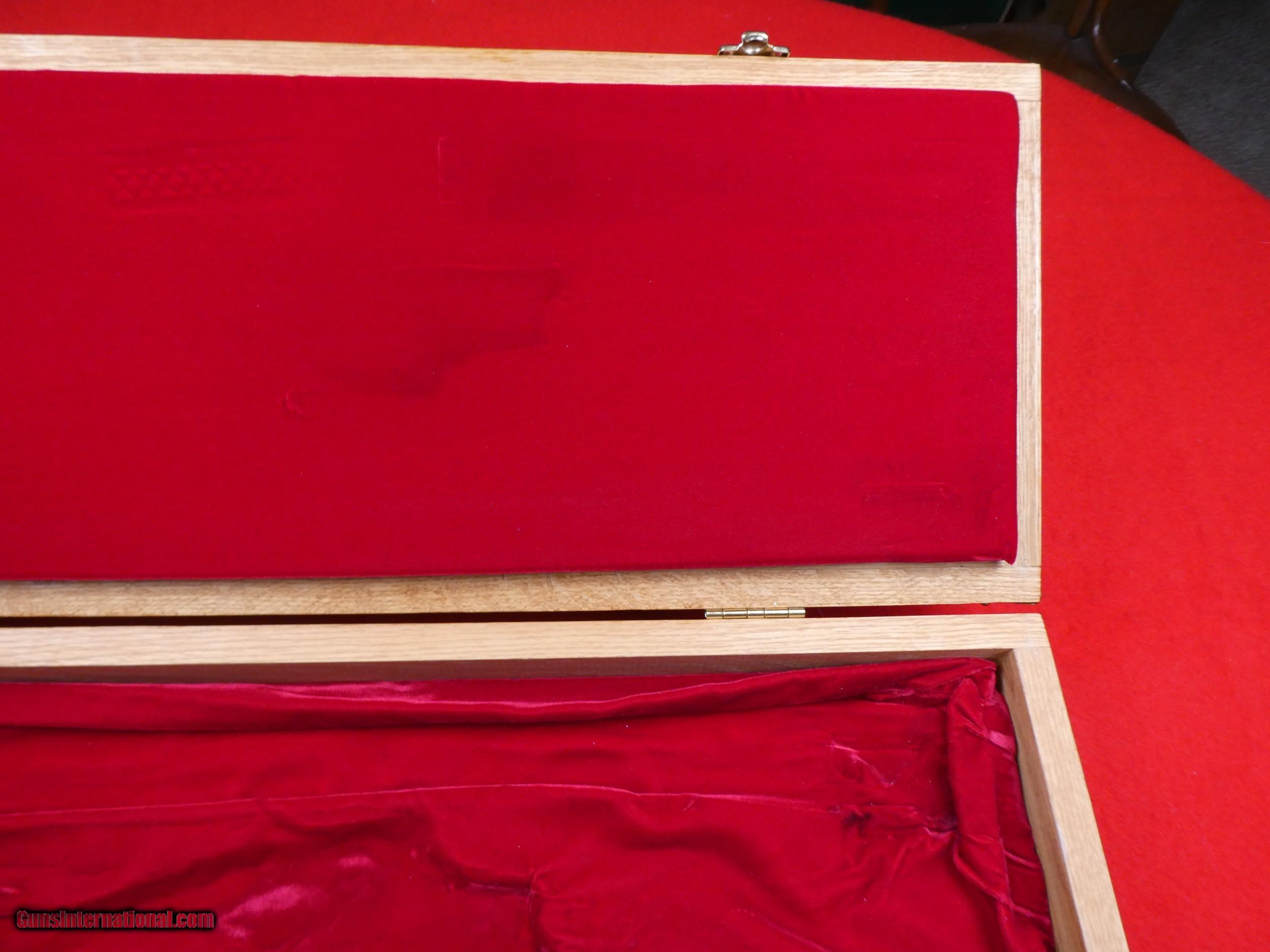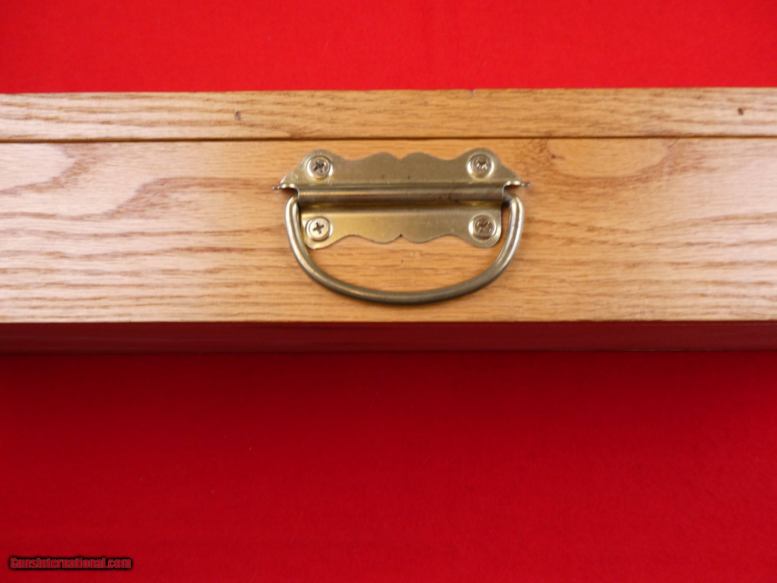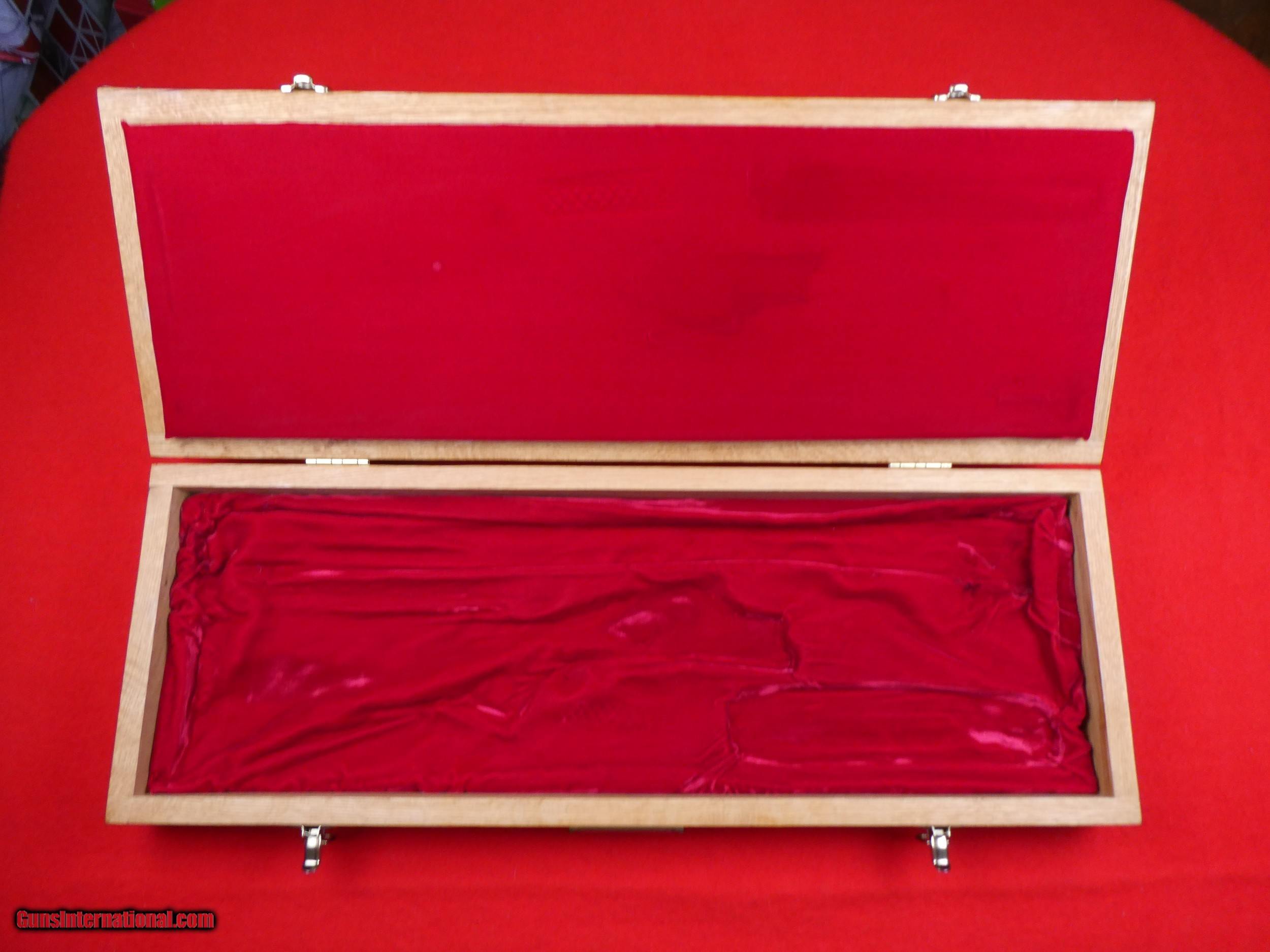 Description: ****SOLD**** Solid Oak Handmade shotgun or rifle box. Beautifully made by someone that knew what they were doing. Was made for a over under shotgun but would work for a take down rifle also. Foam lined and covered with red velvet. Measures 31" X 11" x 3 1/2" , Brass hardware. Very nice and well made. SOLD |