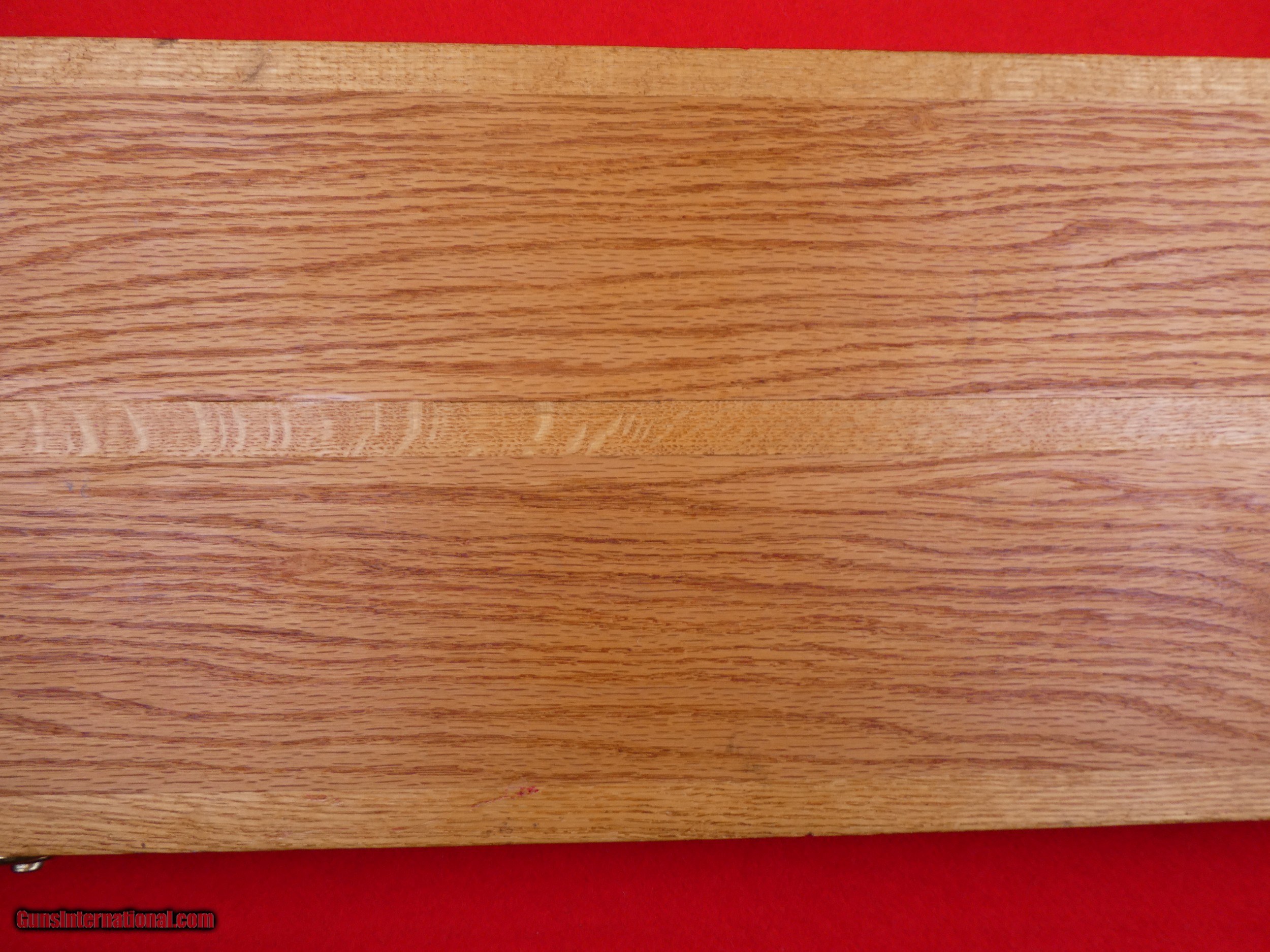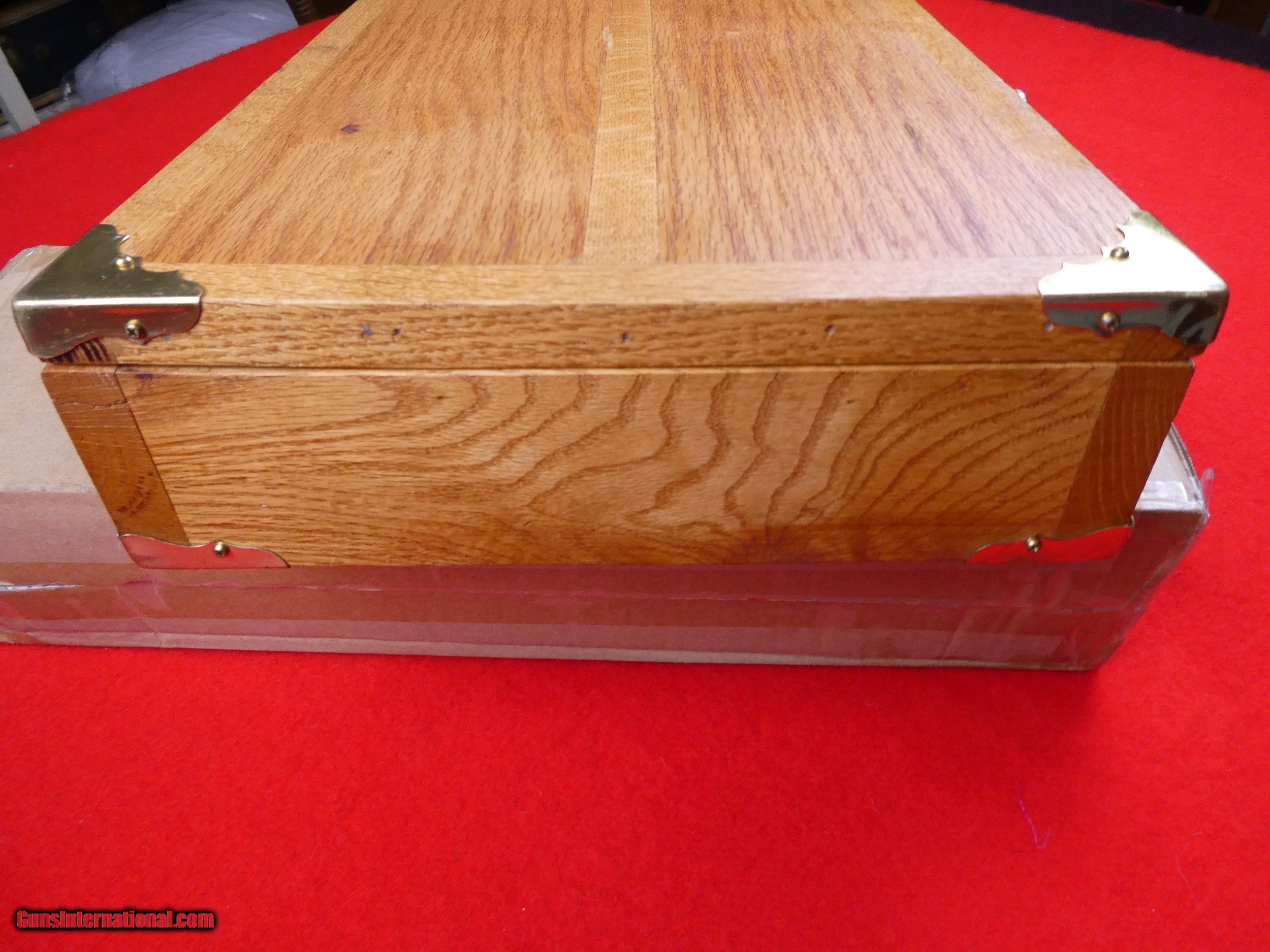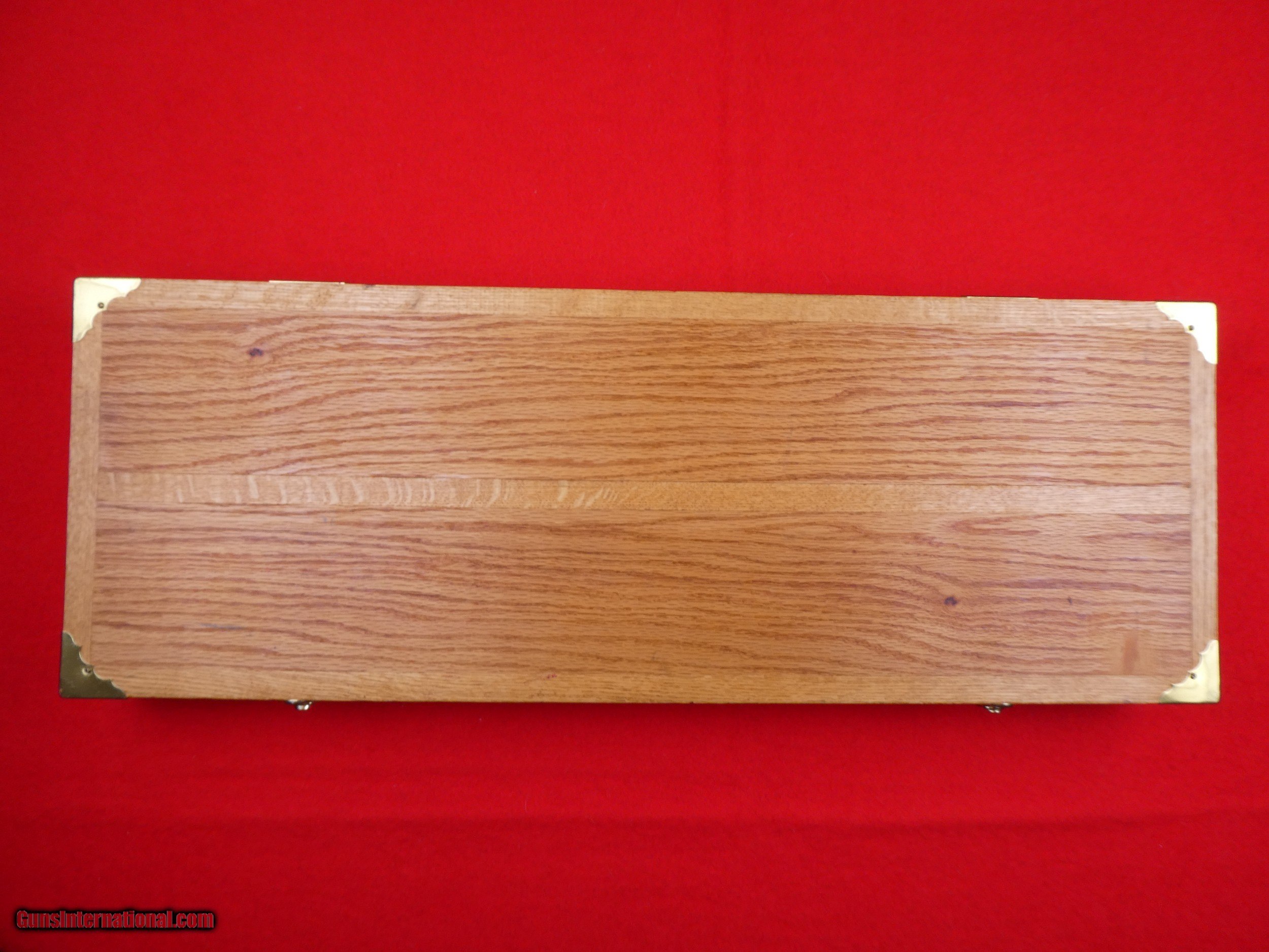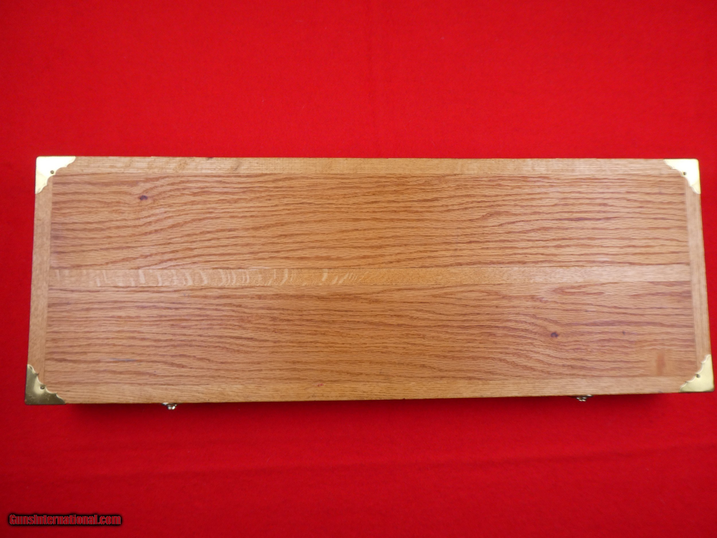 Description: ****SOLD**** Solid Oak Handmade shotgun or rifle box. Beautifully made by someone that knew what they were doing. Was made for a over under shotgun but would work for a take down rifle also. Foam lined and covered with red velvet. Measures 31" X 11" x 3 1/2" , Brass hardware. Very nice and well made. SOLD |