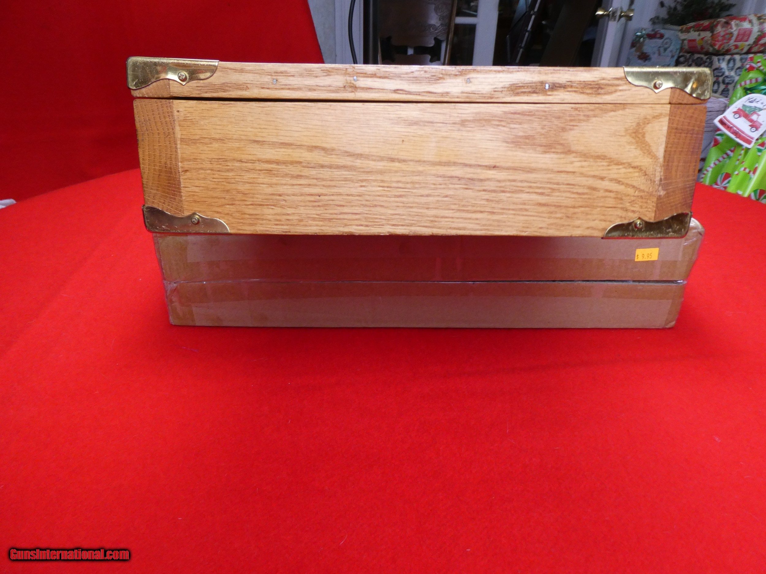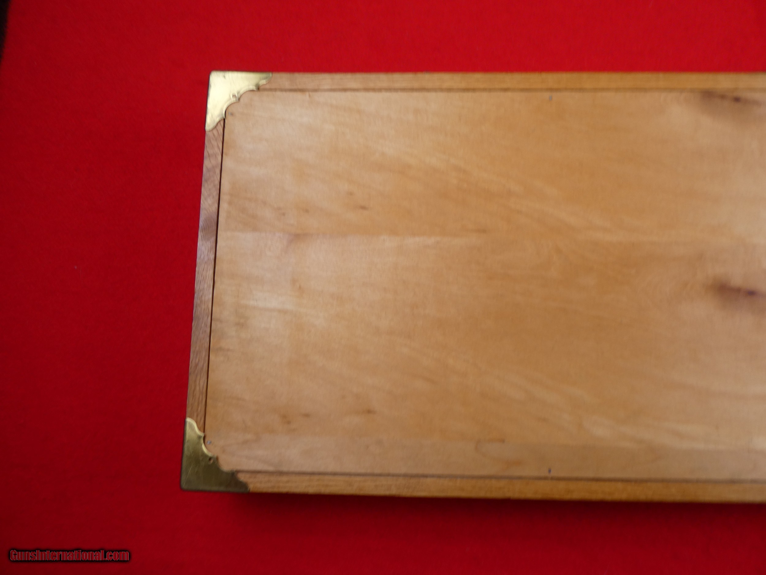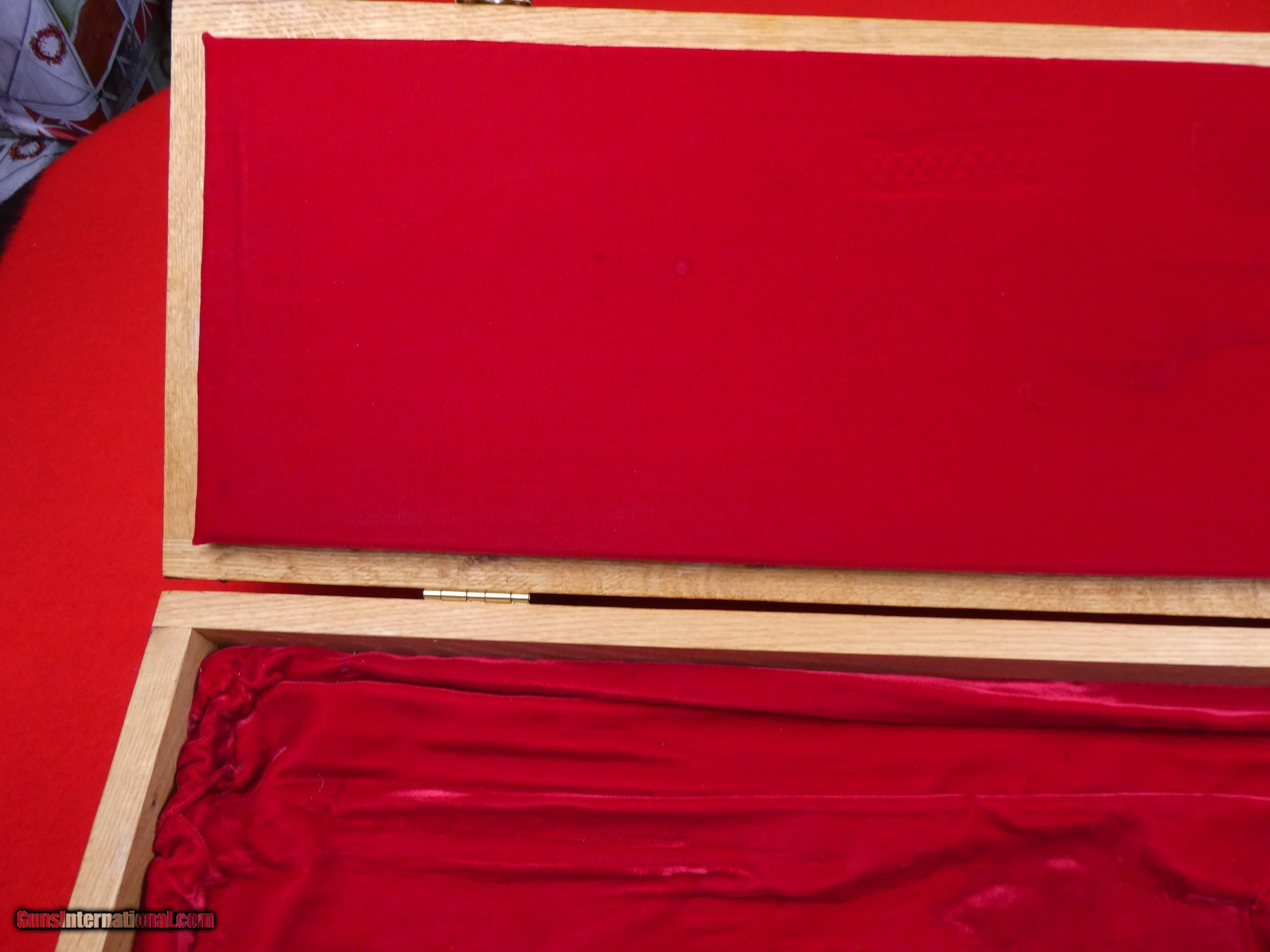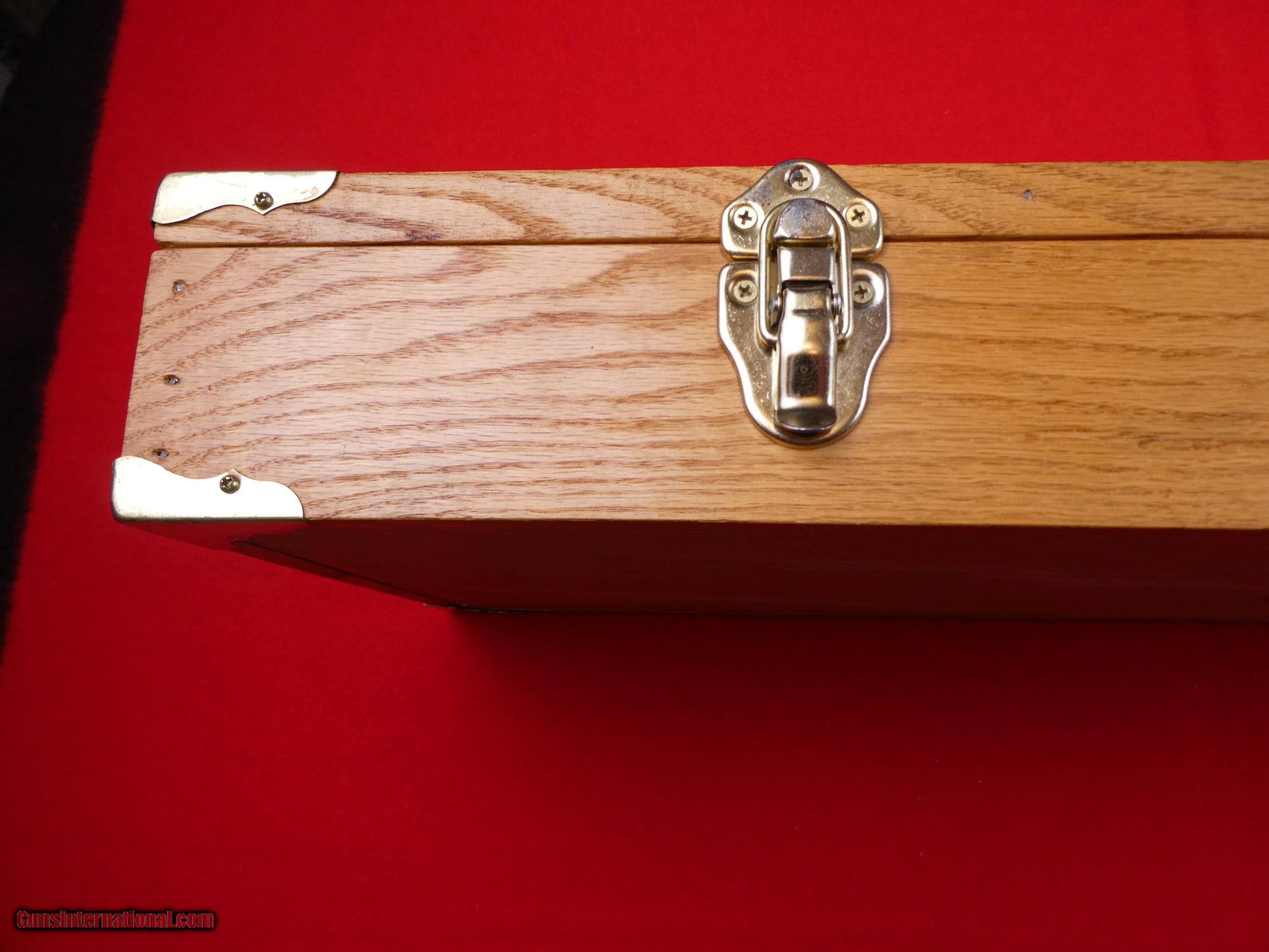 Description: ****SOLD**** Solid Oak Handmade shotgun or rifle box. Beautifully made by someone that knew what they were doing. Was made for a over under shotgun but would work for a take down rifle also. Foam lined and covered with red velvet. Measures 31" X 11" x 3 1/2" , Brass hardware. Very nice and well made. SOLD |