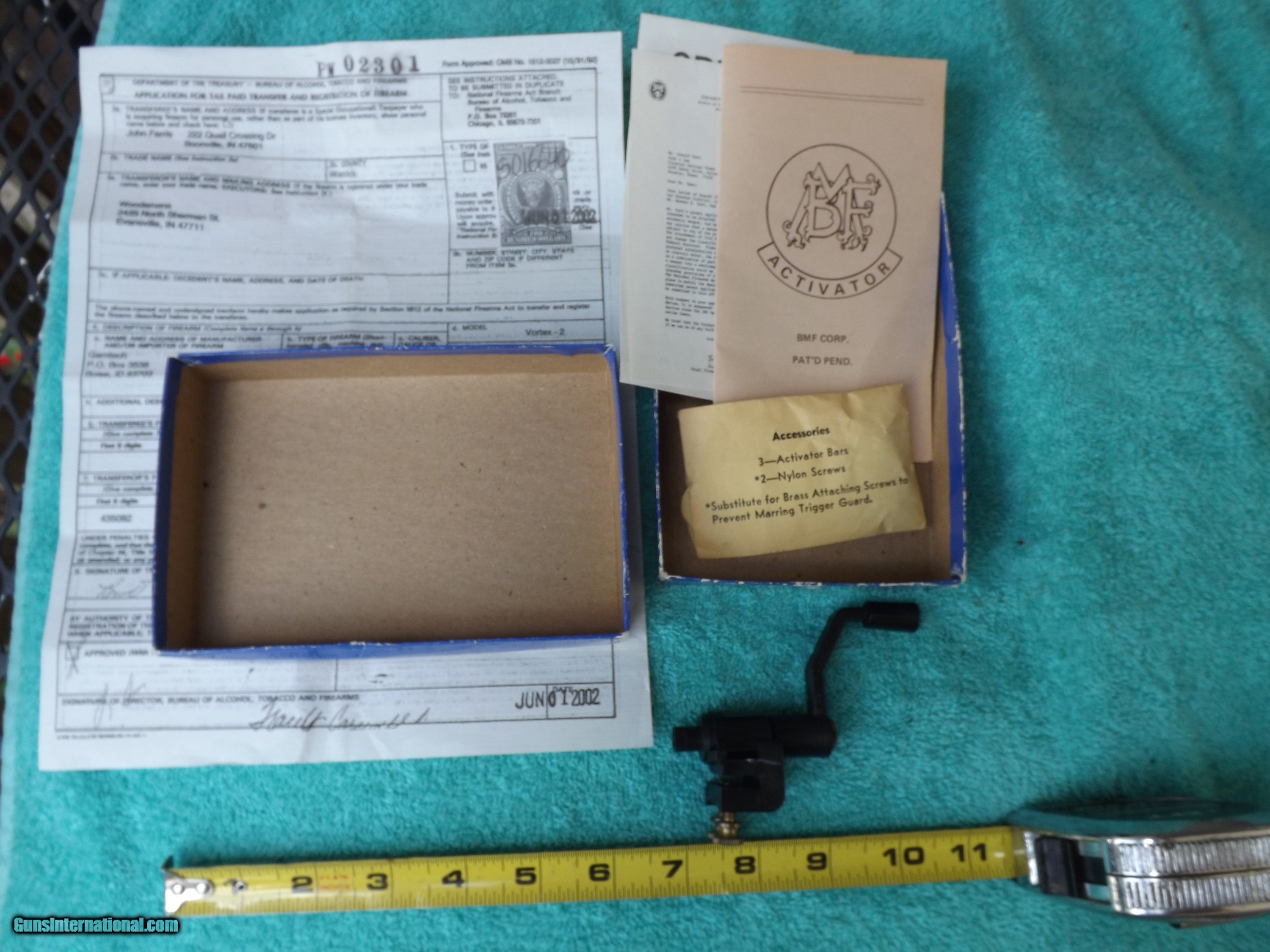 Description: FOR USE WITH RUGER 10/22 RIFLE, CRANK FIRE FOR FAST SHOOTING. EACH CRANK FIRES THE RIFLE 4 TIMES. ORIGINALLY INTENDED FOR THE RUGER 10-22, ACTIVATOR WILL WORK ON SIMILAR RIFLES WITH THE SAME TRIGGER GUARD THAT ALLOWS ENOUGHT ROOM TO ATTACH THE ACTIVATOR. DOMESTIC USA SALES ONLY. SOLD |