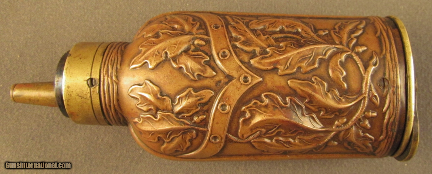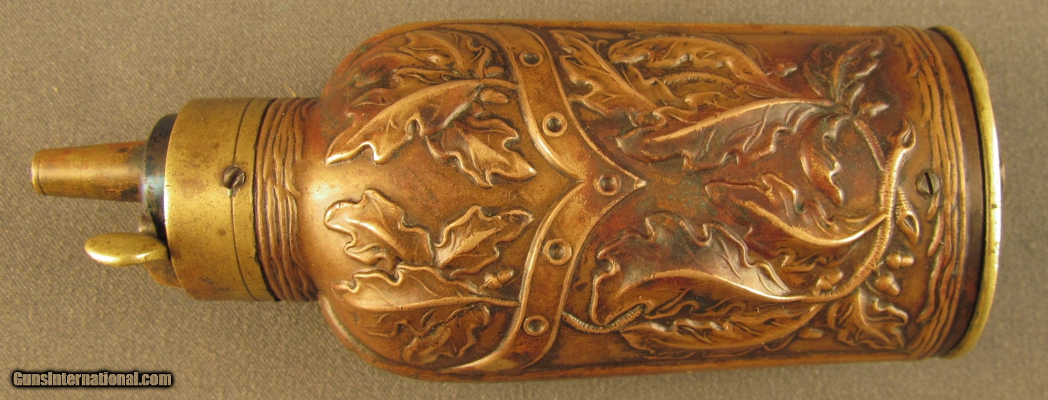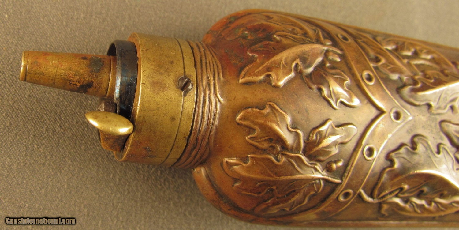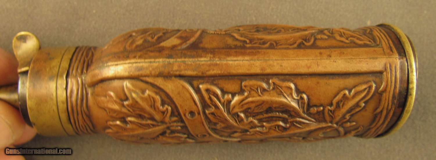 Description: This flask is pictured on page 53 of Riling's flask book with cased pistols and on page 314 as #560. Described as a "double compartment flask decorated with oak leaves and stems divided by a belt like chevron" he also makes reference to the American Flask and Cap Company's catalog with this being the "oak leaf ball and cap charger". This company was formed in 1857 in Waterbury Conn and lasted to circa 1870. Flask has brass common top with fire blued steel spring, brass base and sleeve with copper side panels showing high relief leaves, stems and acorns. These panels show light wear with no dents. Top and insert are held by small iron screws. Copper shows aged patina. Screws show wear from period of use. This is a very fine flask in great uncleaned condition. A super piece for the flask collector. SOLD Manufacturer: Double Compart Model: Flask |