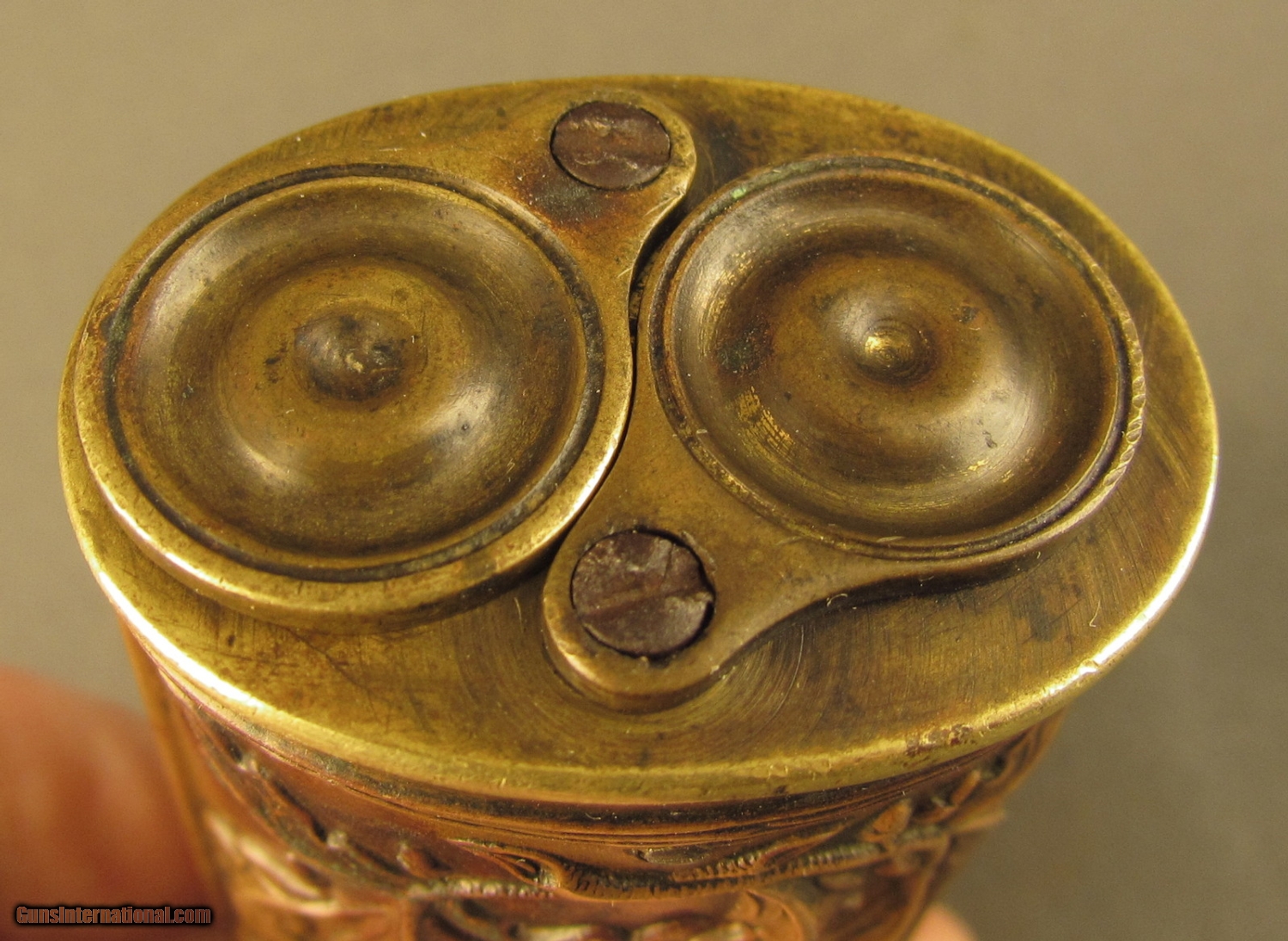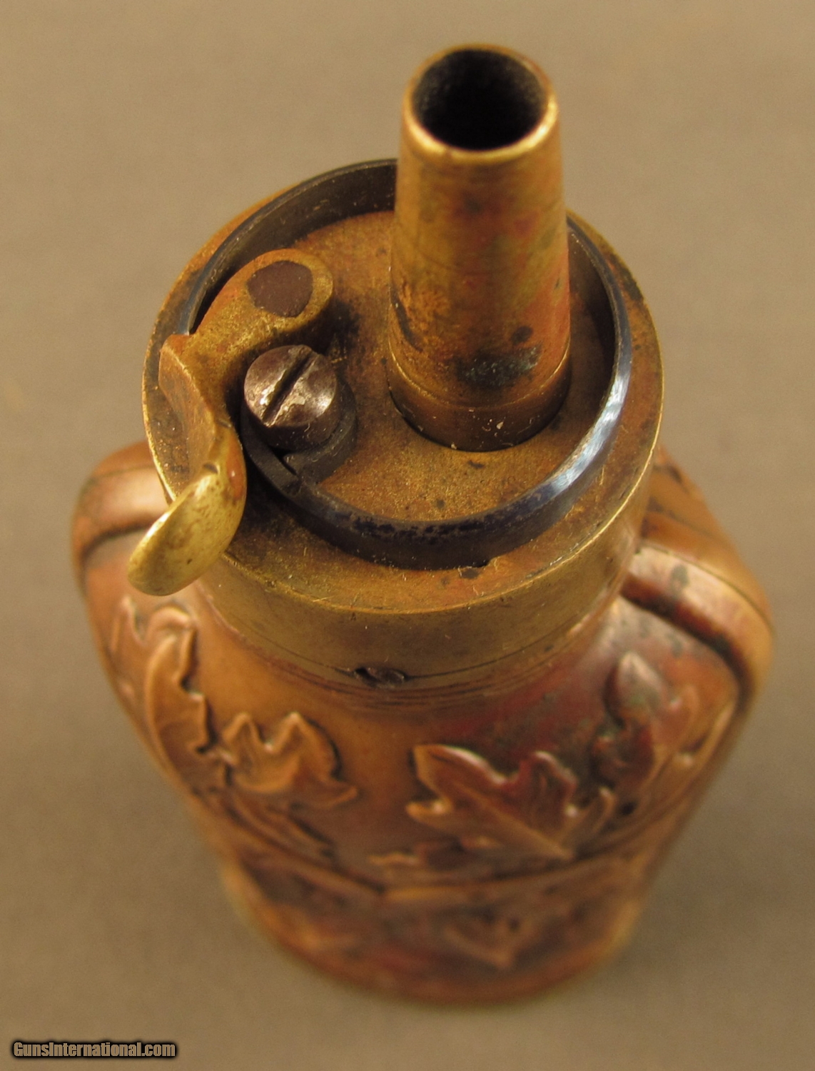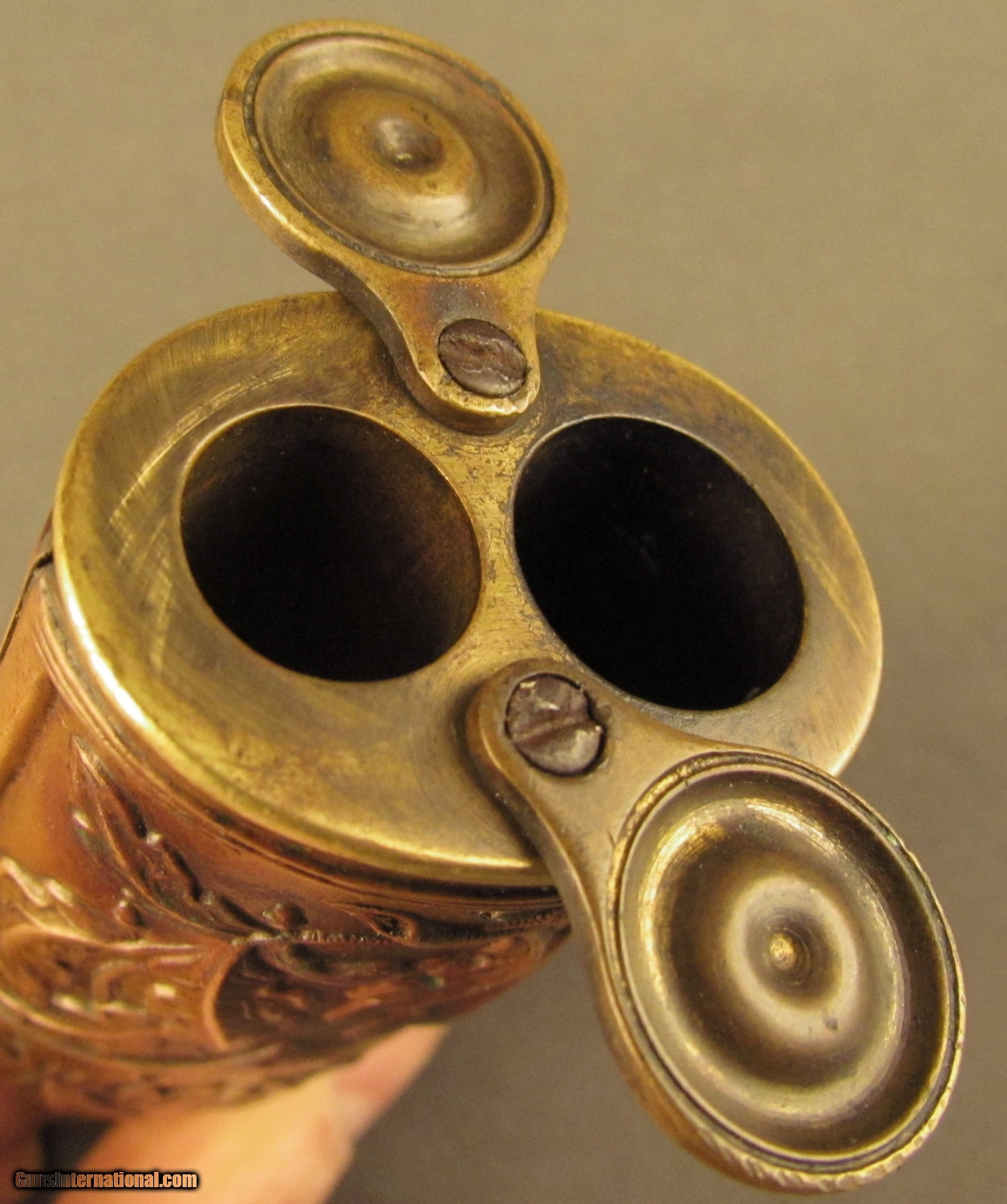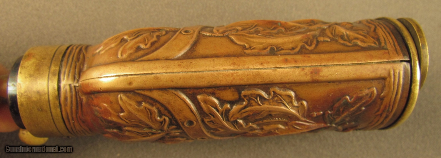 Description: This flask is pictured on page 53 of Riling's flask book with cased pistols and on page 314 as #560. Described as a "double compartment flask decorated with oak leaves and stems divided by a belt like chevron" he also makes reference to the American Flask and Cap Company's catalog with this being the "oak leaf ball and cap charger". This company was formed in 1857 in Waterbury Conn and lasted to circa 1870. Flask has brass common top with fire blued steel spring, brass base and sleeve with copper side panels showing high relief leaves, stems and acorns. These panels show light wear with no dents. Top and insert are held by small iron screws. Copper shows aged patina. Screws show wear from period of use. This is a very fine flask in great uncleaned condition. A super piece for the flask collector. SOLD Manufacturer: Double Compart Model: Flask |