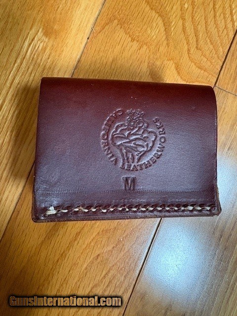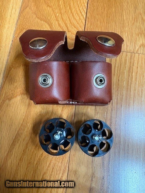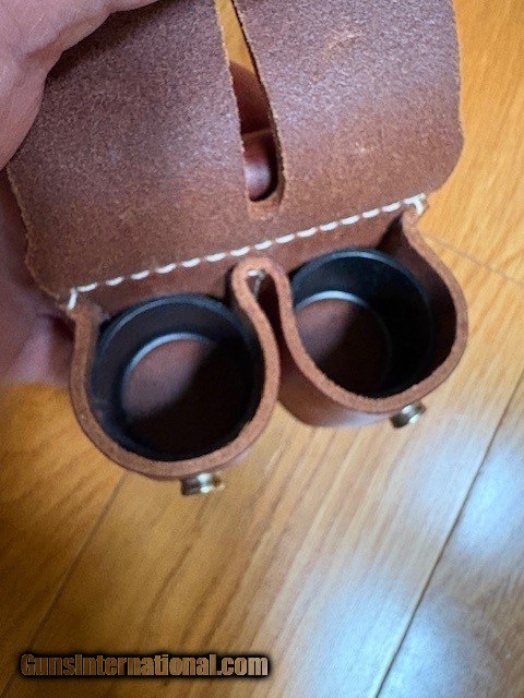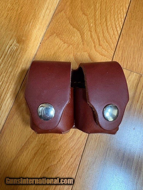 Description: New custom made belt slide leather speedloader cases with 2 new HKS-PY Speedloaders included. Buyer pays shipping of $4 and I pay any charged amount over $4. NOTE: See my other ad for the new GALCO leather revolver holster. Buy the holster for the asking price AND this speedloader package and get 20% off this ad. SOLD |