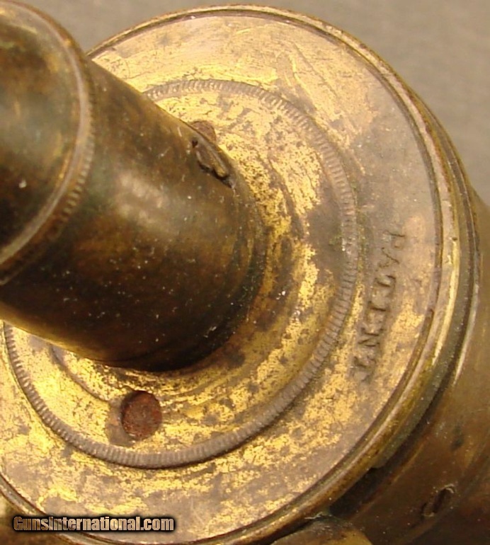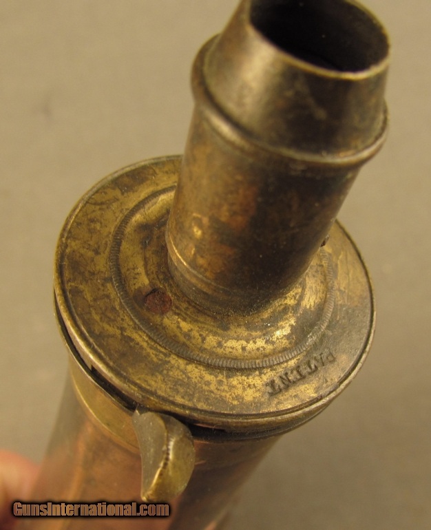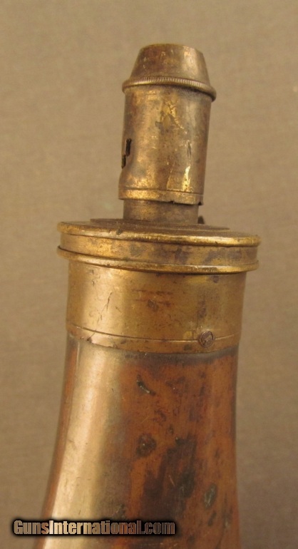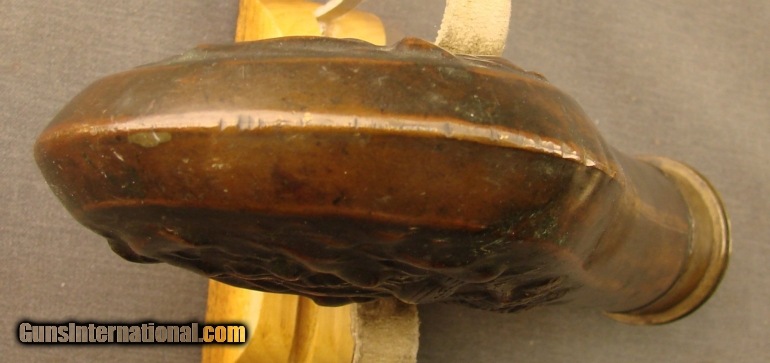 Description: An 8" Long flask of heavy quality with no carry loops. The adjustable spout has 3 positions. The top has an internal spring and is marked "Patent". the design shows 2 long billed birds (Woodcock ??) in a foliage scene. Tight seems with some slight edge dents. See Riling #713 an uncleaned untouched piece. Antique. SOLD Manufacturer: Powder Model: Flask |
