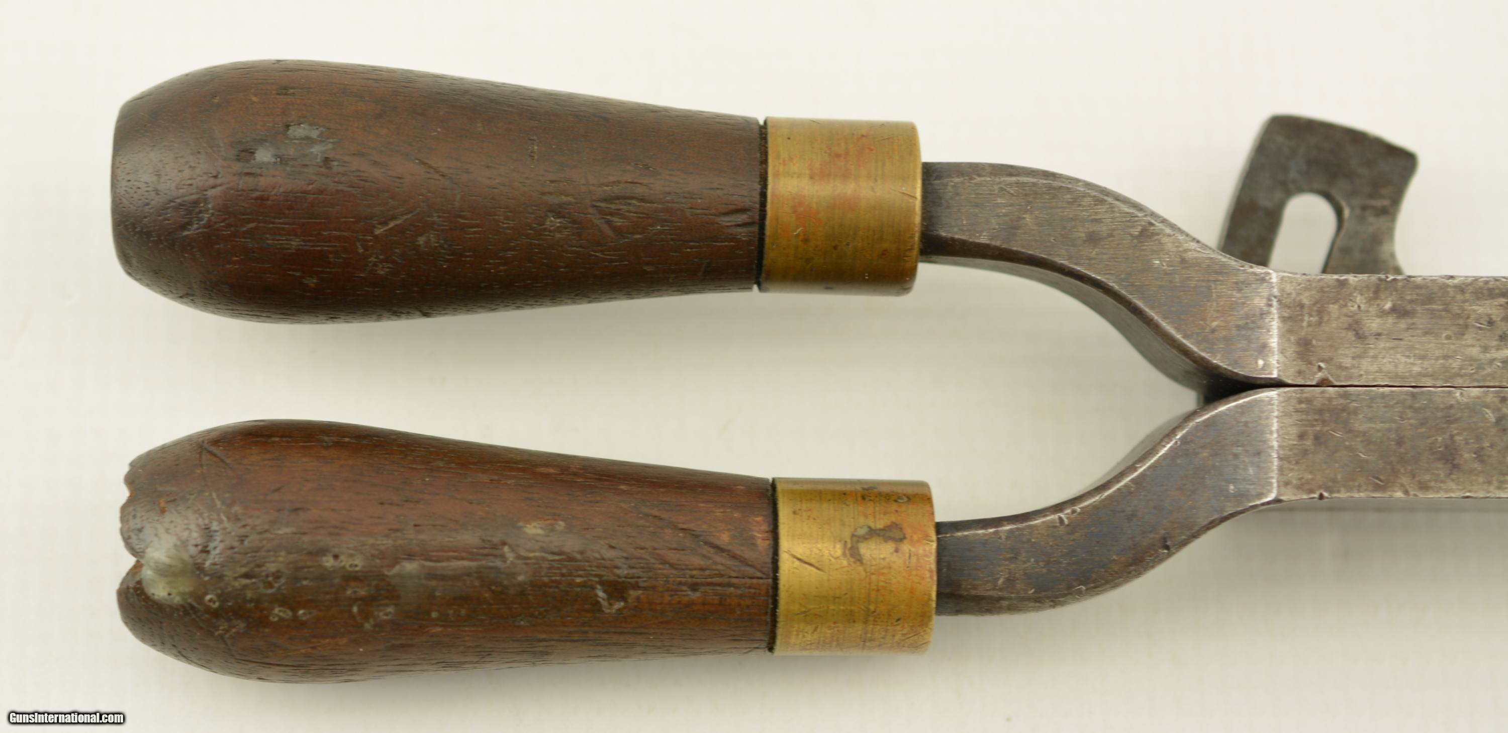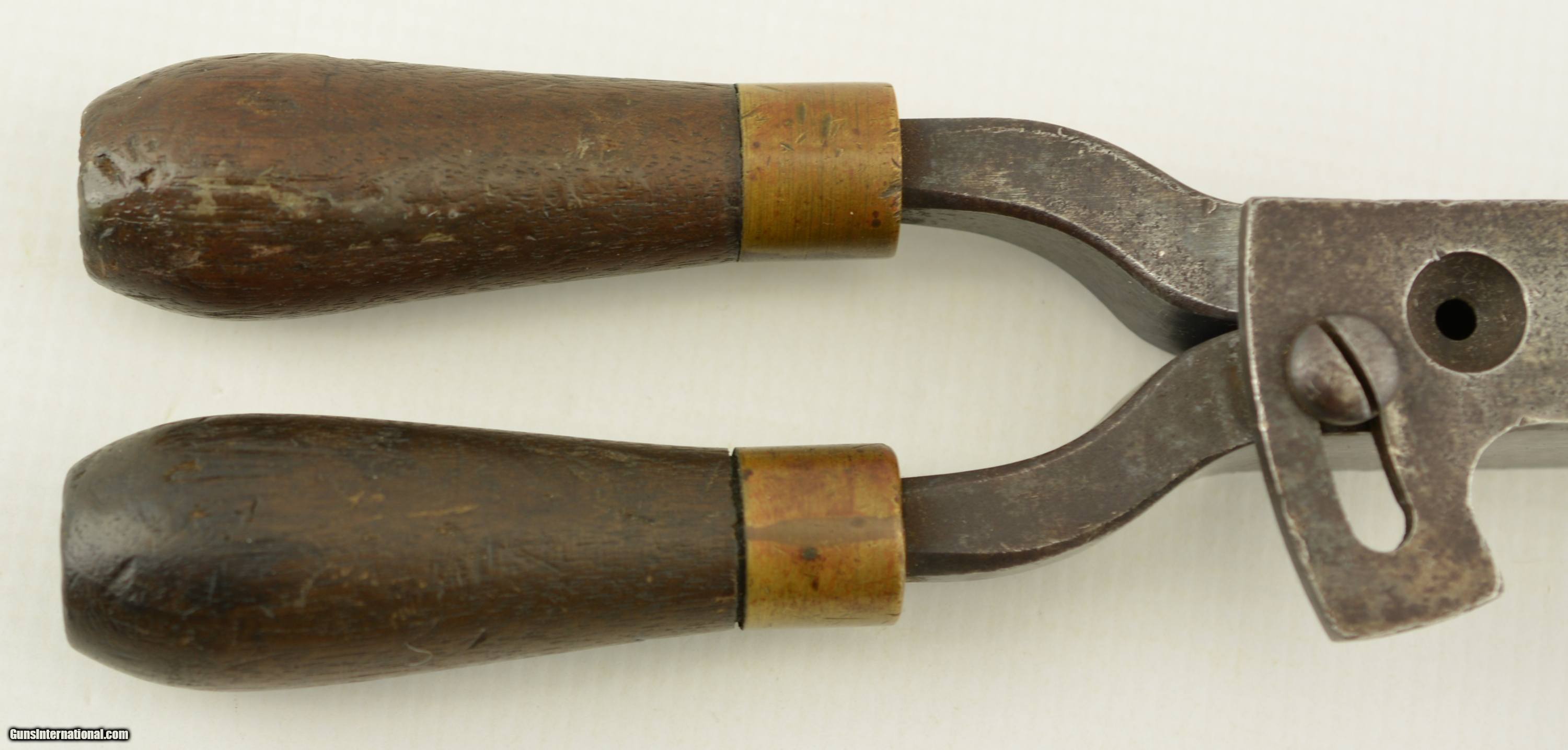 Description: Colt mold .64 cal. This piece is marked "Colts Patent" on the sprue cutter, with some light pitting. The iron retains 50% of its grey-blue original finish. The interior retains most of its original blue and appears to have had little use. The handles are all original with the brass ferrule, the ends are counter sunk but the wood plug on the left is missing and there is a glued repair. There are a few gash marks on the left side of the mold and the top end of the cutter. A very scarce mold for the .64 Caliber Military Rifled musket. See Rapley's book, "Colt Accouterments"pg. 259 #M41. SOLD Manufacturer: Colt Model: Mold Caliber Info: .64 Cal Gauge Info: .64 Cal |