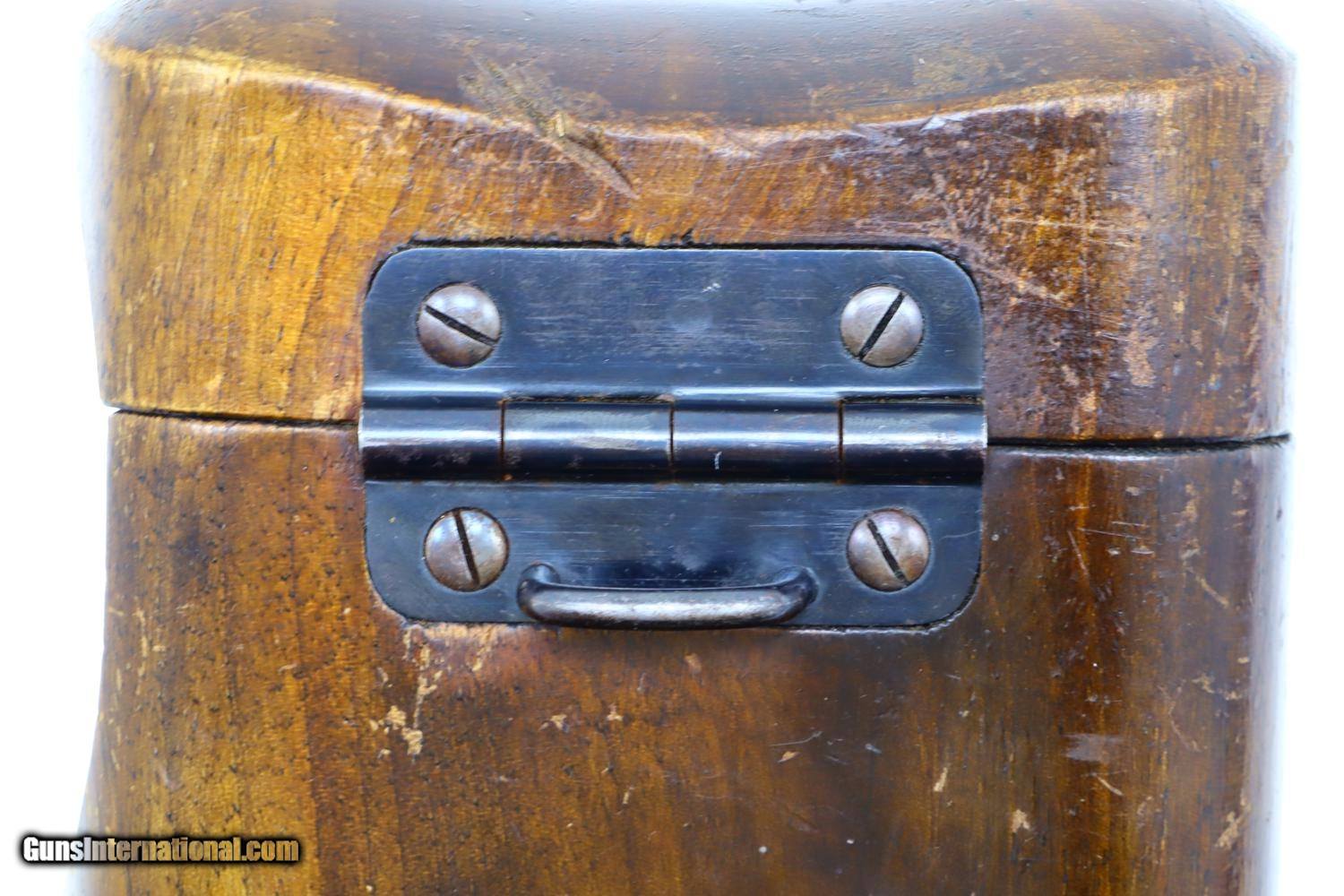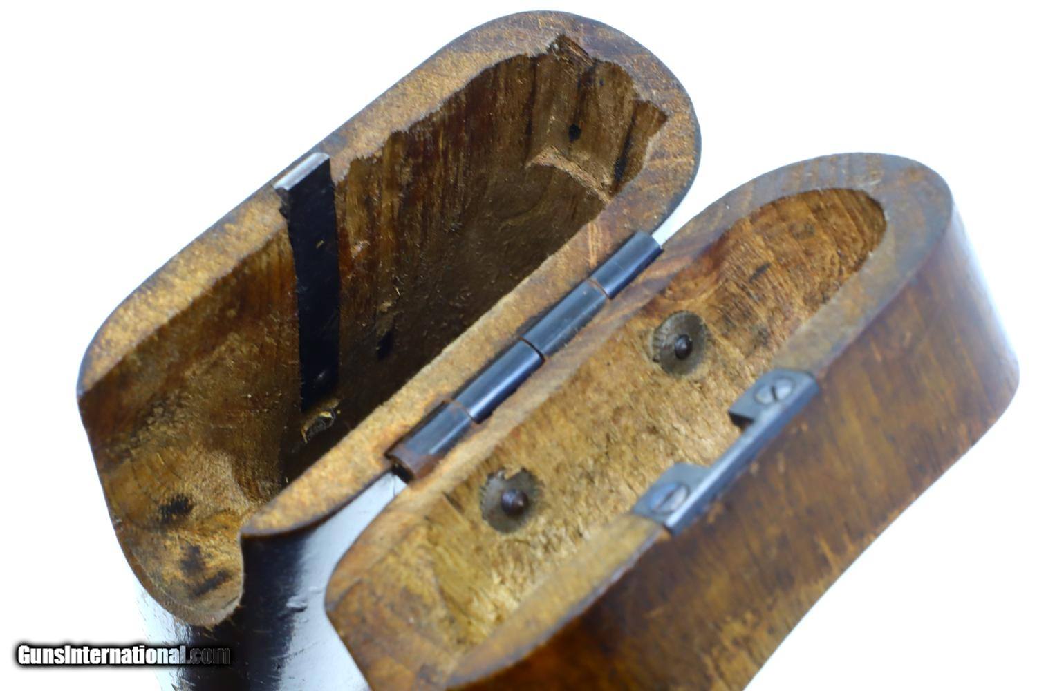 Description: Synopsis: Star M, MD, P, Shoulder Stock, #308, X-259 Description: Exceedingly scarce for the early Star model M, MD, or P pistols, the large framed gun with an arched and slotted palm swell. This example marked with assembly #308. Detailed in the reference text Star Firearms by Leonardo M. Antaris. Condition: VG+ original condition with scattered, noticeable rub marks and handling dings. Original finish hinge and iron in keeping with the overall condition of the stock. Iron likely a period replacement based on the gap between the arms of lug and wood. ~~Insured shipping fee of $35; most packages shipped using FedEx 2nd Day.~~ SOLD Manufacturer: Star Serial Number: 308 |