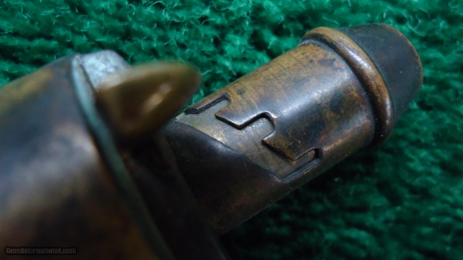 Description: Looks like number 359 in Riling's book, but with 4 eyelets. Dark copper patina with an adjustable charger on a common top. 4 graduations. Flask is 6 3/8" from the bottom of the body to the bottom of the charger. Leroy Merz Antique Firearms specializes in antique and vintage Winchesters and other fine American firearms. Since 1965 Mr. Merz has taken part in the world of firearms and has been a contributor to many well known reference books. Just recently we mailed the 126th edition of our privately-published catalog. We have hundreds of additional guns in every price range at our home online. Search for Merz Antiques in google. SOLD |