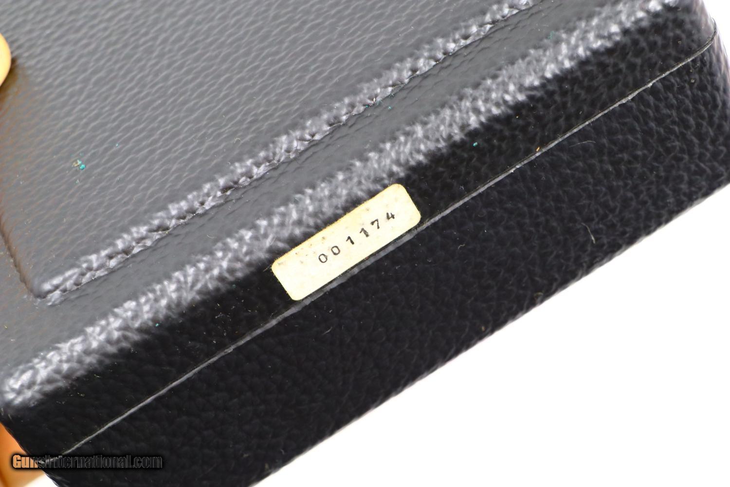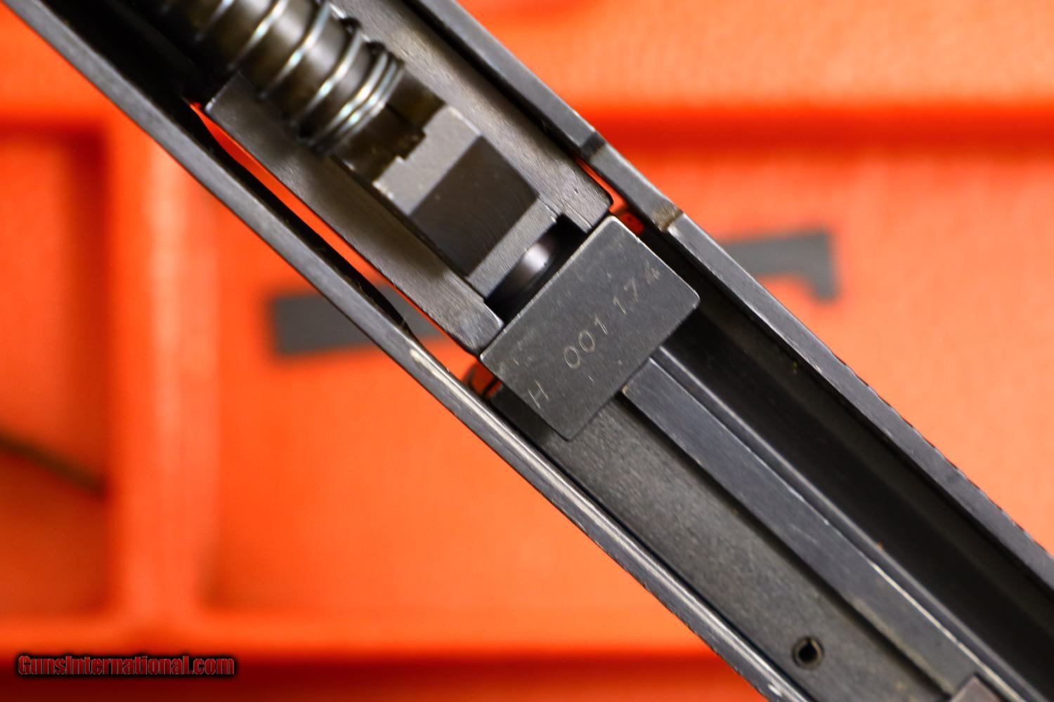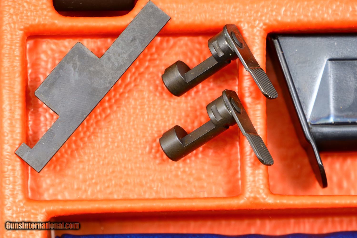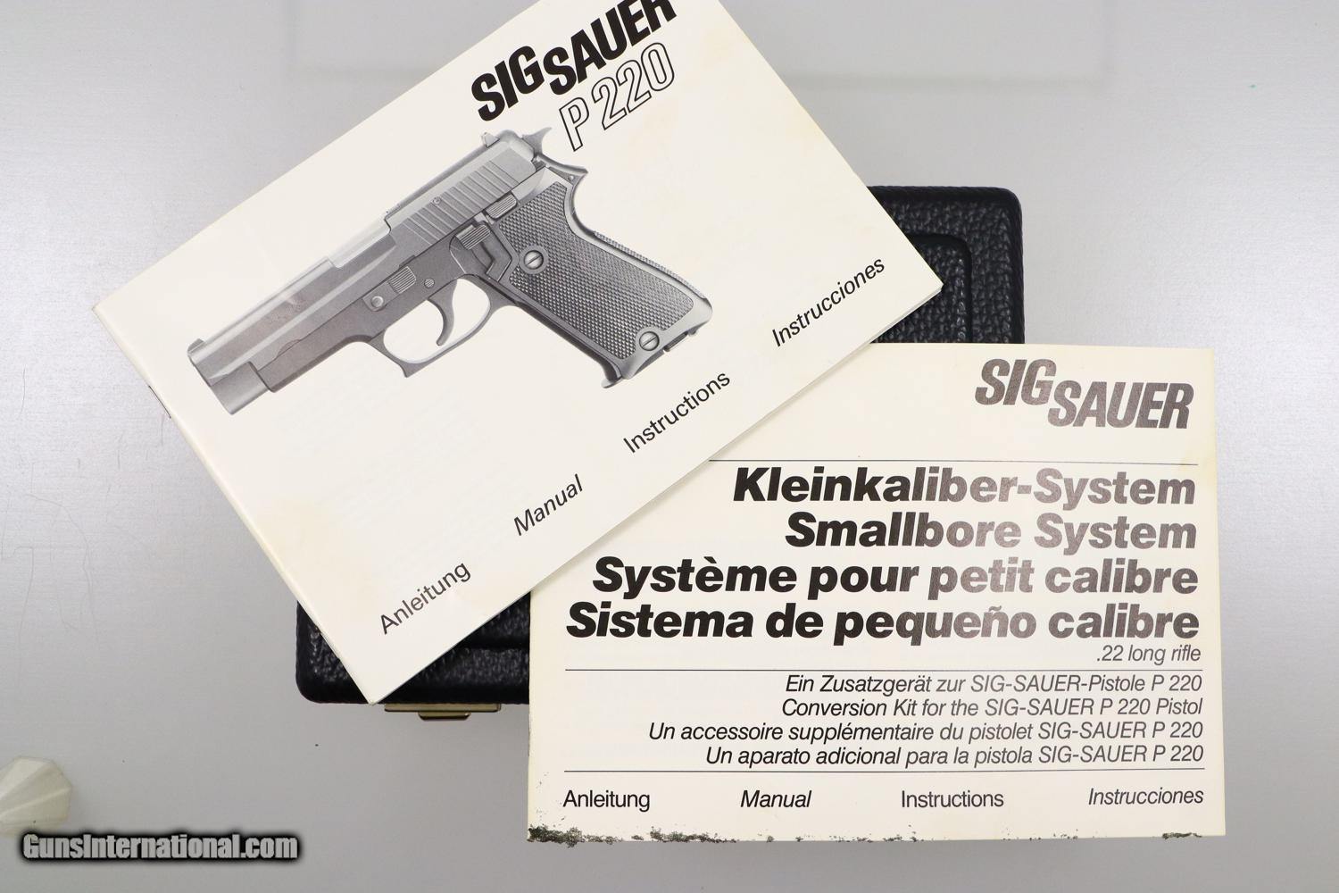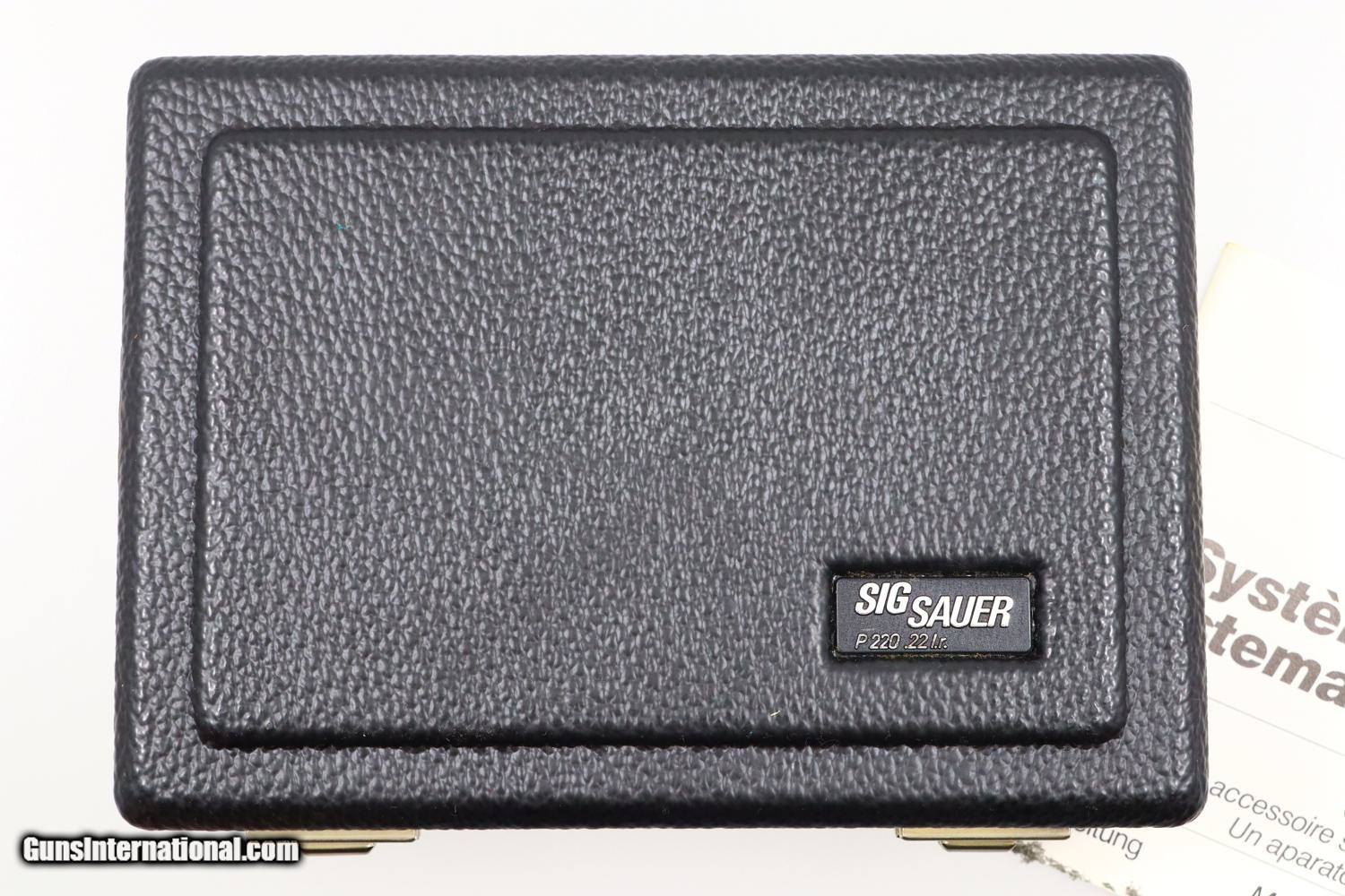 Description: Synopsis: Very Early SIG SAUER, P220, Conversion Kit, H001174, X-303 Description: Very early SIG SAUER, P220, Conversion kit for the .22LR with folded slide and early configuration magazine, similar to what was issued for the P210 pistol. The left side of the slide is marked with the manufacturer while the right side is marked with the serial number and model, the serial number repeated on the bottom of the barrel. This example is in a hinged plastic case with separate compartments for the slide assembly, magazine, a shallow shelf for two dismounting levers/cleaning tool, and a final compartment for a SIG SAUER marked cleaning kit. Under the grey foam lid is an instruction booklet for the conversion kit and a separate instruction book for the SIG SAUER P220. Condition: EXC+. Virtually new excepting the right side of the slide having a few superficial scuff marks. There is no wear on the barrel, on either dismounting lever, or the magazine. These parts present as new. Even the grey foam lining, usually crumbled, is intact. An exceedingly scarce conversion kit for the earliest folded slide SIG SAUER P220 pistols. ~~Insured shipping fee of $35; most packages shipped using FedEx 2nd Day.~~ SOLD Manufacturer: SIG Sauer Serial Number: H001174 Caliber Info: .22LR |