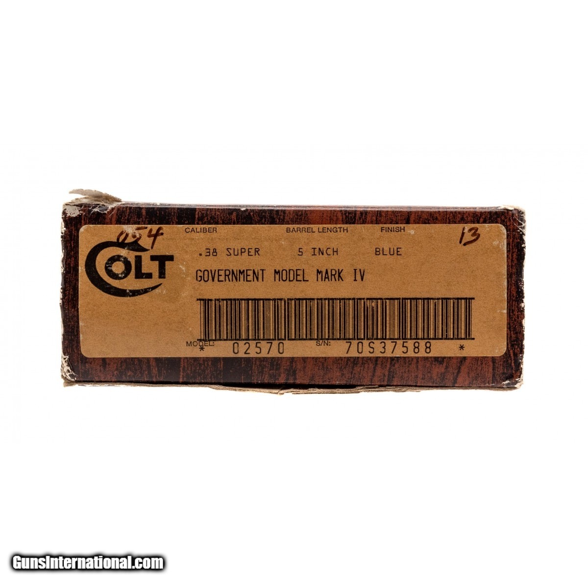 Box for a Colt Government Model MK IV/Series 70 Pistol. This box housed a blue model in .38 super with a 5"" barrel. The dimensions of this box are 10.5L x 2.5W x 6.5H. Has original packaging, instruction manual and box tag. Overall condition is very good.