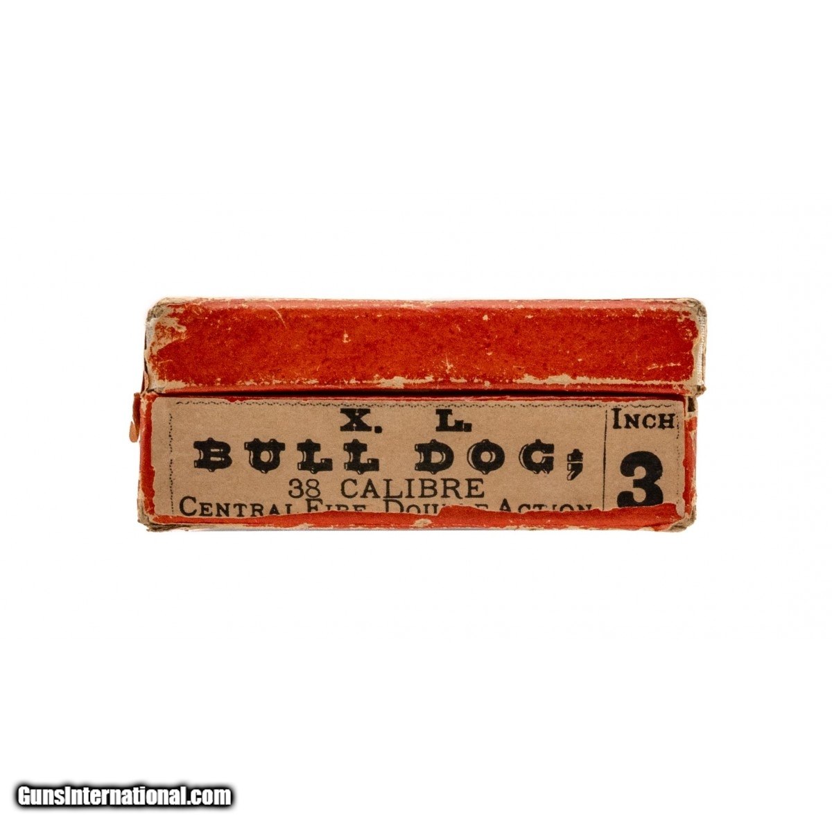 Description: " Hopkins & Allen XL Bull Dog .38Calbre 3"" Box. Overall condition is good with stain on label. SOLD |