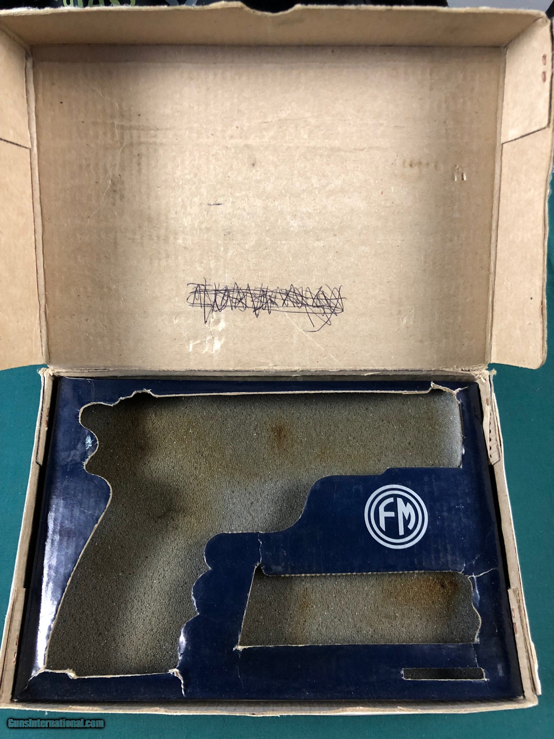 Description: Original Vintage condition, wear on the corners and edges, light stain on the back, pen mark inside top cover. FM logo Fabricaciones Militares "Pistola FM calibre 9x 29mm parabellum; industria Argentina" written on the outside of the box. It has the original FM logo cardboard insert with foam on bottom. The foam has stains. Please e-mail with any questions or more pictures to ms18911909gmail or call my Cell: 912-659-1404. Please see other listings. I can combine shipping on certain items. Terms & Conditions: We will make every possible effort to honestly, accurately and closely describe items including condition, age, virtues, defects and any other pertinent information. Items listed as used/new condition; also may or may not contain unseen flaws and/or imperfections. PLEASE REMEMBER that grading is subjective; some pictures show better than others. PAYPAL payment ok for bayonets and accessories adding 4%. USA ONLY. We only ship to the lower 48 States ( NOT available to Alaska, Hawaii, or Puerto Rico). Shipping USPS priority insured: $16.99 No Returns on firearms/antiques/parts/accessories/books. ALL SELLS ARE FINAL. No refunds based on buyer's inability to receive the gun. Returns/canceled transaction by buyer are subject to a 30% (of the sale) restocking/paperwork fees. SOLD |