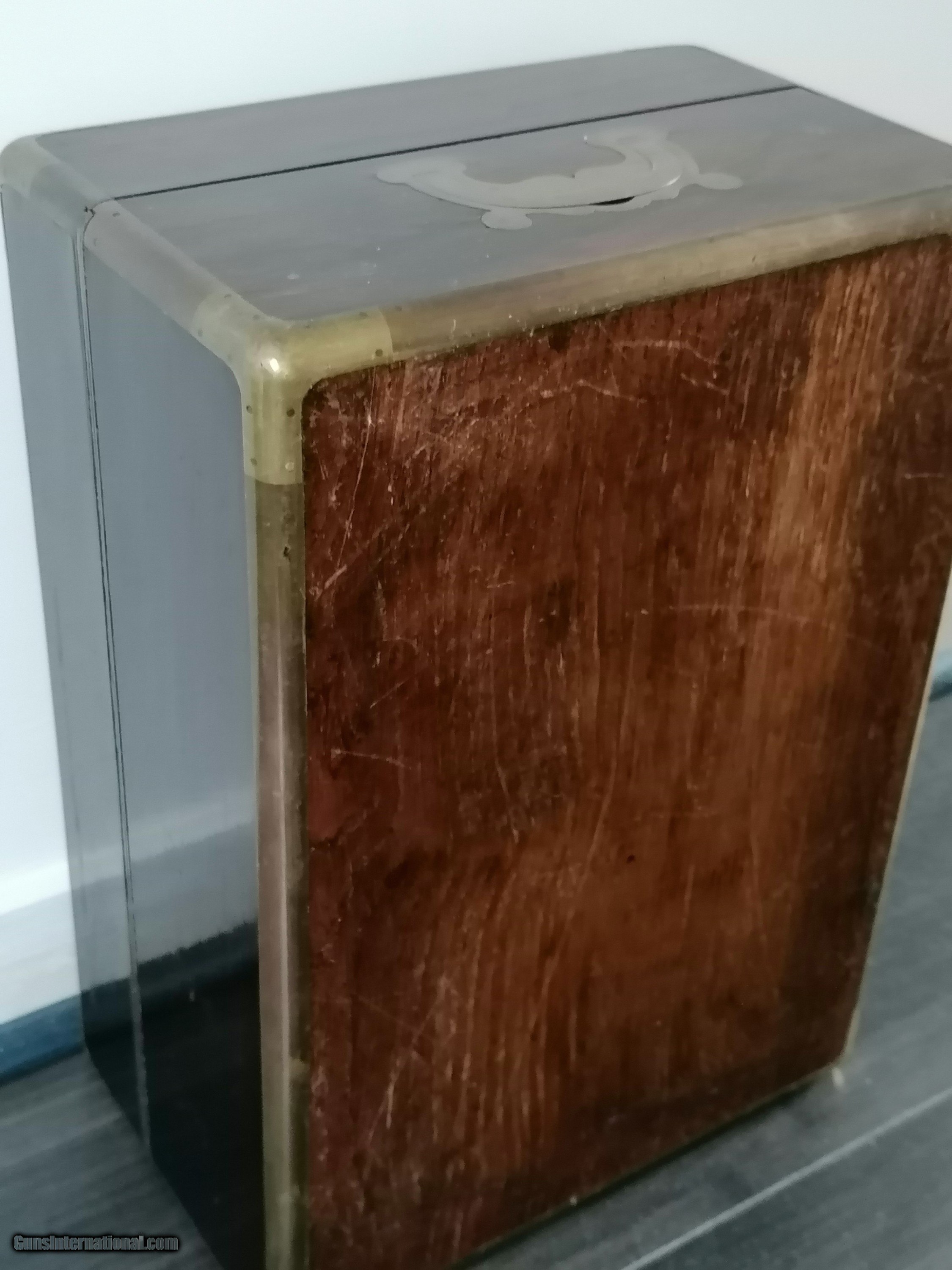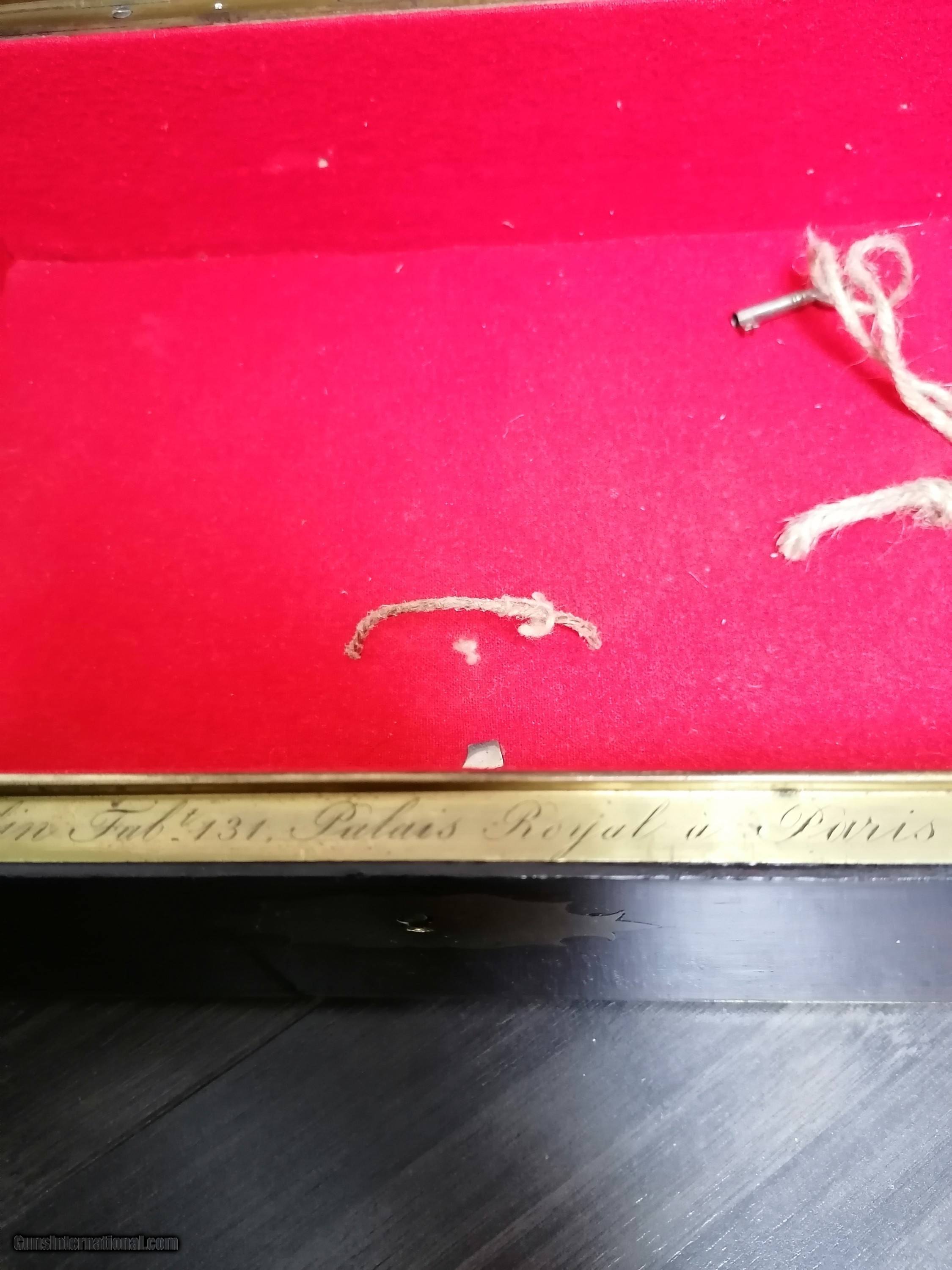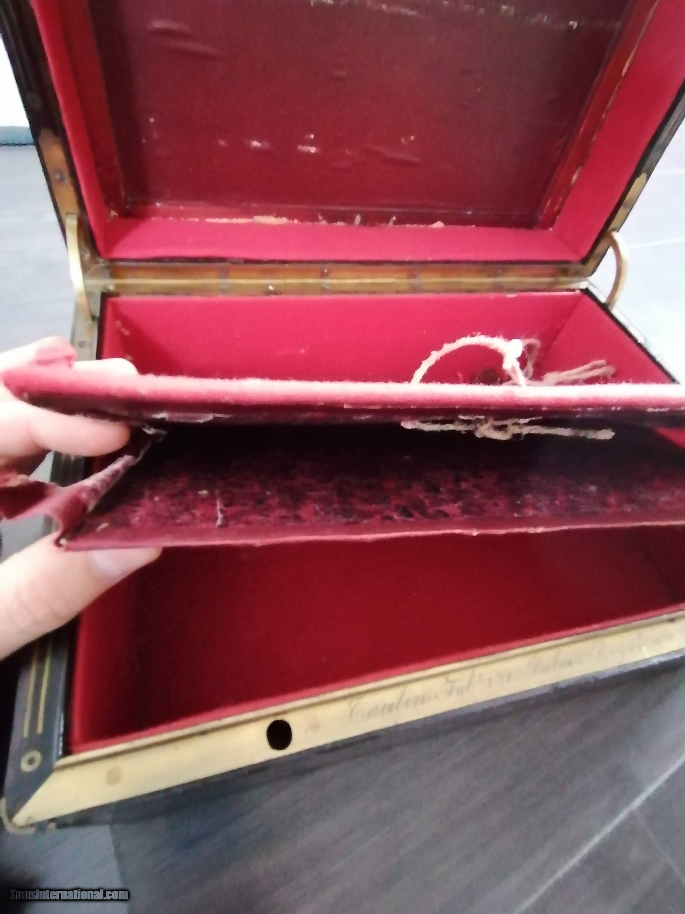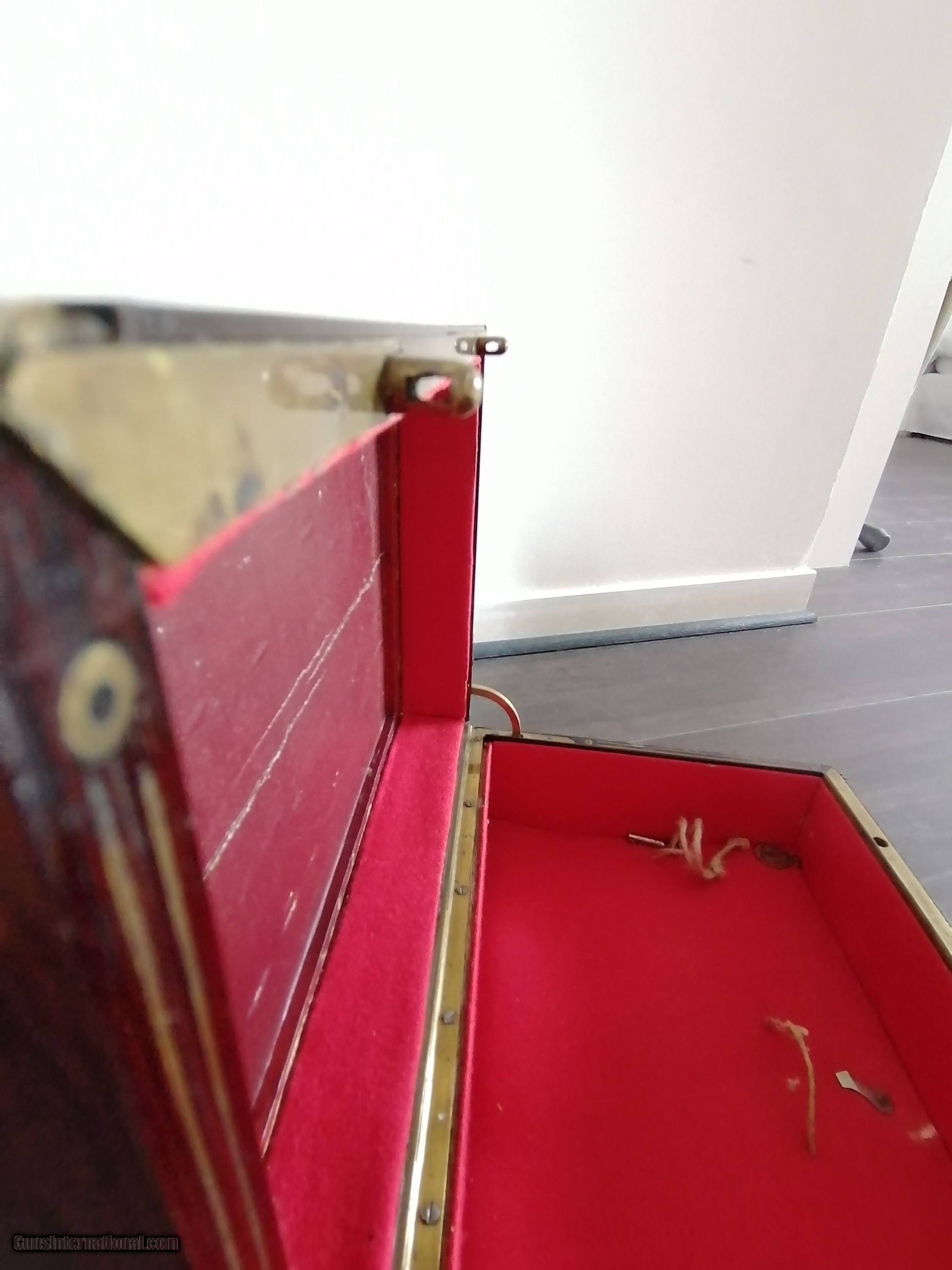 Description: Antique wooden box Napoleon II period with brass and ebony Engraved: Caulin Fab 131 Palais Royal Paris 23 x 32 centimeters Small slot on the top to restore H.R letters engraved Red fedora inside with an hidden pocket in the bottom Small key to lock, it needs oil, but it works Shipping cost from my place to your address in USA costs around 65 USD with a tracking number+insurance, delivery time: 5 to 7 days by FEDEX SOLD |
